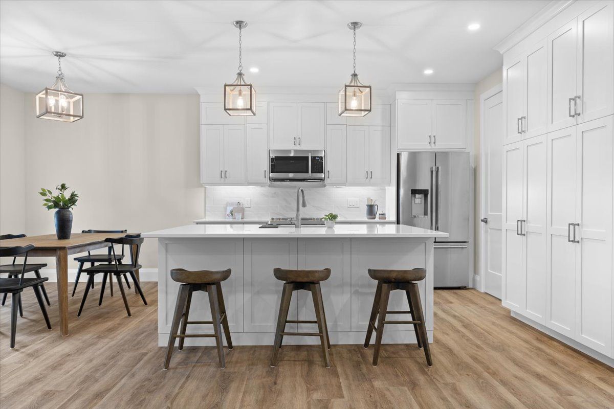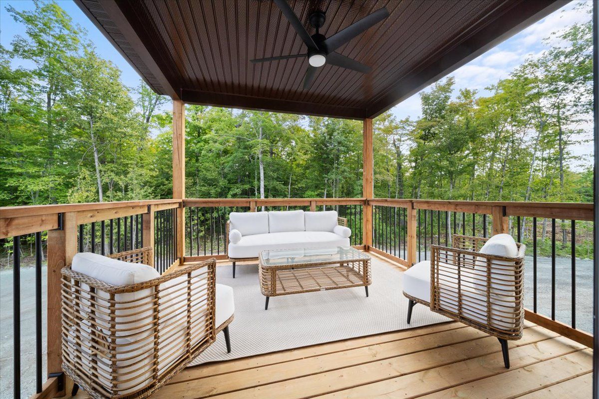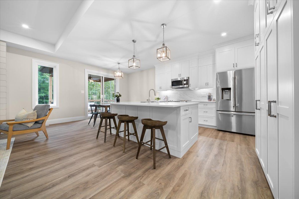 patio door that opens directly onto a fully covered deck. The white kitchen features plentiful storage space