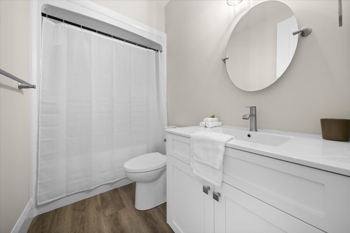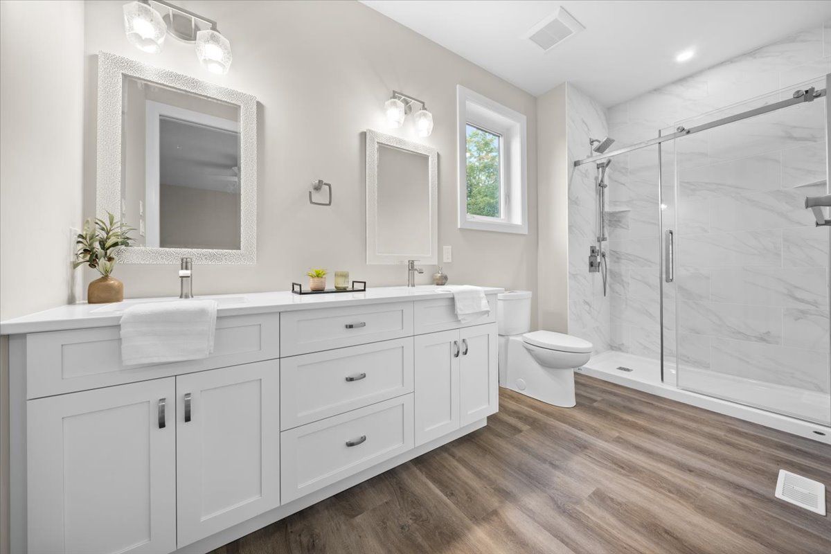 closet and a 4-piece ensuite bathroom with a sliding glass shower door. The main level is completed with