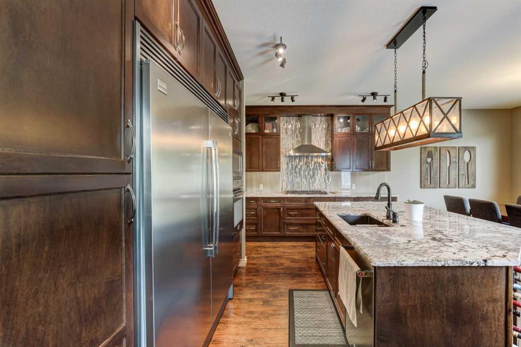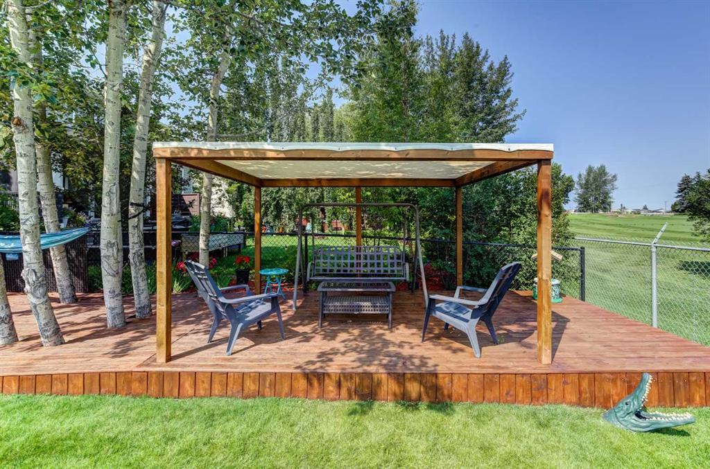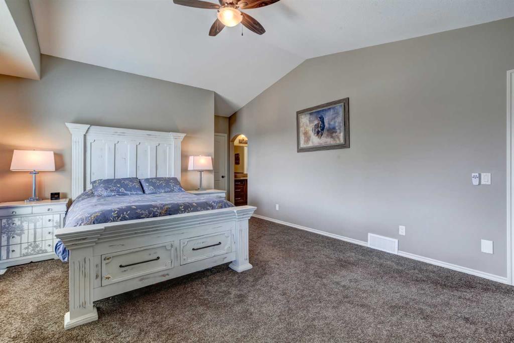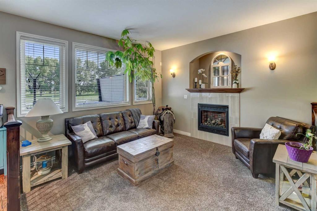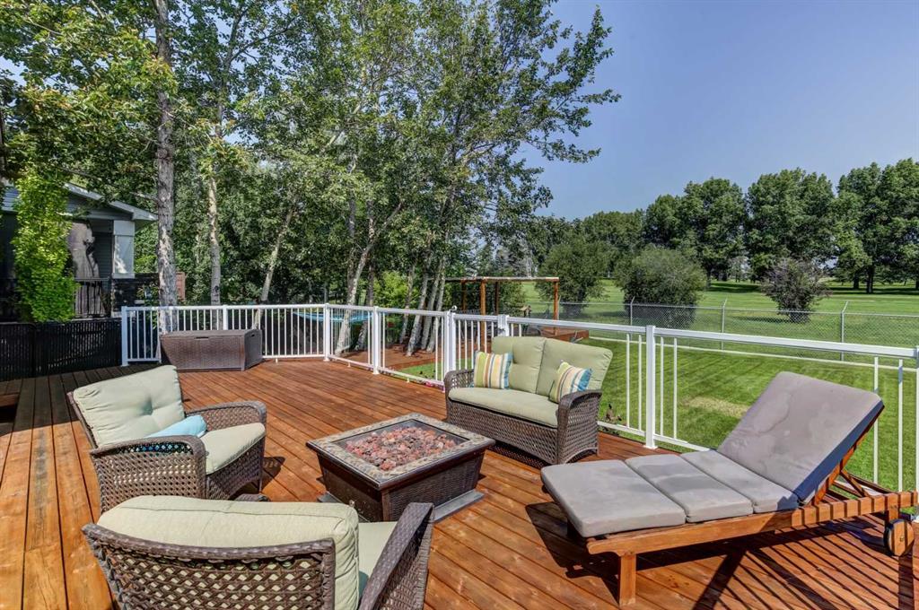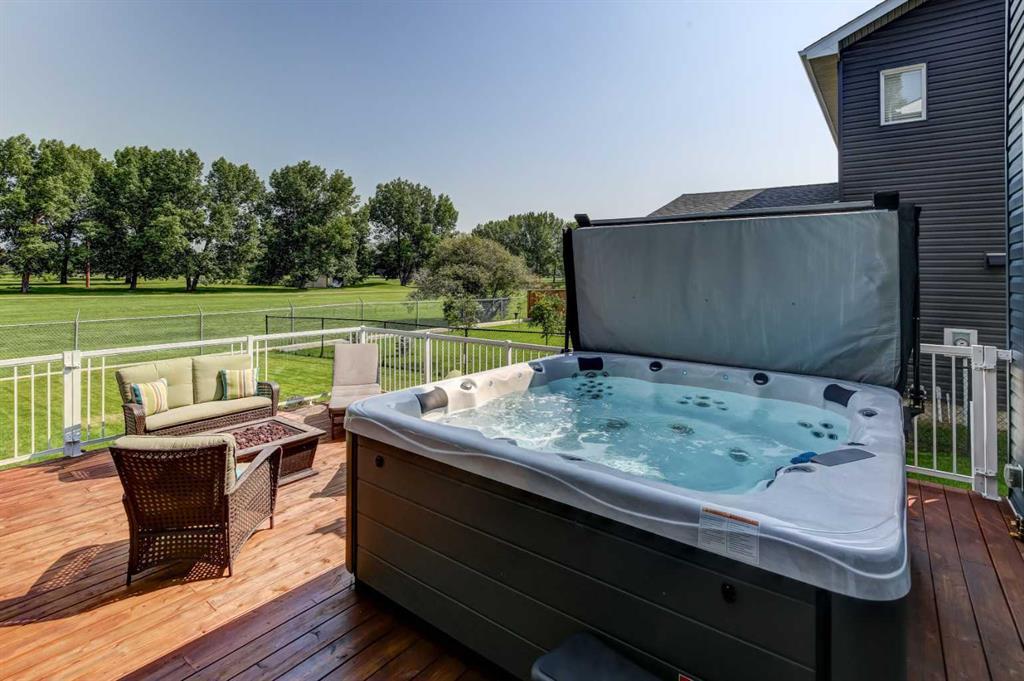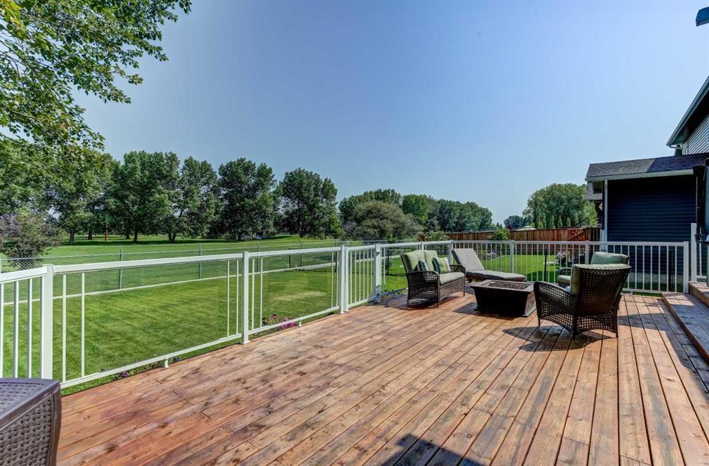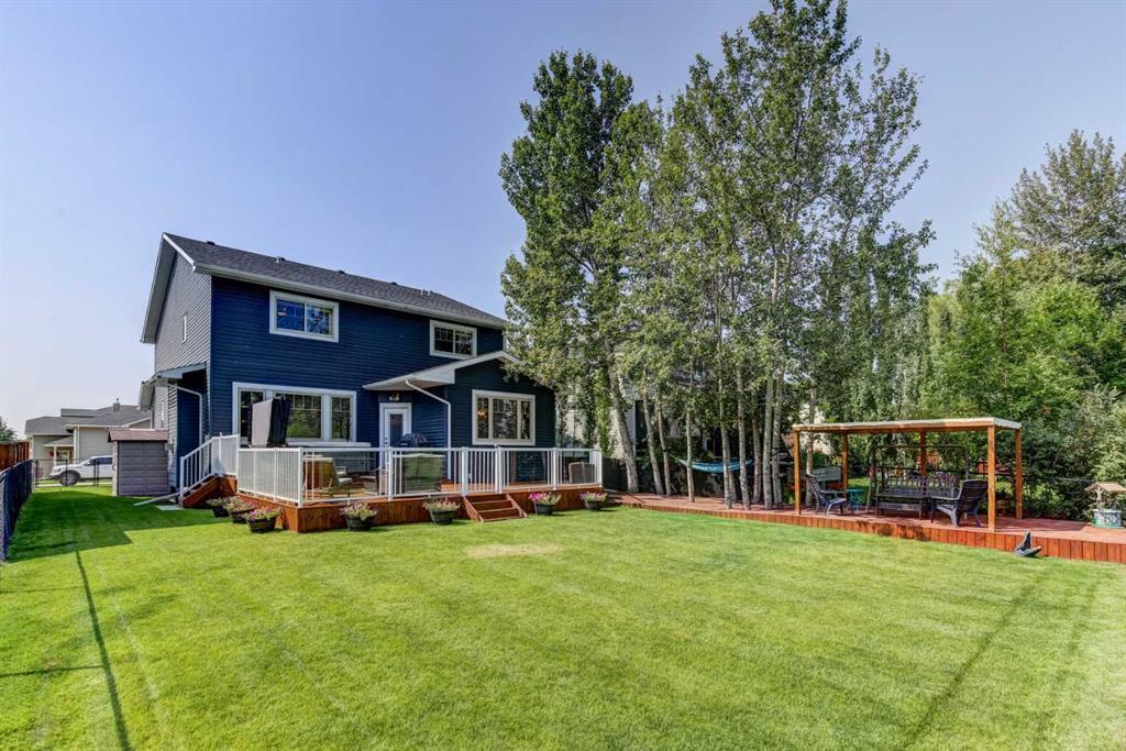 Welcome to Golf course living in Carstairs! This Original owner CUSTOM built by Gold Seal Homes with FULLY developed basement and Central A/C shows pride of ownership throughout. As you enter you are greeted with cathedral ceilings in the spacious foyer. Designed with a seamless blend of luxury and functionality the main level includes 9 foot ceilings and vinyl plank flooring throughout. The sunken living room with fireplace creates the perfect intimate place to relax with views of the Golf Course. The kitchen was designed with a massive granite top island including built in wine rack, maple cabinets extending to the ceiling, gas stove, stainless steel appliances and a HUGE 5 foot wide refrigerator! The rest of the main includes a large dining area, home office, 2 piece bath and mud room with a dog door leading to the exterior dog run. Heading upstairs you will find a large bonus room, laundry room, 3 bedrooms and 2 full baths including the massive master suite with vaulted ceilings , walk in closet and 5 piece ensuite. The basement level has been completed with a 4th bedroom, games/entertainment room with custom coffered ceiling, 3 piece bath and an abundance of storage areas. The oversized garage was designed by the owner with radiant heat, a workshop area, oversized 18 x 8 door and hot and cold water taps. The driveway was also extended to allow parking for 3 vehicles. Last but not least is your AMAZING rear yard oasis. Enjoy soaking in the Hot tub on the 1200 square foot two tier deck and pergola surrounded by 12 mature shade trees backing onto the 17th hole of the Golf course. The large, level and fully landscaped yard including underground sprinklers is the perfect place to unwind and watch the kids or dogs play. There are also gas lines for the BBQ and the fire table. Located just a 2 minute drive to shopping, dining, schools, playgrounds, the skate park, splash park, curling club, skating rink, gyms and the Judo club. Start building your memories today and enjoy small town living at its finest. (id:22211)