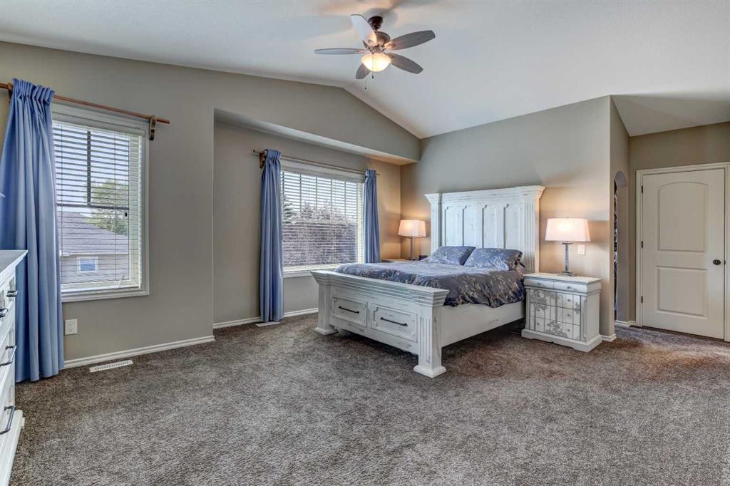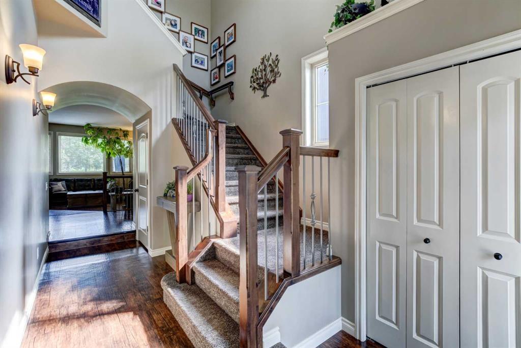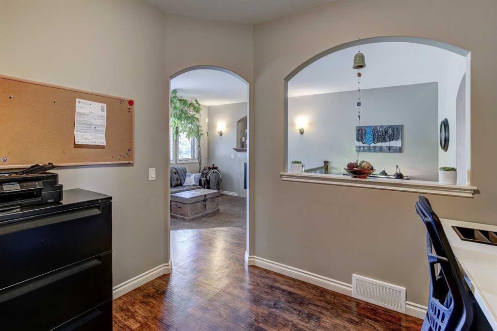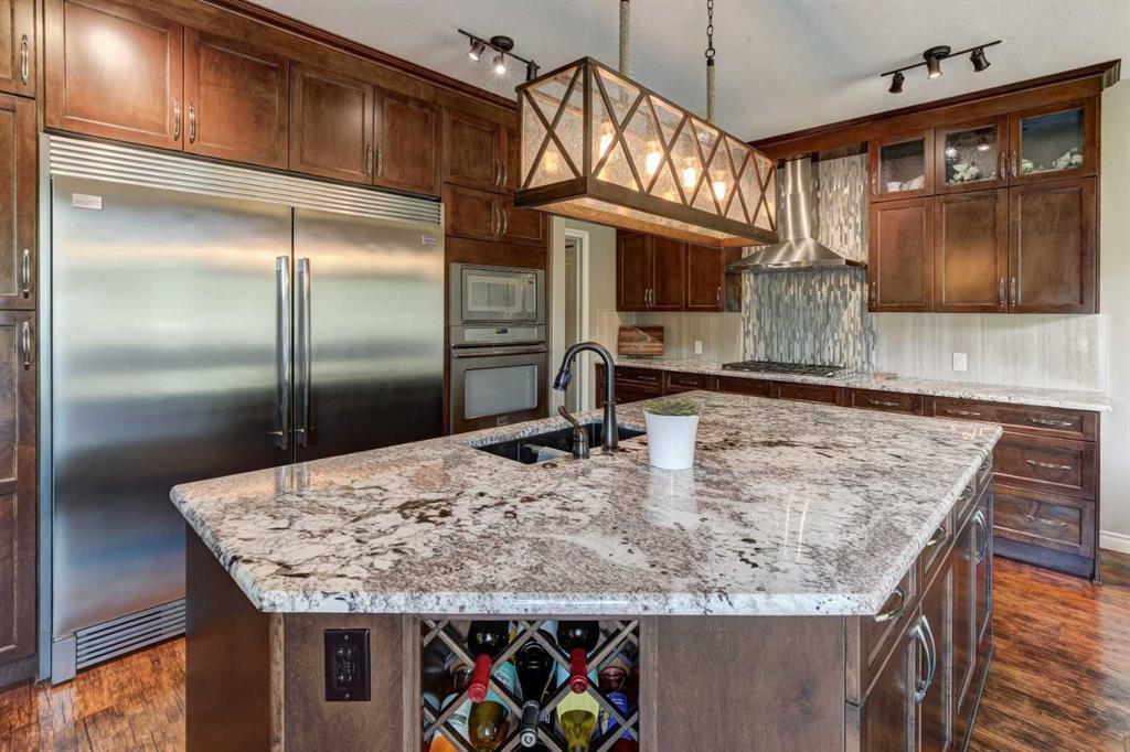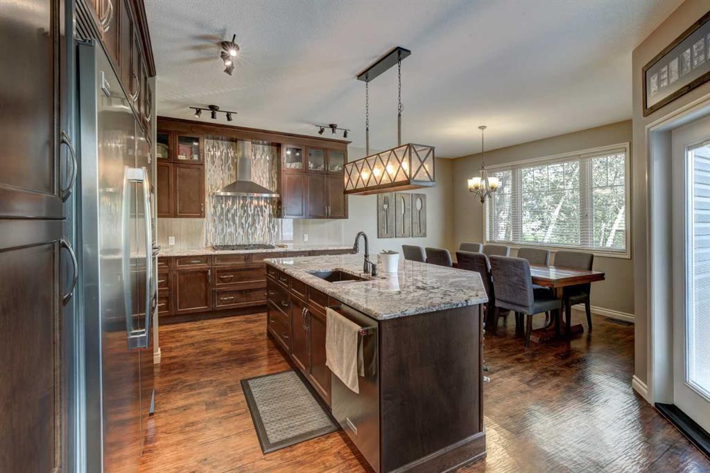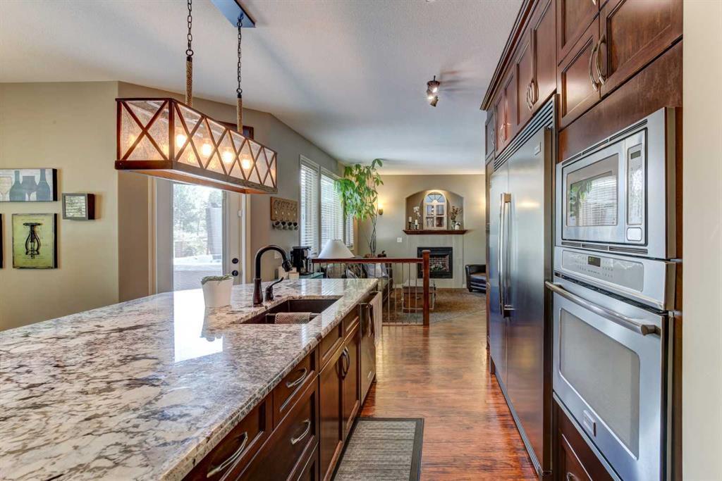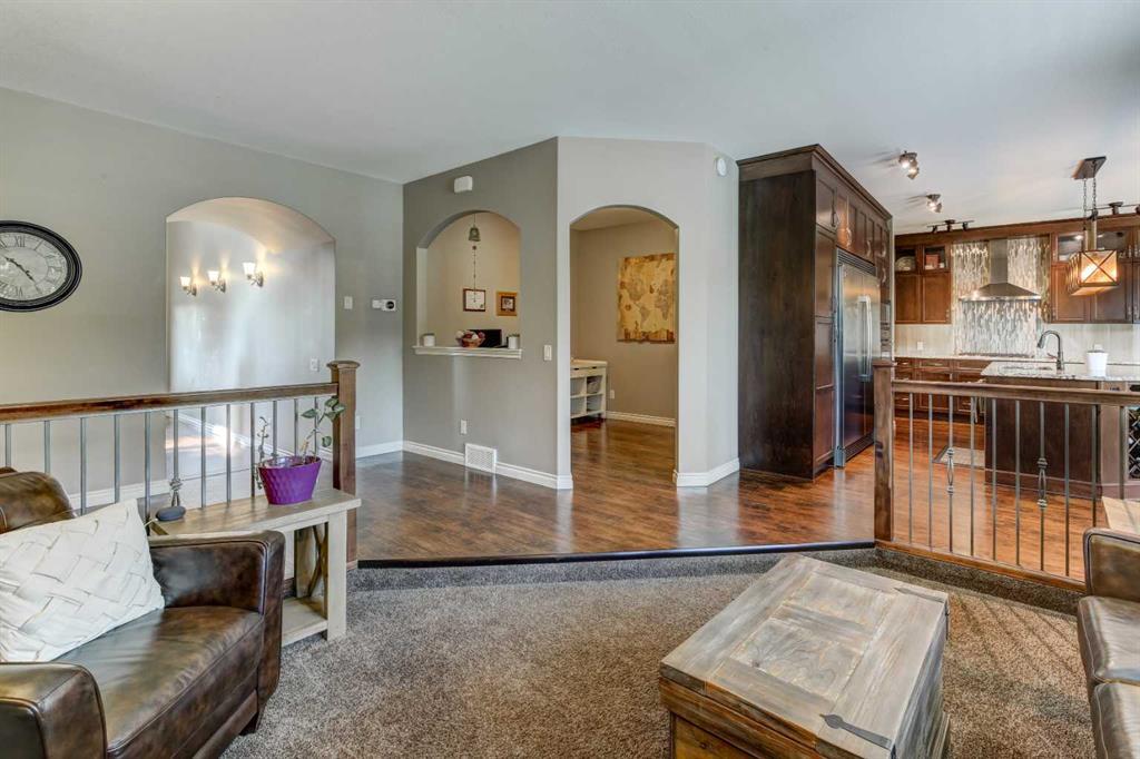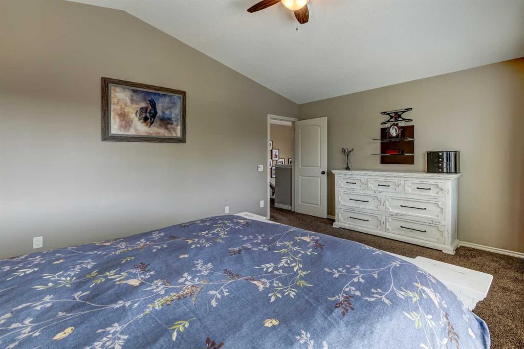 Welcome to Golf course living in Carstairs! This Original owner CUSTOM built by Gold Seal Homes with FULLY developed basement and Central A/C shows pride of ownership throughout. As you enter you are greeted with cathedral ceilings in the spacious foyer. Designed with a seamless blend of luxury and functionality the main level includes 9 foot ceilings and vinyl plank flooring throughout. The sunken living room with fireplace creates the perfect intimate place to relax with views of the Golf Course. The kitchen was designed with a massive granite top island including built in wine rack, maple cabinets extending to the ceiling, gas stove, stainless steel appliances and a HUGE 5 foot wide refrigerator! The rest of the main includes a large dining area, home office, 2 piece bath and mud room with a dog door leading to the exterior dog run. Heading upstairs you will find a large bonus room, laundry room, 3 bedrooms and 2 full baths including the massive master suite with vaulted ceilings , walk in closet and 5 piece ensuite. The basement level has been completed with a 4th bedroom, games/entertainment room with custom coffered ceiling, 3 piece bath and an abundance of storage areas. The oversized garage was designed by the owner with radiant heat, a workshop area, oversized 18 x 8 door and hot and cold water taps. The driveway was also extended to allow parking for 3 vehicles. Last but not least is your AMAZING rear yard oasis. Enjoy soaking in the Hot tub on the 1200 square foot two tier deck and pergola surrounded by 12 mature shade trees backing onto the 17th hole of the Golf course. The large, level and fully landscaped yard including underground sprinklers is the perfect place to unwind and watch the kids or dogs play. There are also gas lines for the BBQ and the fire table. Located just a 2 minute drive to shopping, dining, schools, playgrounds, the skate park, splash park, curling club, skating rink, gyms and the Judo club. Start building your memories today and enjoy small town living at its finest. (id:22211)