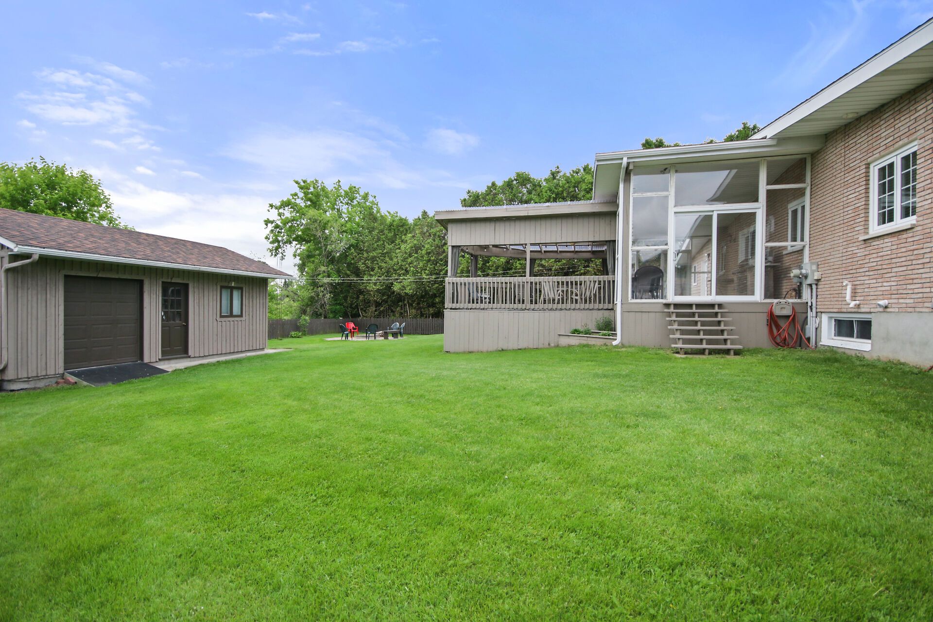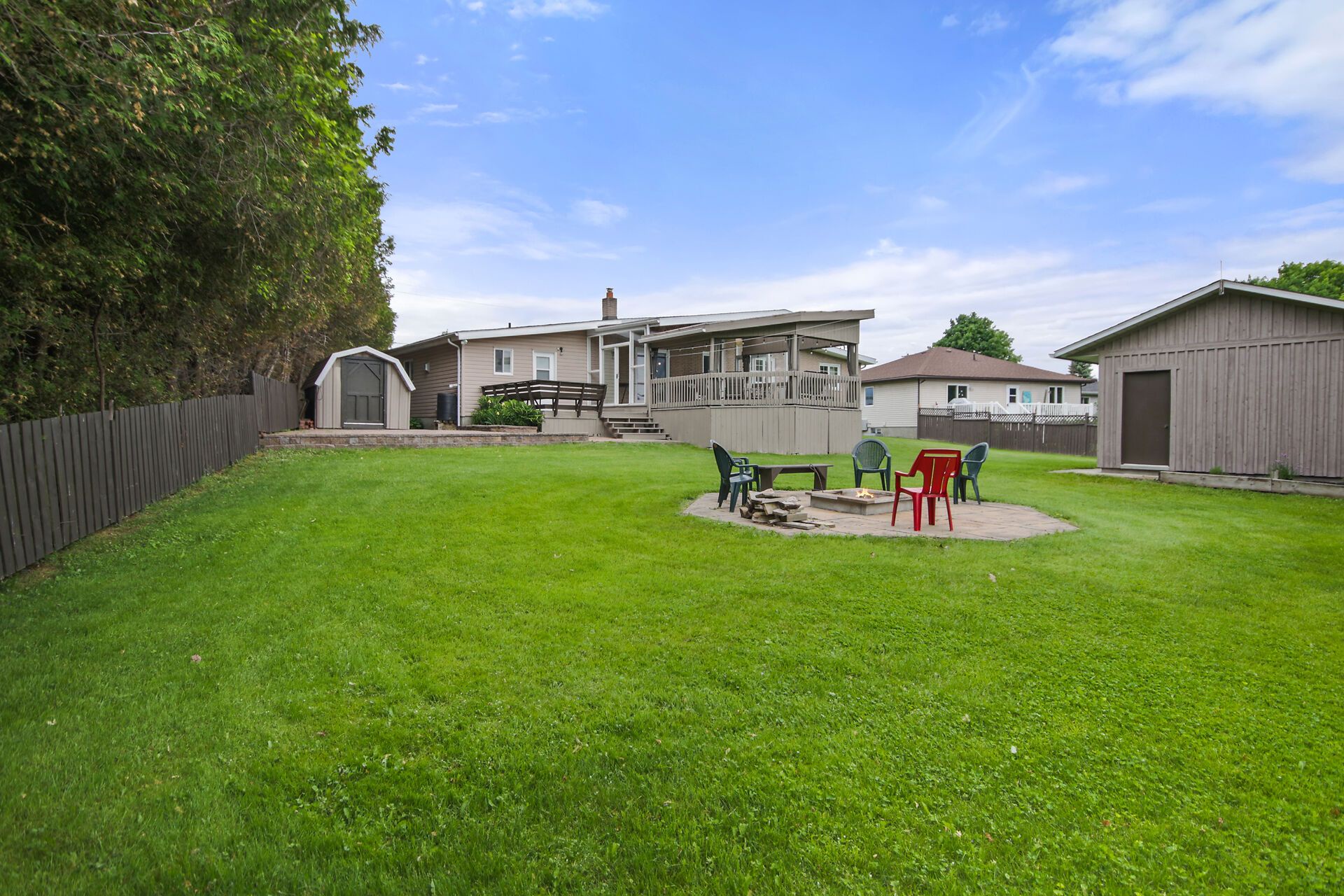 Stunning fully renovated 3BR bungalow on massive fenced lot with circular drive. Grand entrance through brand new front door with operational sidelights. Gorgeous modern kitchen boasts walk-in pantry, granite countertops & impressive 7ft island. Luxury main bathroom features walk-in shower & indulgent soaker tub. Cathedral ceilings in living room create dramatic entertaining space. Main floor family room with separate side entrance & powder room - perfect for home business. Finished basement adds 2 bedrooms, office & walk-in cold storage. Contemporary colors throughout. Dual spacious sunrooms plus deck maximize outdoor living. Fire pit perfect for gatherings. Move-in ready with premium finishes. Private oasis offering endless possibilities!