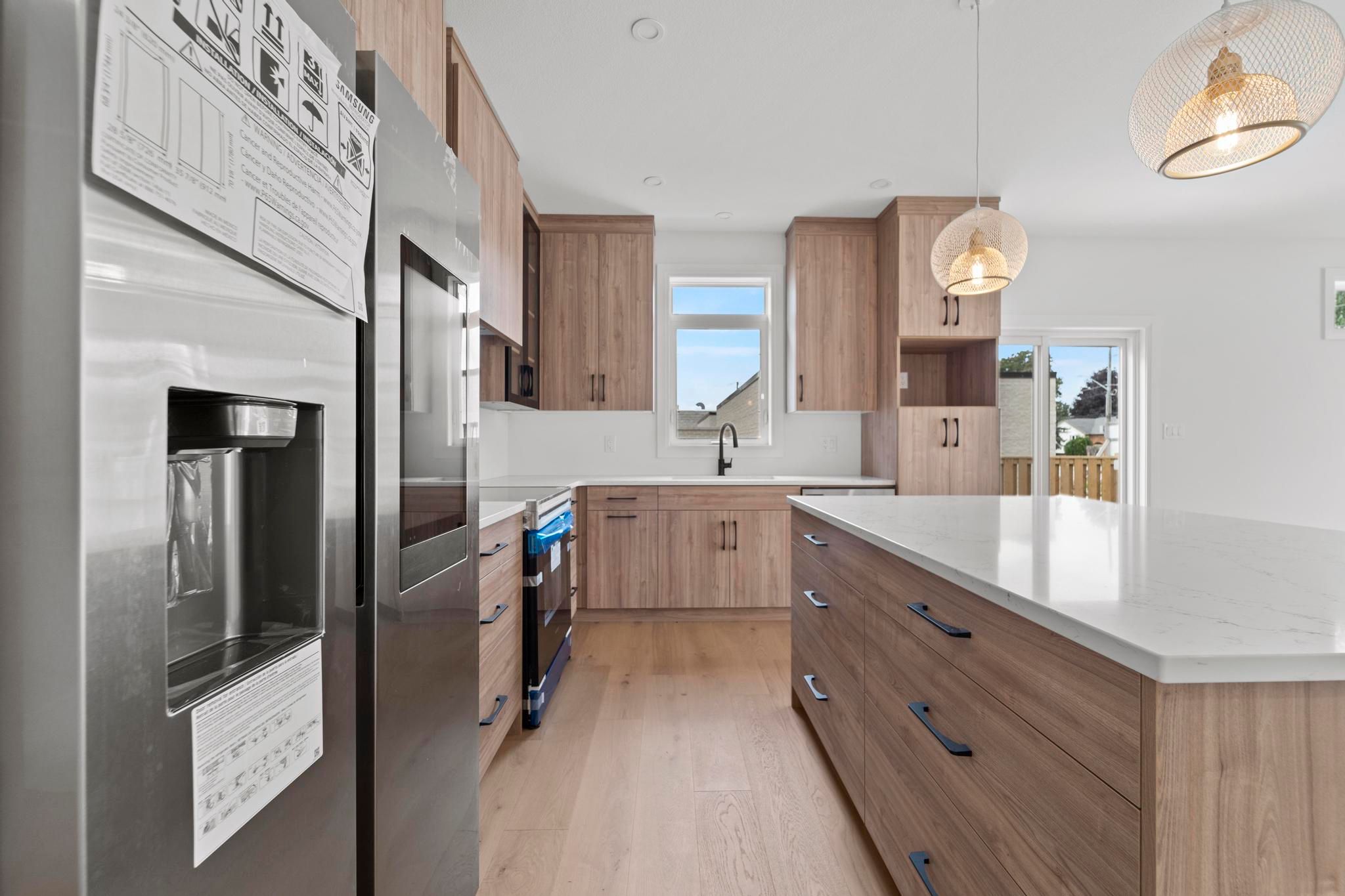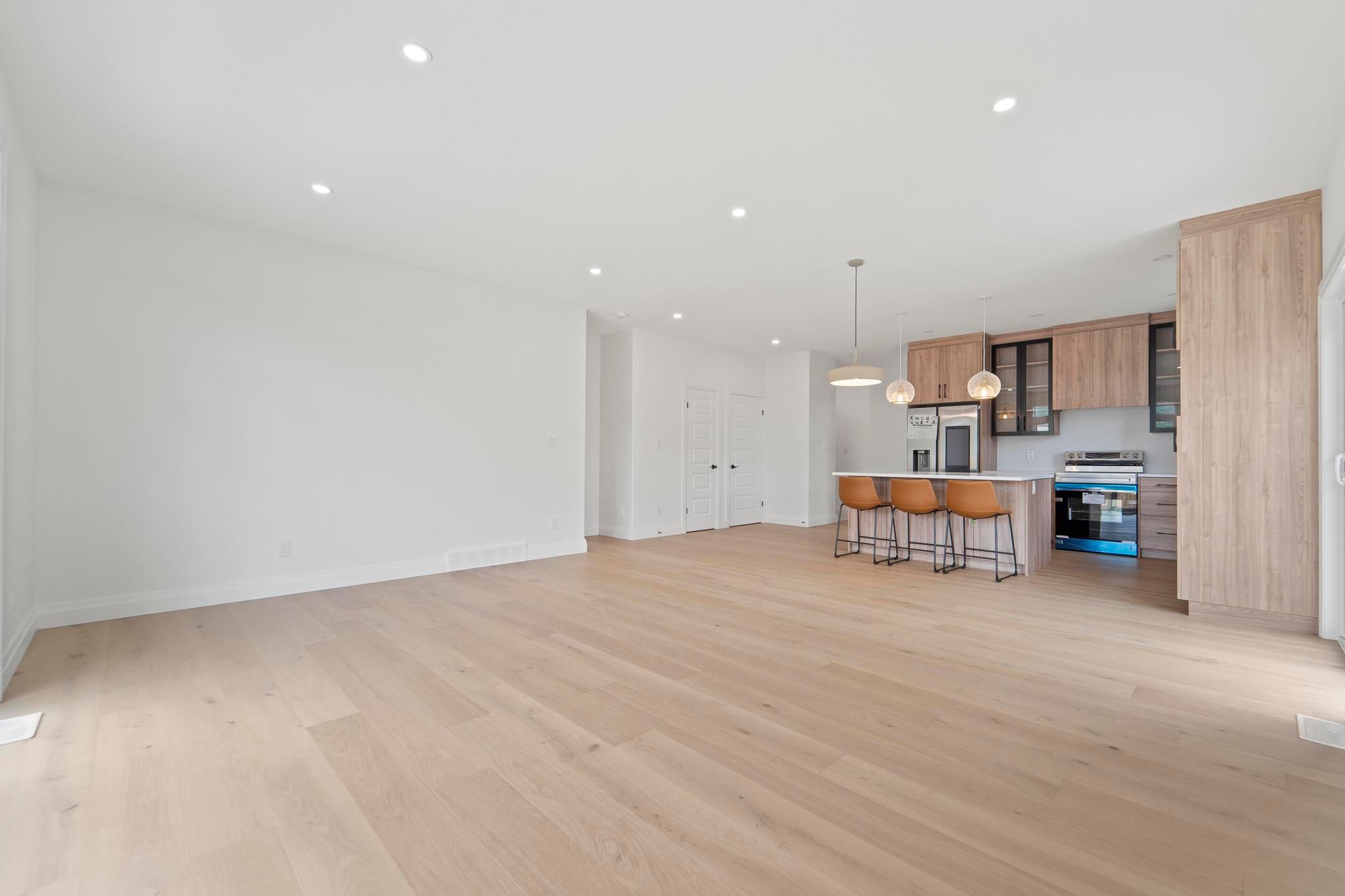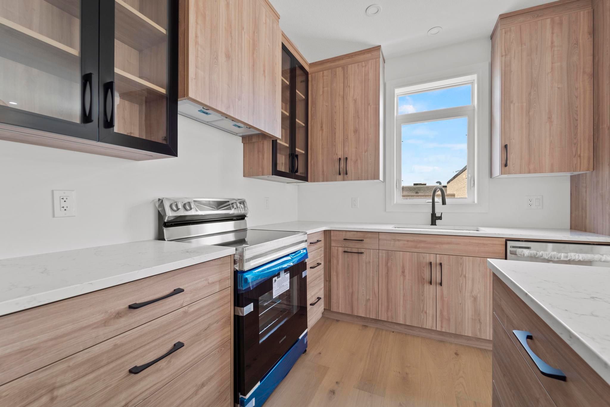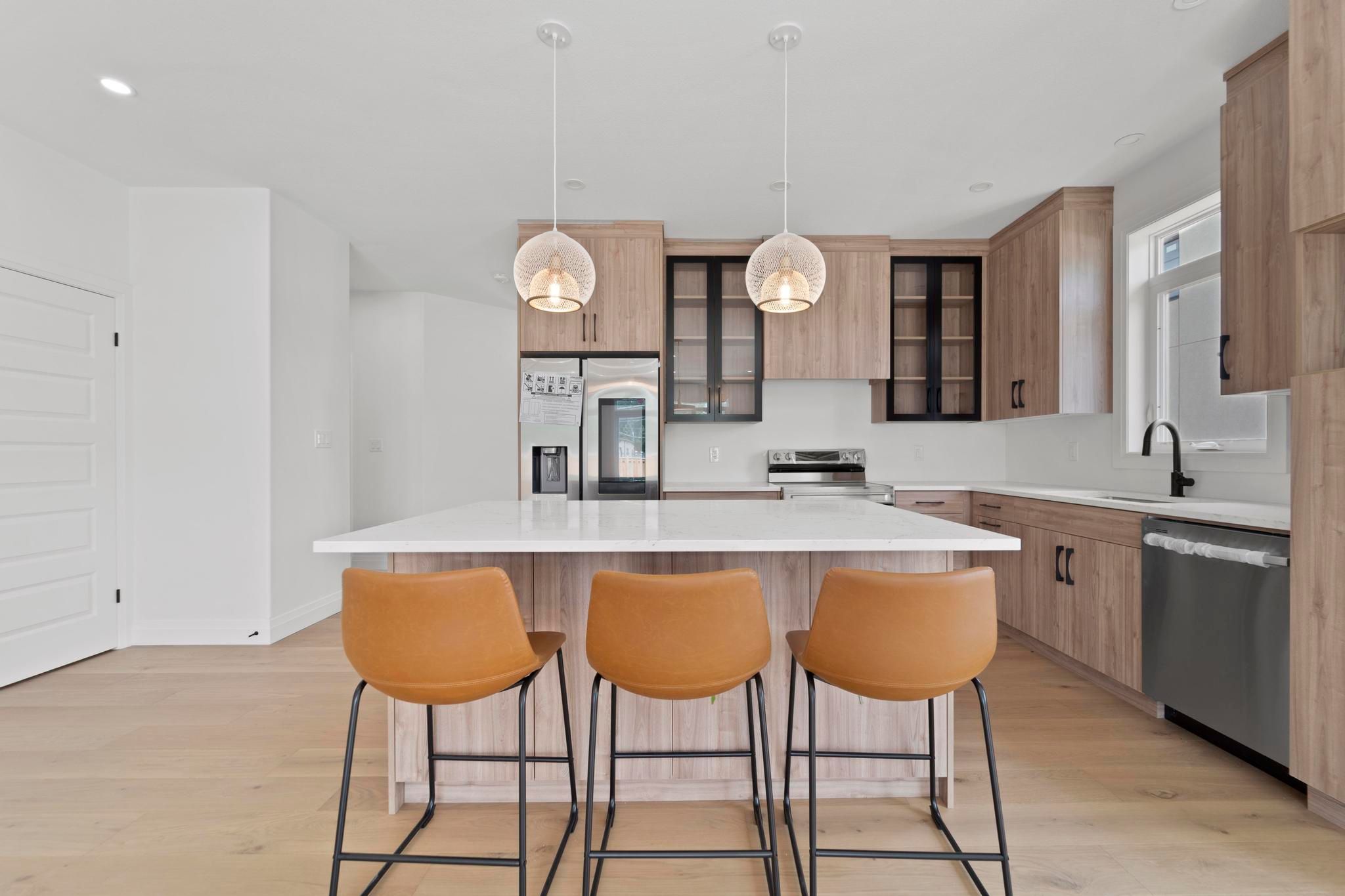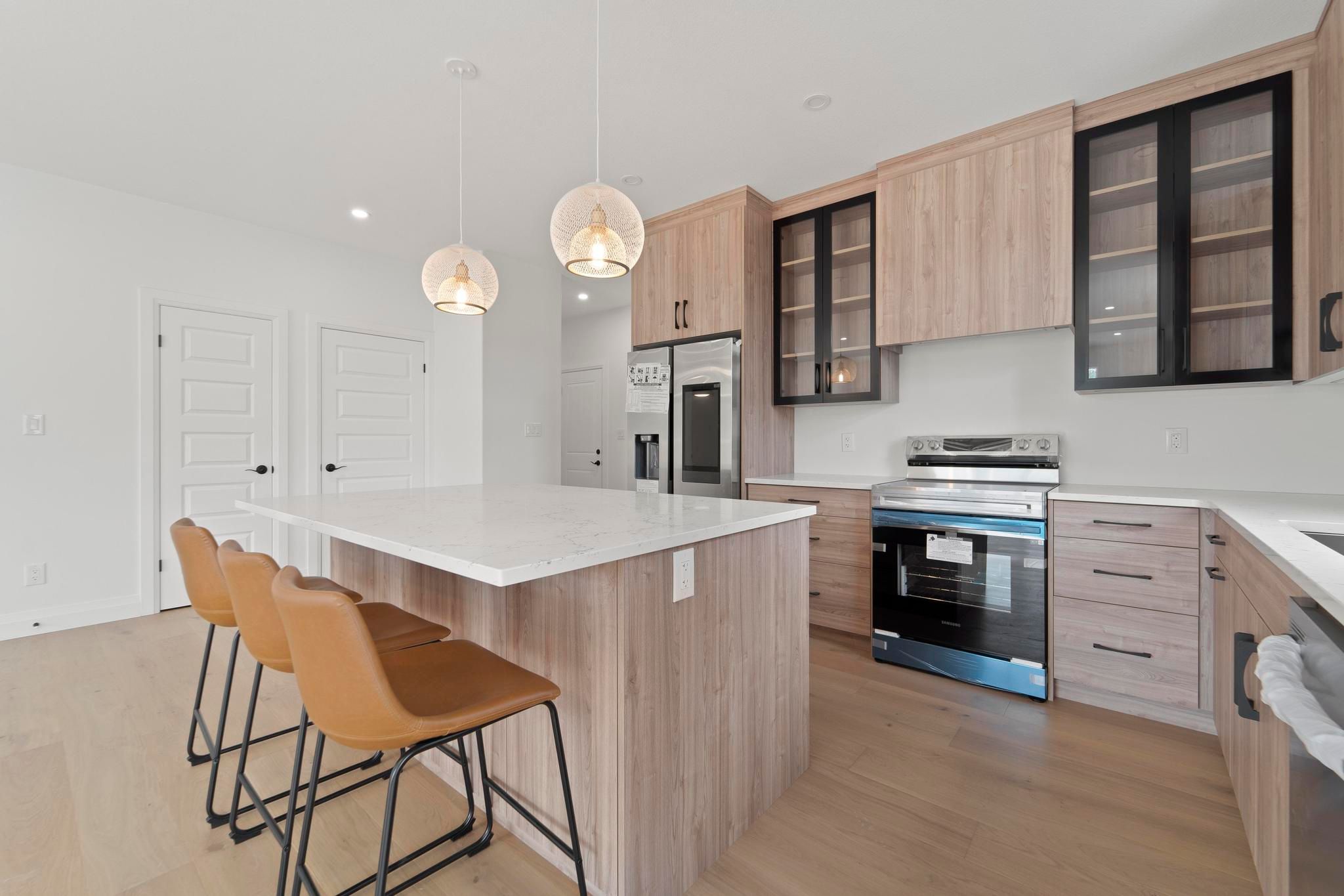 Welcome to one of the largest + brightest sun soaked end-unit townhouses in the neighbourhood! This beautiful 2-bed 2-bath was professionally designed. All finishes were carefully handpicked to exude the lux Scandinavian lifestyle. This property features Bern Marron woodgrain textured kitchen cabinets with black framed cabinets finished with a quartz countertop, an island and built-in under cabinet lighting. This property also features extra high ceilings, an abundance of large windows, 2 sets of large patio doors in the living space, an open floor plan great for entertaining, roughed in central vac and a gas-line for an outdoor BBQ. The master bedroom is equipped with an ensuite and a walk-in closet. The basement offers lots of sunshine and several windows for you to make it your dream home! Monthly association fee of $75/mo includes snow removal and landscaping all year round - so your back can take a breather. Property shows even better in person - come make it your home today!