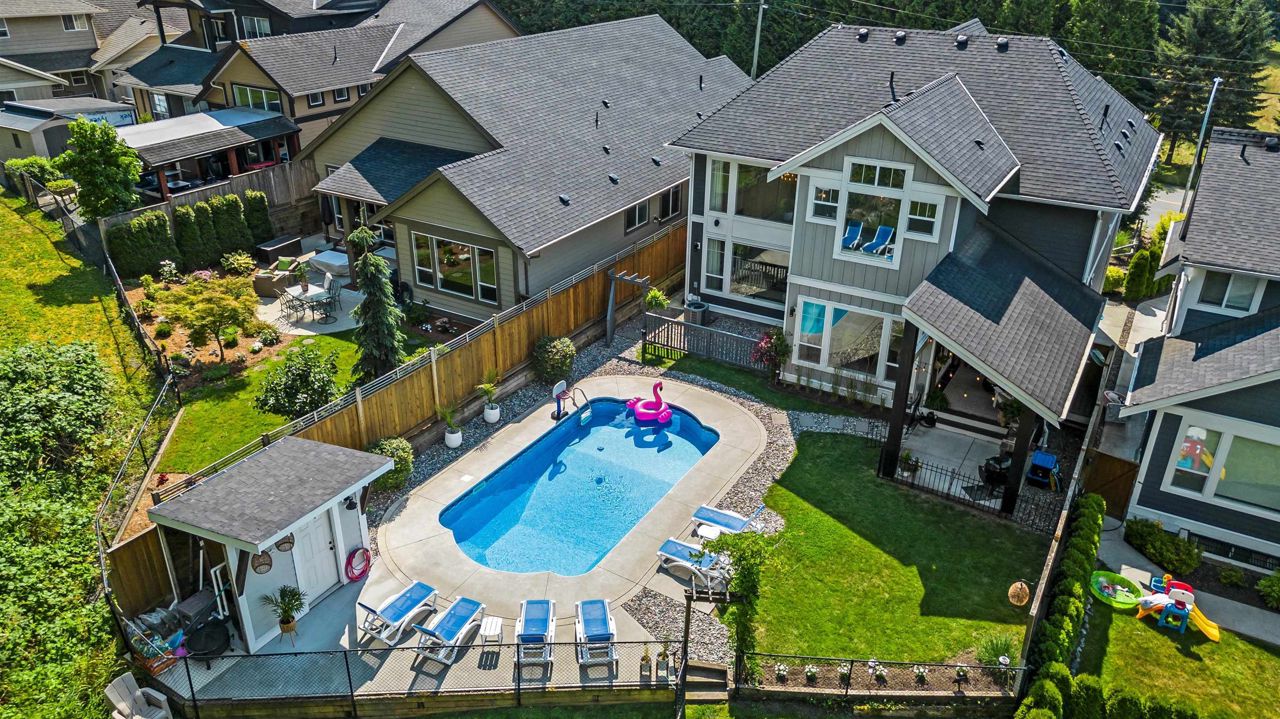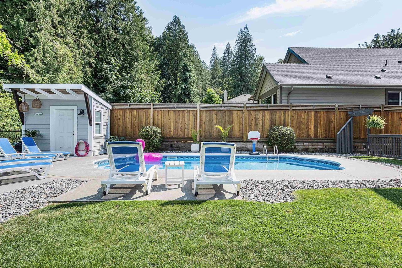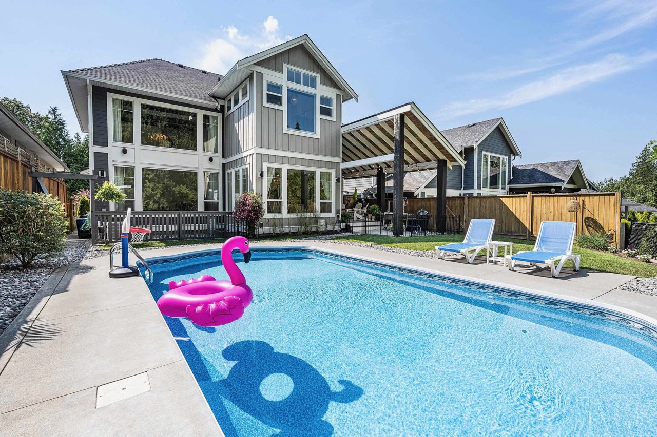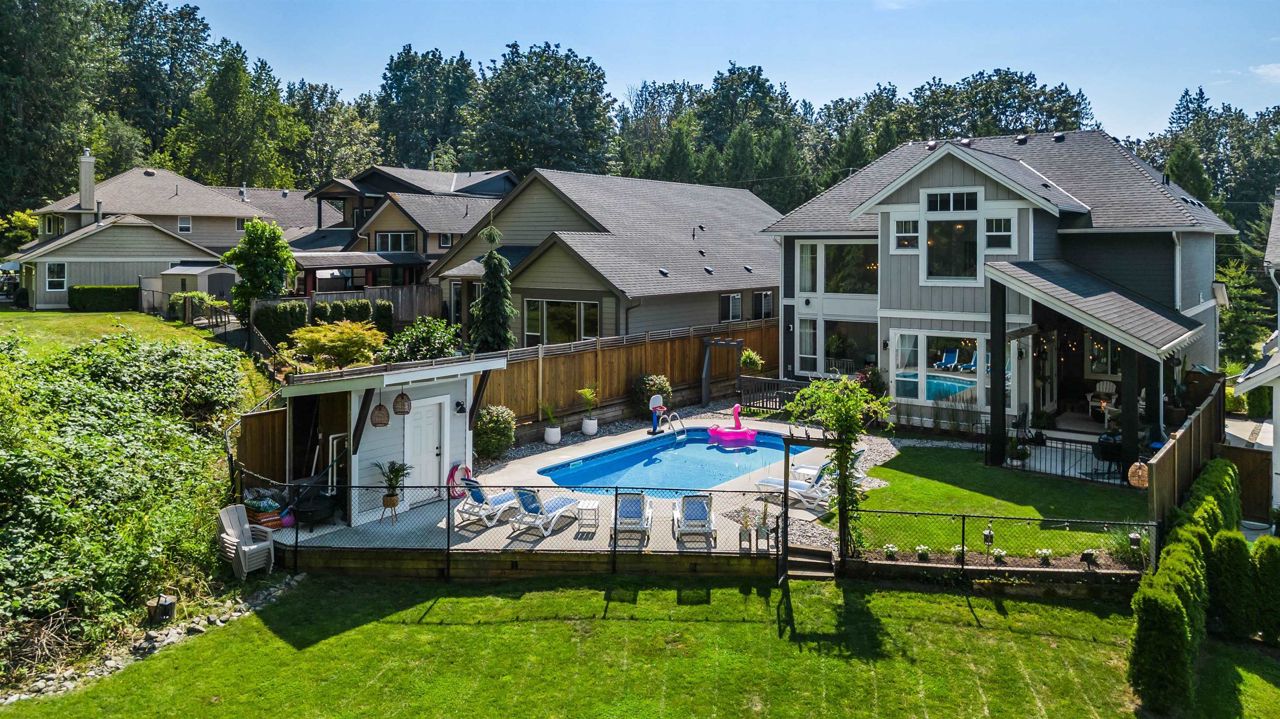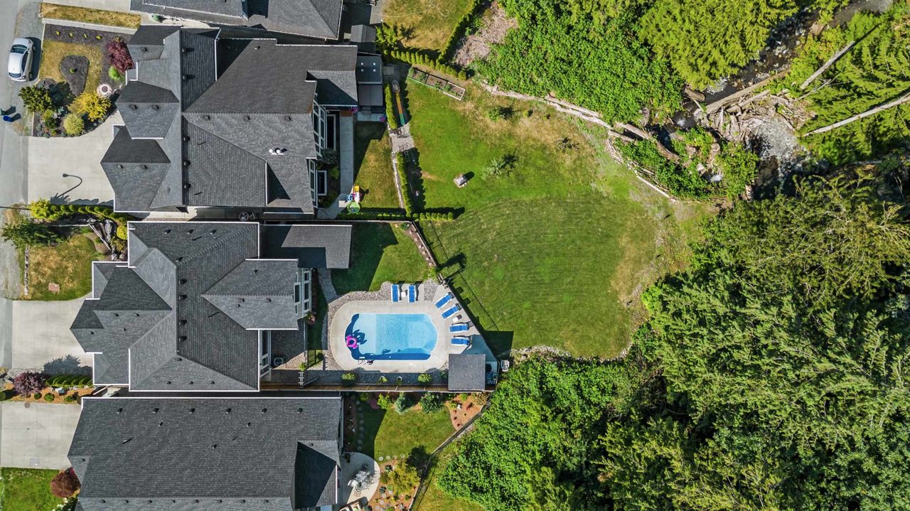 STUNNING CUSTOM home featuring IN GROUND POOL W/BREATHTAKING VIEWS! The impressive Great Room showcases high ceilings w/wood beams, gas fireplace & large windows. The beautiful white kitchen boasts a large island, new S/S appliances & quartz countertops. Also includes spacious Dining Room, playroom/office & mudroom w/built ins. Upstairs the large Primary bdrm offers 2 closets & an elegant 5 piece ensuite w/soaker tub, dble sinks & large W/I shower. Additionally there are 3 more generous sized bdrms & laundry w/new washer/dryer. The basement provides a 1 or 2 bdrm suite, gym area & rec room. Outside the lovely outdoor living space is complete w/covered patio area, in ground pool, pool house w/bthrm, gas & hot tub hookup, fully fenced w/extra green space & backing onto a creek for privacy!