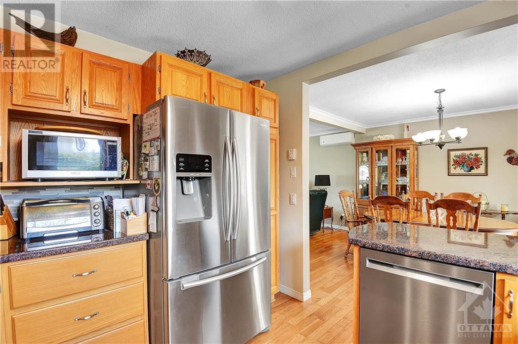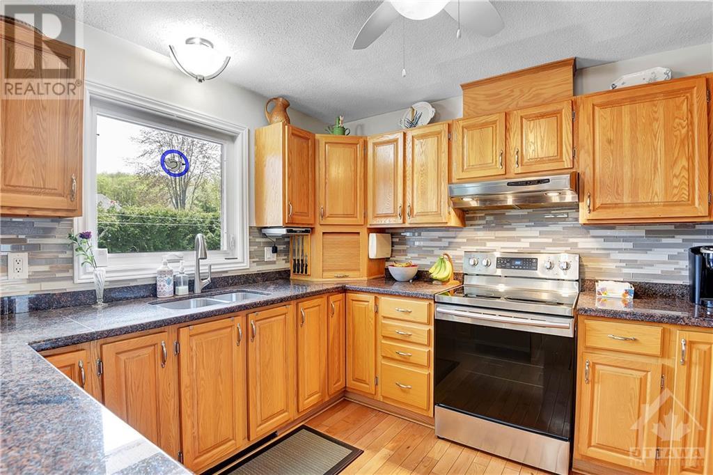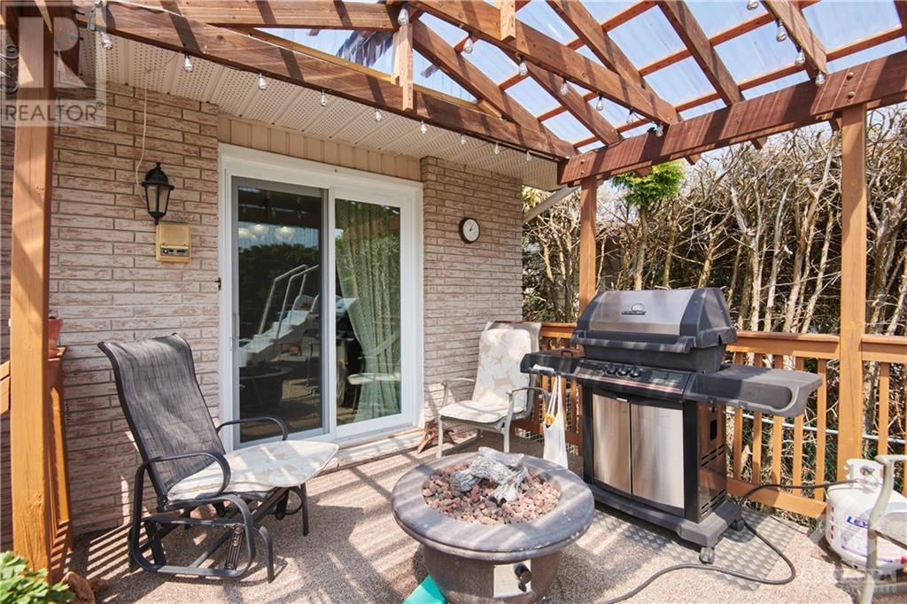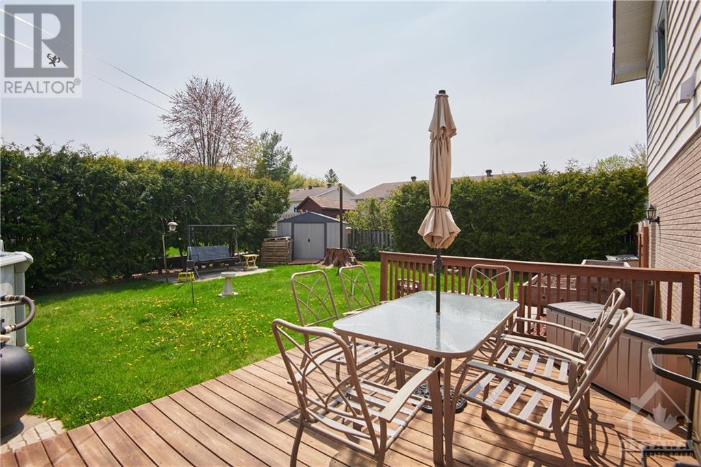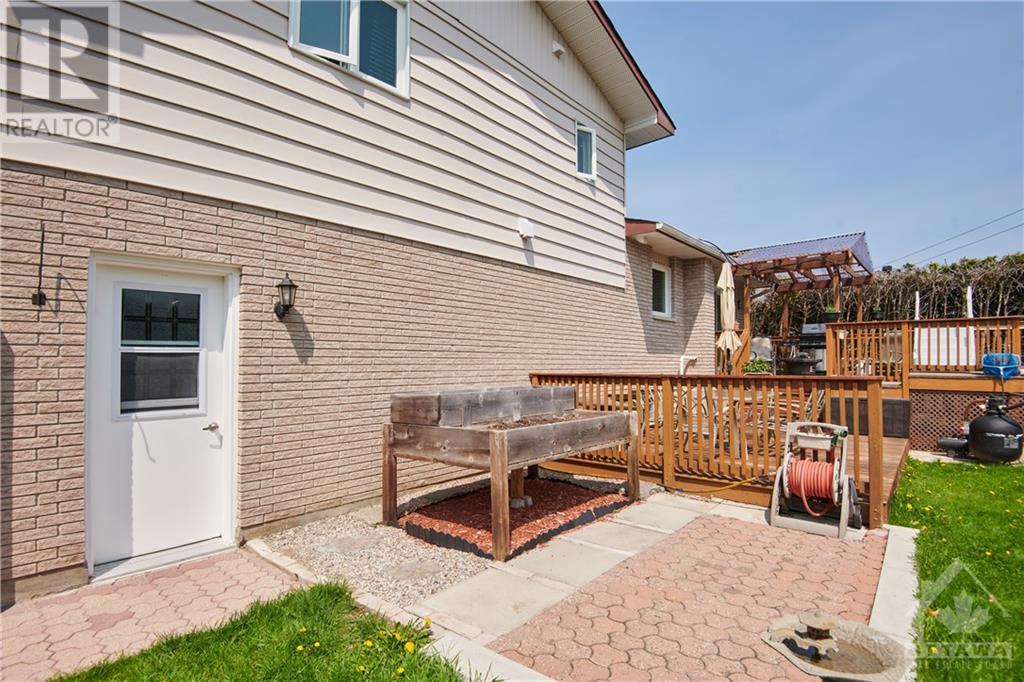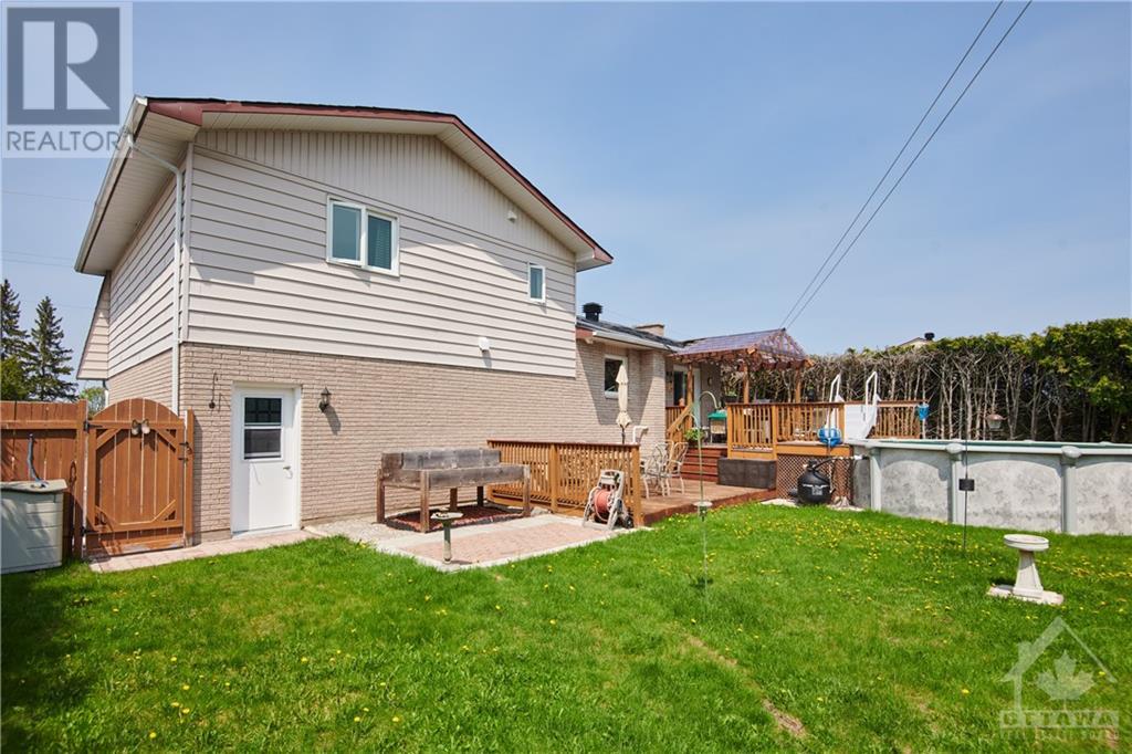 Five minutes from Rockland golf Club, 3+1 Bedroom Side Split w/oversized double car garage. Ample parking on a private lot w/well-maintained front & back yard surrounded by mature trees. View of Gatineau Hills too. The nicely sized foyer, has garage access, & you'll notice hardwood & ceramic flooring on main and 2nd level. The large living room flows into the dining room, and in turn into an abundant kitchen w/ a new layout that provides double the number of cabinets as the original. Stainless steel appliances 2020. Patio door off the dining room leads out to your expansive yard w/above-ground pool, a two-tiered oversized deck & covered deck & 2 patios! Upstairs are 3 good sized bedrooms & laundry room. Primary Bedroom has ensuite privileges to the oversized main bathroom renovated 2020. Downstairs you will find a fully finished basement that includes a spacious Rec room w/floating floor & natural gas standing furnace, a fourth bedroom & second bath. Heat Pump & Central Vac 2022. (id:22211)