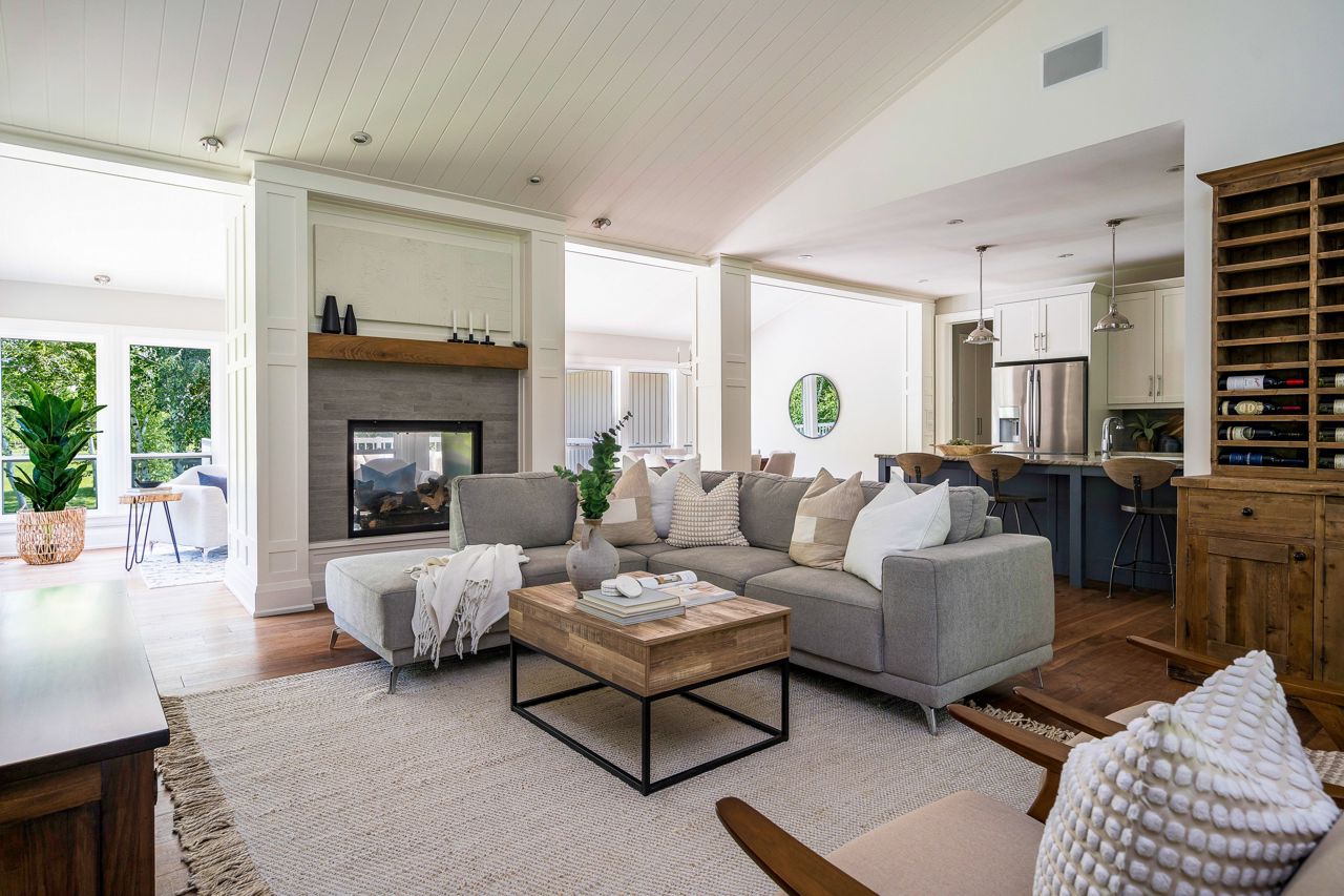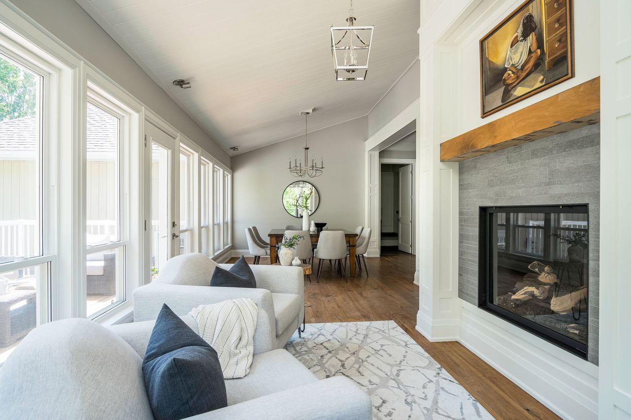 plan with 2 sided fireplace creating a generous living area, sunroom & adjacent dining area with w/o to a