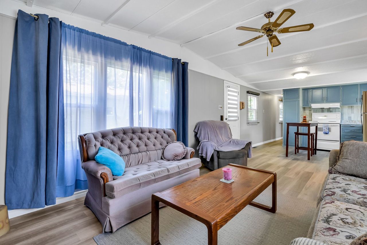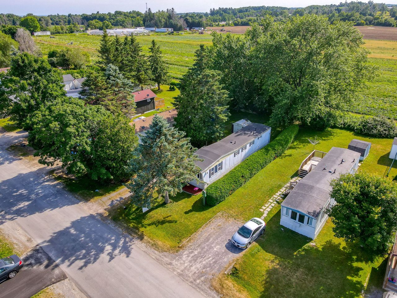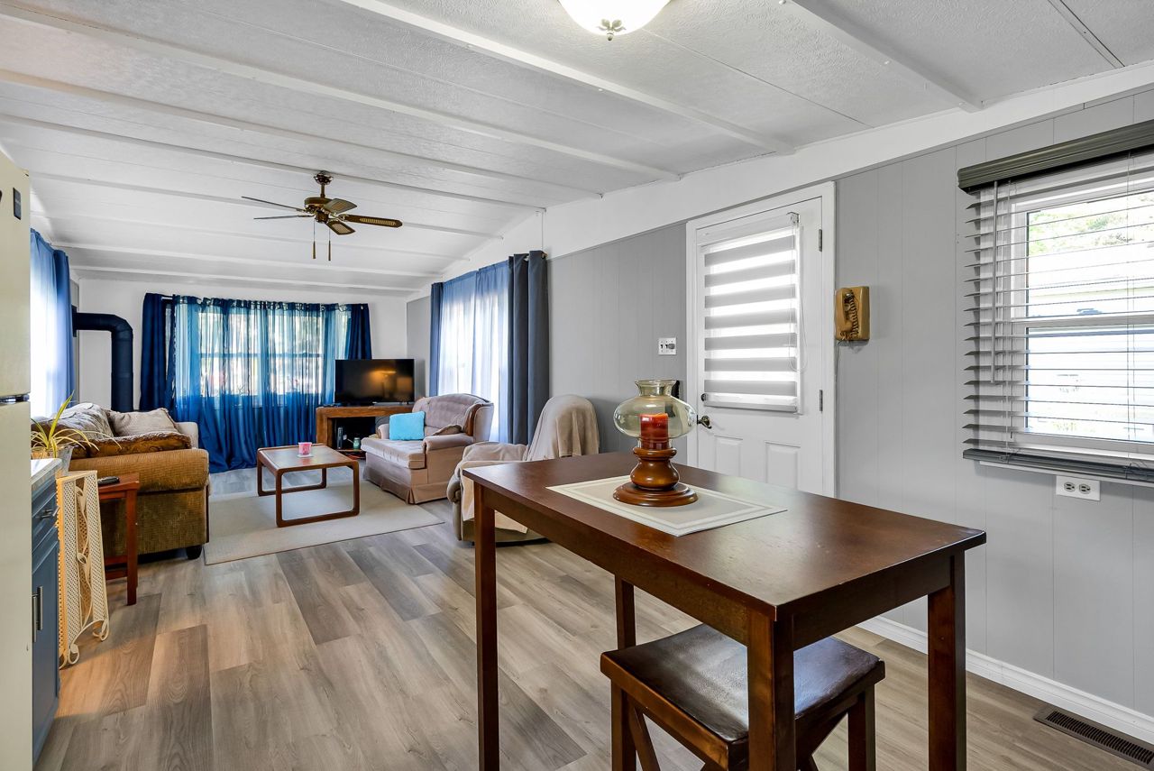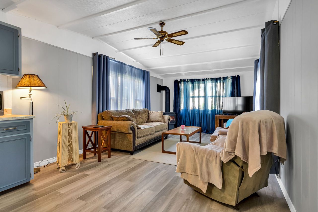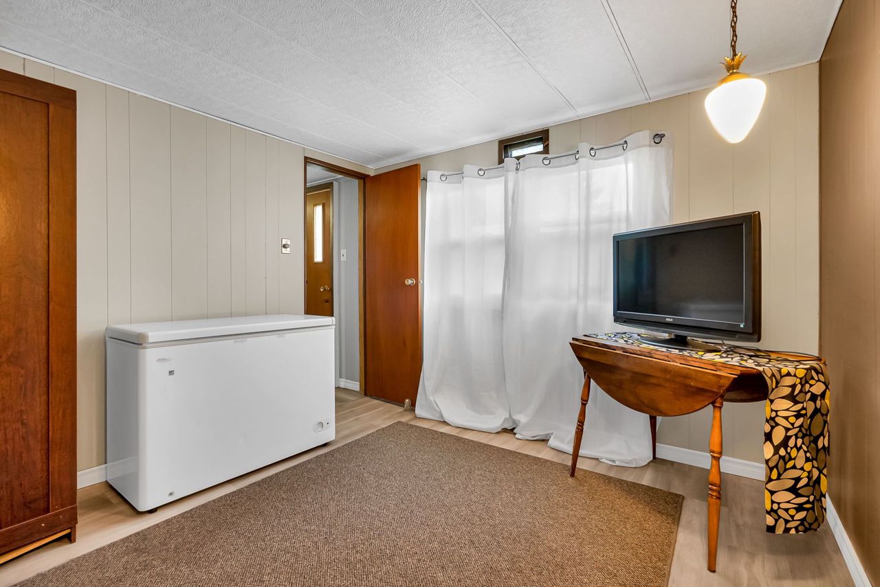 2 Bedroom mobile 12x62. Open concept kitchen and living room with corner free standing gas stove and laminate flooring. Renovated 4pc bath. Primary bedroom was once 2 bedrooms. Attached 8x12 deck. Lot 50x150. Private backyard back onto farmers fields. Shows well, move in condition.Model-Northlander manufacturer. C. Stom Trailers Ltd. Exeter Ontario. Serial NO. 45652197 (Township of Hamilton)
