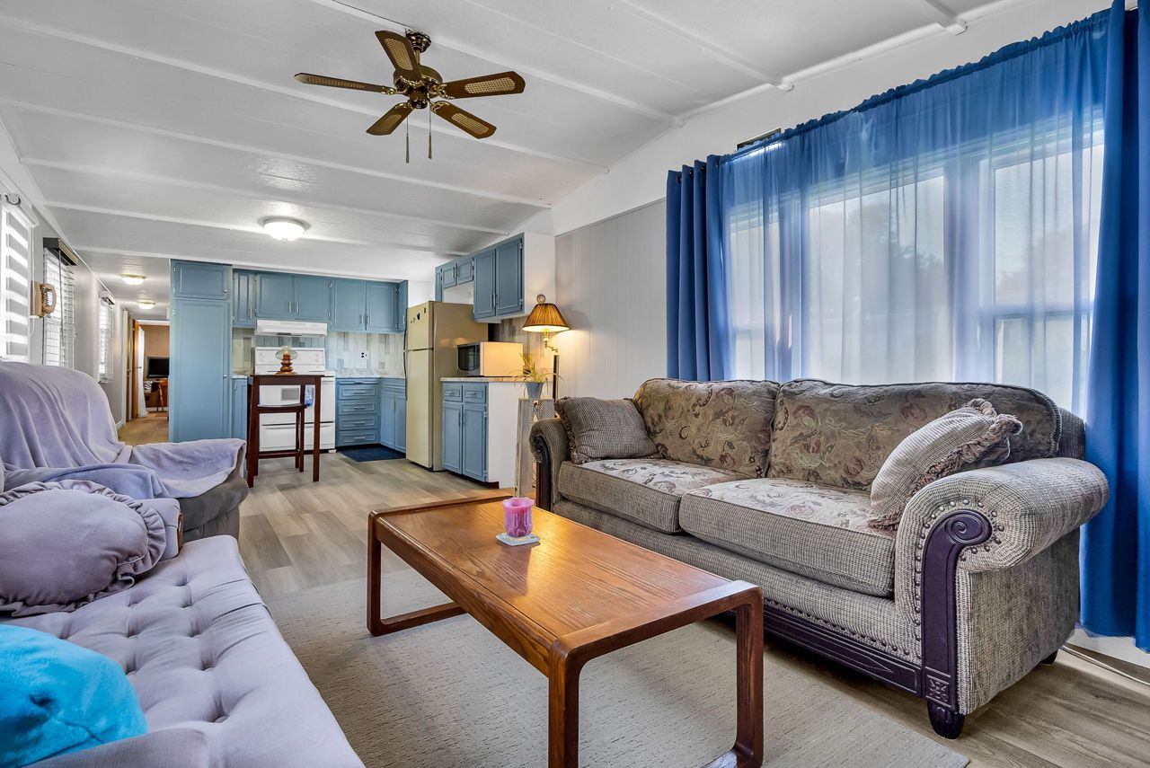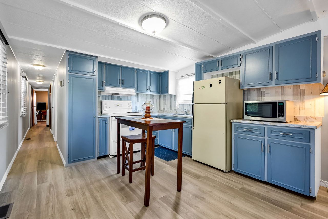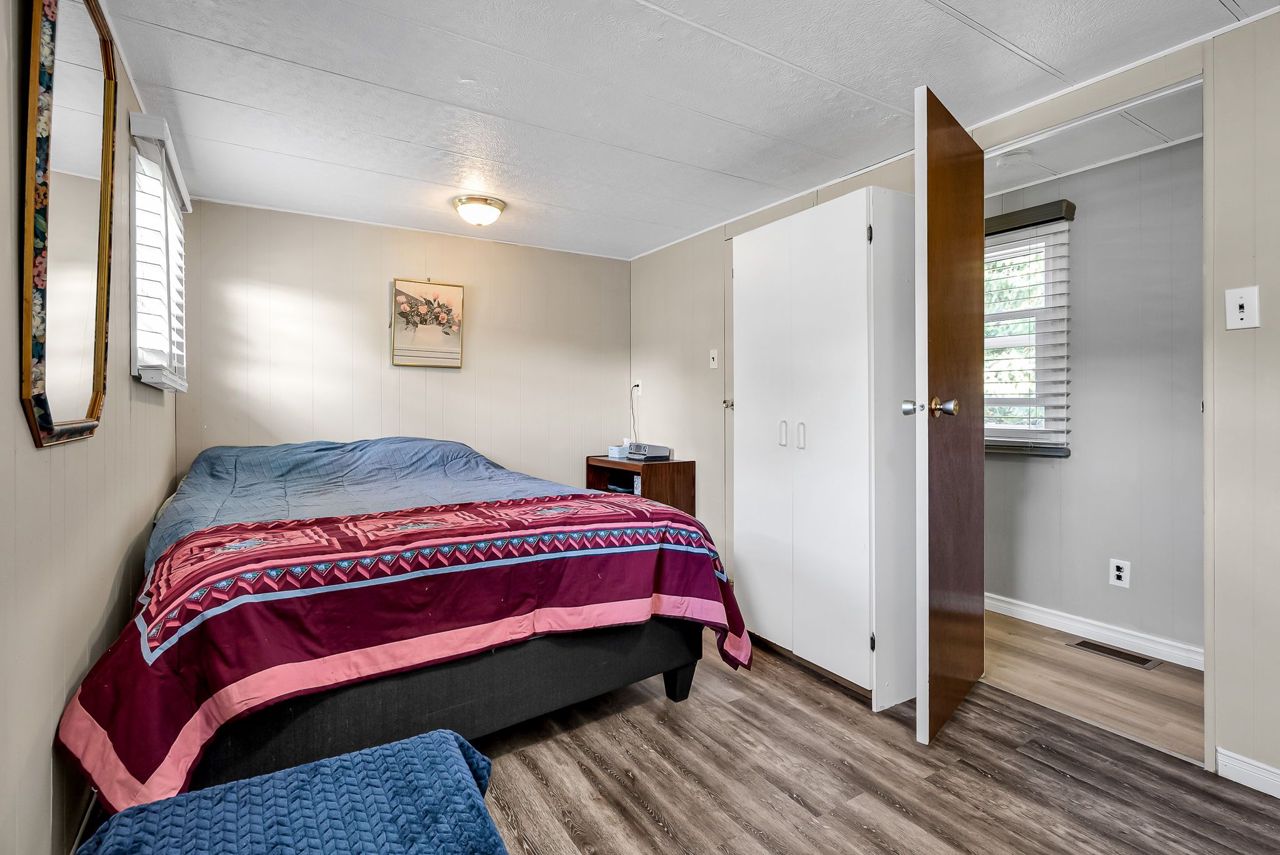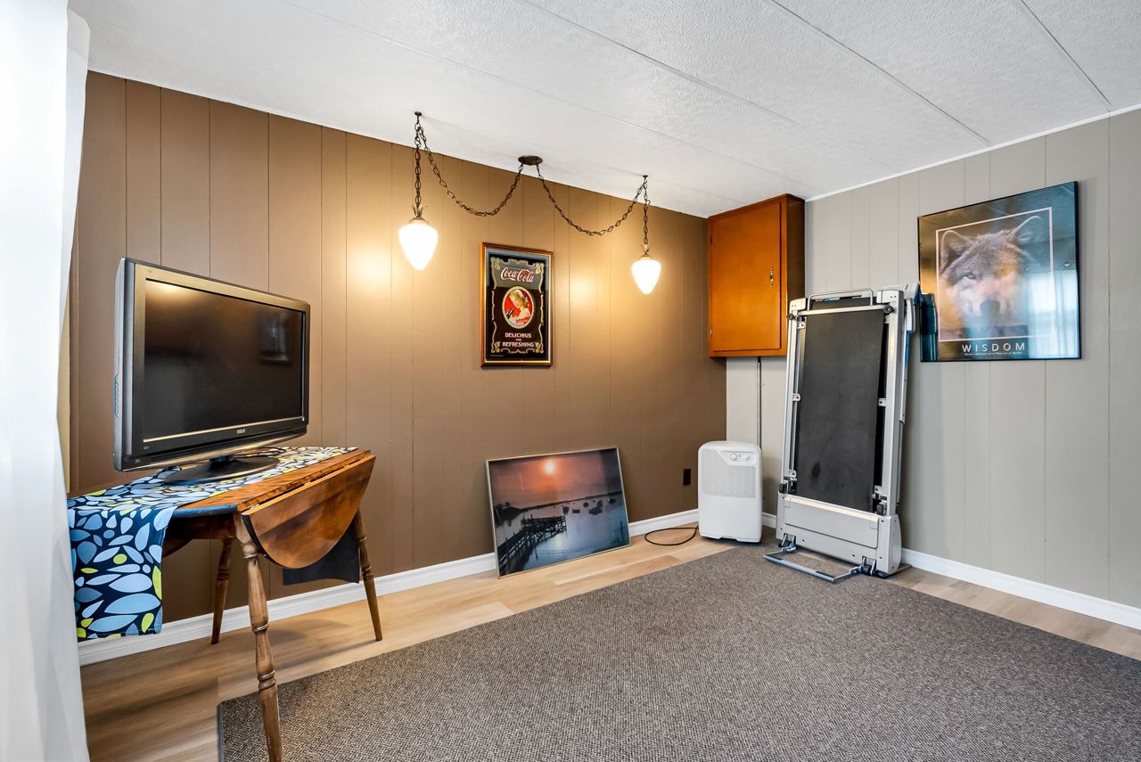 2 Bedroom mobile 12x62. Open concept kitchen and living room with corner free standing gas stove and laminate flooring. Renovated 4pc bath. Primary bedroom was once 2 bedrooms. Attached 8x12 deck. Lot 50x150. Private backyard back onto farmers fields. Shows well, move in condition.Model-Northlander manufacturer. C. Stom Trailers Ltd. Exeter Ontario. Serial NO. 45652197 (Township of Hamilton)