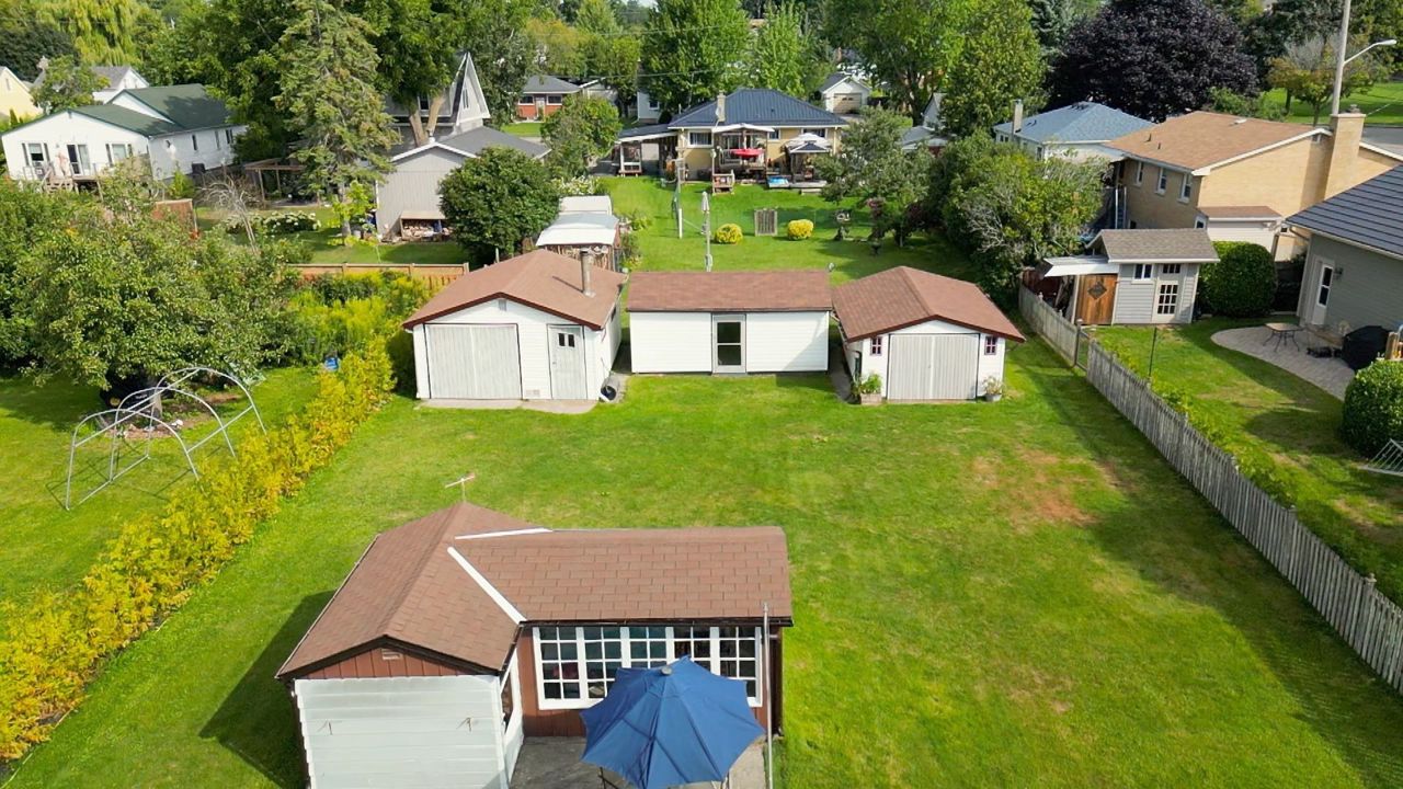 Spend your summers enjoying the Lake Ontario waterfront from Cobourg's historic "Corktown" district, just an hour from Toronto! Amble to the water's edge for a dip in the lake, stroll to the beach to spend a day in the sun, or meander to the park to watch a game - all within a 3-minute walk from your front door! Well-maintained bungalow offers convenient one-level living on an oversized lot. Eat-in kitchen, gas fireplace in living room, updated washroom, 2 bedrooms + nursery or den. Supplement your income with the solar panels, and appreciate the peace-of-mind from having your own gas-fired generator. Tons of extra workshop and storage space in the outbuildings, while still having plenty of lawn for pets, kids, and gardens.Generac Gas-Fired Generator, Transferrable Contract for Solar Panels
