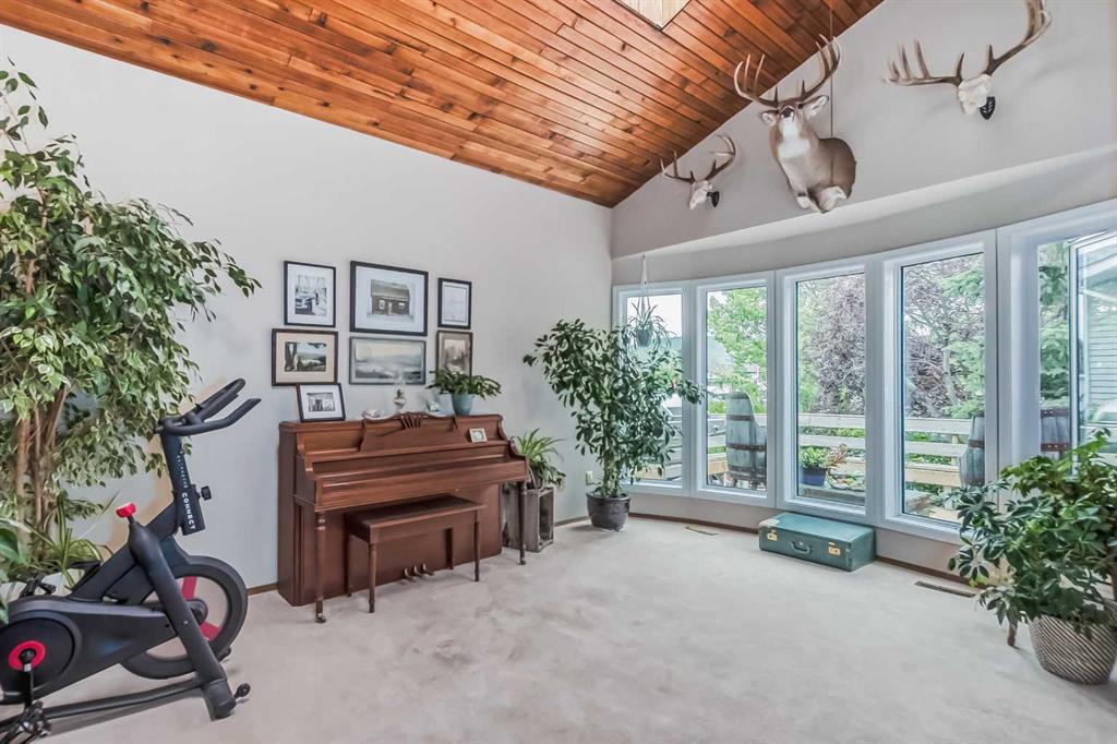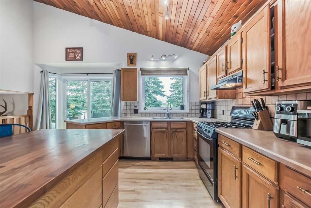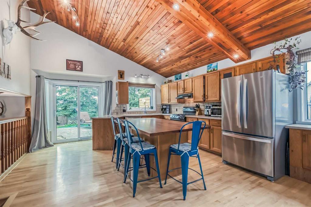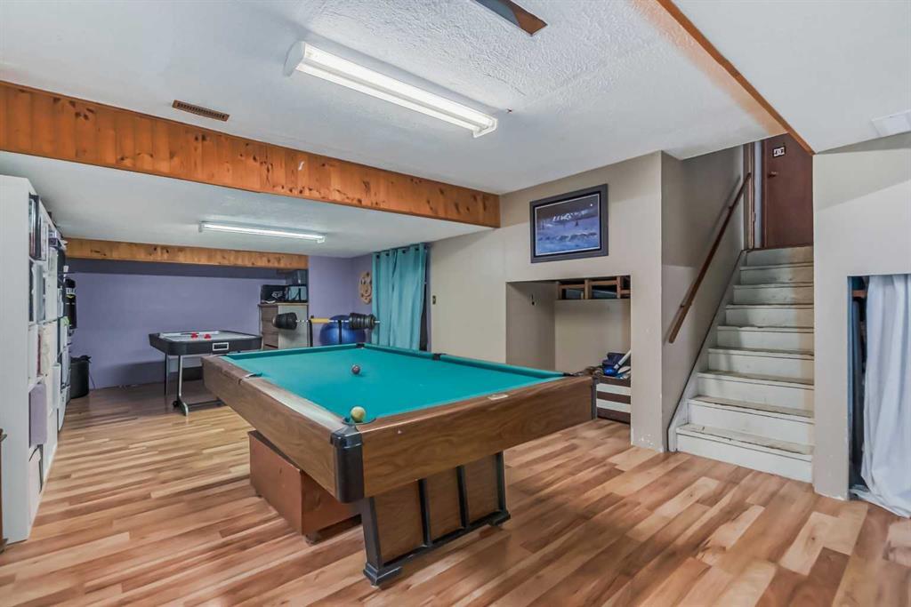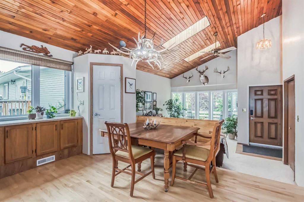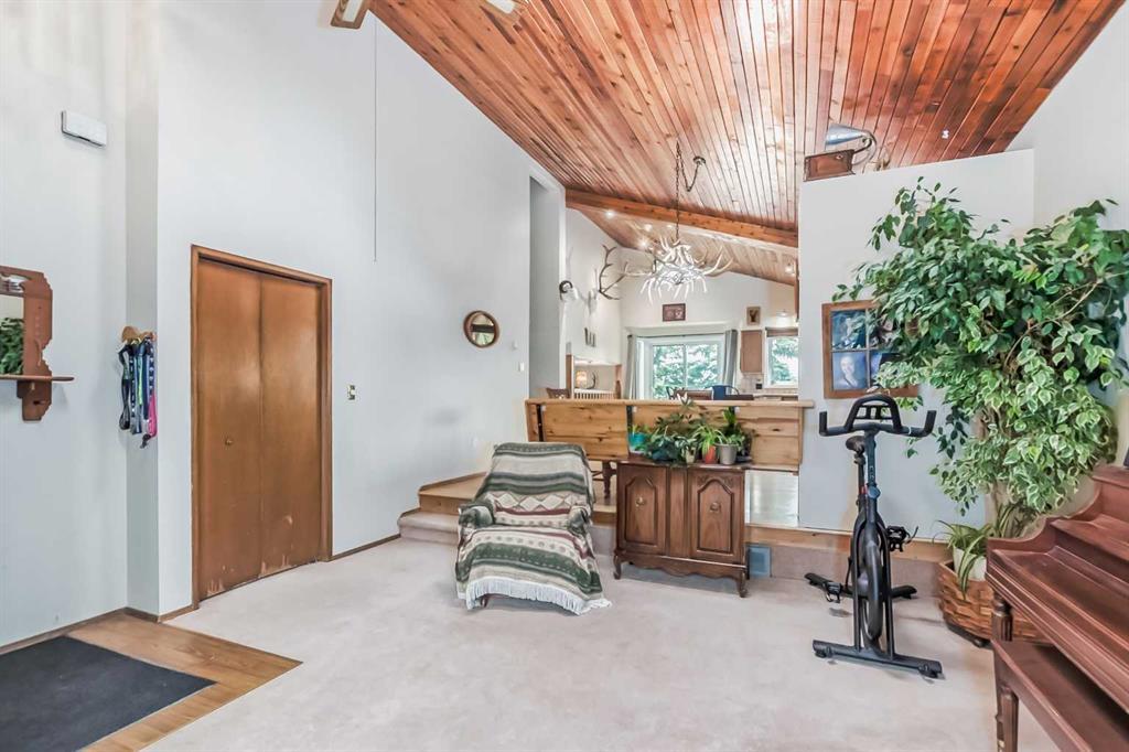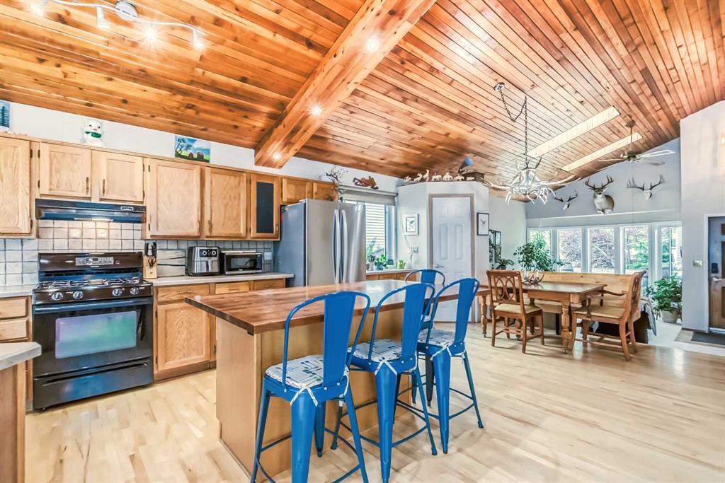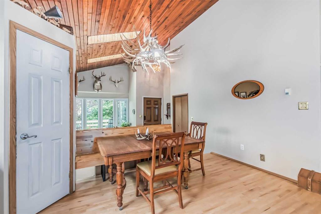 Welcome to 112 Glenhill Drive, and an amazing opportunity to own in the very desirable neighborhood of Glenbow, close to schools and walking paths, and just a short walk to the Bow River. This charming detached home with tons of character has double garage, just under 1800 sq ft and a further 436 sq ft in the finished basement and is set on a large lot with mature trees and plenty of potential. You will notice the original features of this home as soon as you walk through the front door, such as the wood plank ceiling which continues the length of the main level. The bay window at the front lets in lots of light into the open plan living, dining and large kitchen area, with island and views into the private back yard. Down to the snug area, with cozy wood burning stove and doors to the back yard, with hot tub! Up stairs you will find the primary bedroom, and a further 2 good sized bedrooms, and 4-piece bathroom. Down to the lower level you will find the office, mudroom and 3-piece bathroom and the basement finishes off the interior of this home, with large rec room (pool table included). The owners have recently added new windows and roof to this amazing property. The community of Glenbow is just minutes to the main highway, with Calgary to the East and Canmore and the mountains to the West, Properties like this don’t come to market very often, book your showing today! (id:22211)