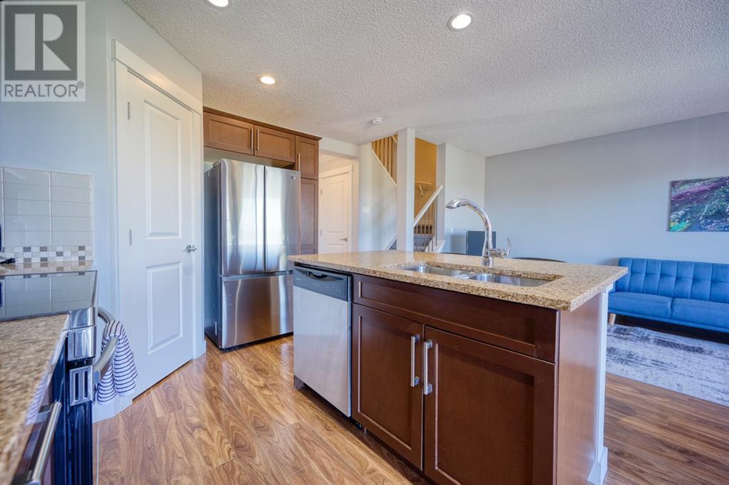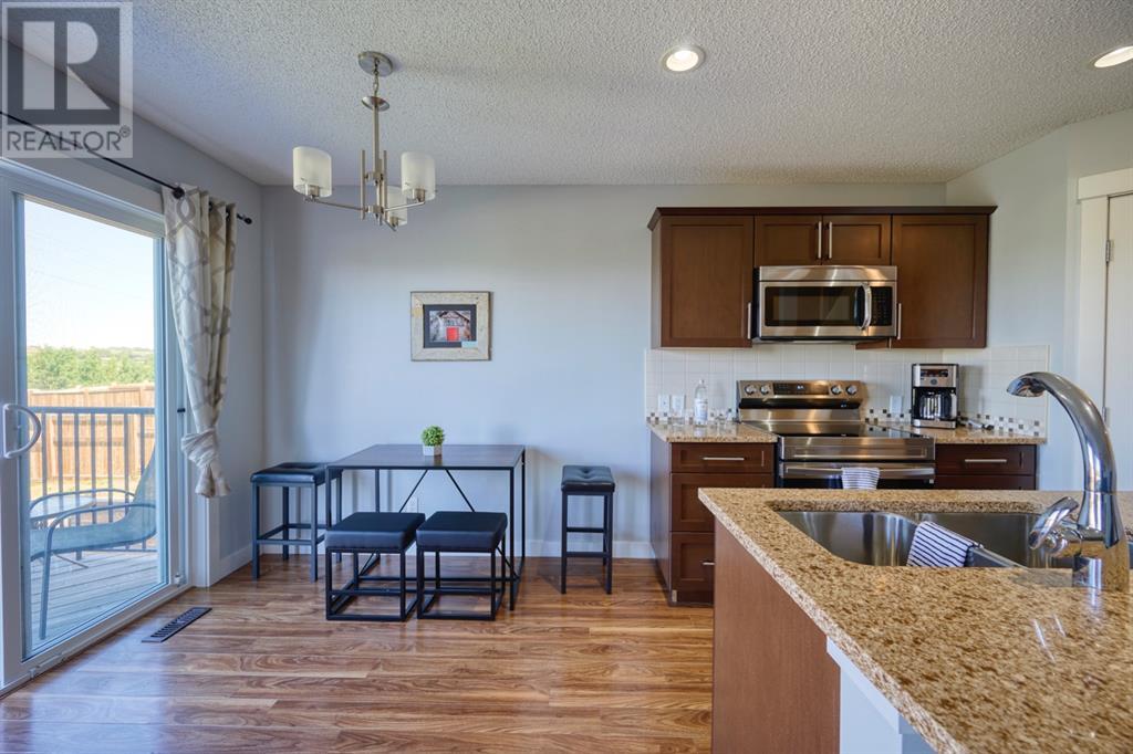SPECTACULAR and unobstructed MOUNTAIN VIEWS from this beautiful home in sought after Sunset Ridge in Cochrane. The MASSIVE backyard is big and private with no neighbours behind. This amazing home has been freshly PAINTED and has NEW Luxury Vinyl Plank flooring and NEW carpet upstairs. The BRIGHT and OPEN concept is perfect for entertaining! The large kitchen has STAINLESS appliances ( NEW fridge and stove), GRANITE countertops and an ISLAND. There is a large dining area with a patio door that leads to your DECK with stunning MOUNTAIN views with a natural gas hook up on the deck. The large living room will accommodate plenty of furniture. Upstairs you will find a master retreat with a walk-in closet and an EN-SUITE and a walk in closet. There are 2 more bedrooms, another full bathroom and laundry on the top floor. The WALKOUT basement is FINISHED with an illegal SUITE. The yard is perfect for entertaining and having fun with the family with a a small storage shed in backyard. Taking us back into the house there is an OVERSIZED single ATTACHED GARAGE that is drywalled and insulated. Easy access to both the city, the mountains and walking distance to Ranchview school... Don’t miss out on this AMAZING home at great price! (id:22211)