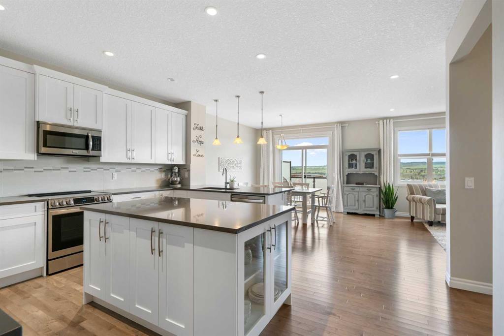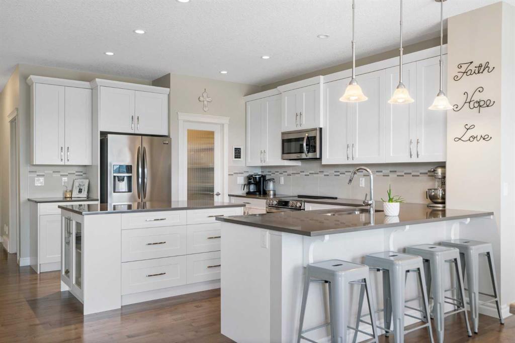 This extraordinary find in the community of Heritage Hills is tasteful, timeless, and ready for your family! Fully finished on all levels with 5 BEDROOMS there is plenty of room to spread out comfortably in this AIR CONDITIONED home with SOUTH VIEWS. The Kitchen features modern white cabinetry, quartz counters, stainless steel appliances, a large walk-in pantry, and not just one island, but TWO ISLANDS, one with tons of storage, and the other with room for seating - perfect for hosting and entertaining. With huge windows and access to your back deck, this main level with 9ft ceilings is bright, open, and the ideal place to watch those summer thunderstorms roll in over the mountains. On the second floor, the primary bedroom is a spacious oasis featuring a large walk-in closet, and a 5pc ensuite with dual vanities and a large soaker tub. This level includes a bonus room, laundry room, a 4pc bathroom and 3 ADDITIONAL BEDROOMS. In the FINISHED WALKOUT BASEMENT with 9ft ceilings, you will find the 5TH BEDROOM, ample storage, a 4pc bathroom, and the bright family room. With access to the large backyard, your family will have trouble deciding which floor to spend time together on! This beautiful, well-maintained 2 Storey also features built-ins throughout the home for convenience and thoughtful use of space. (id:22211)