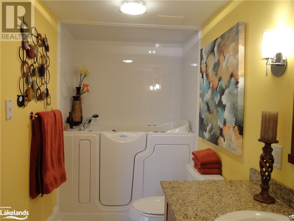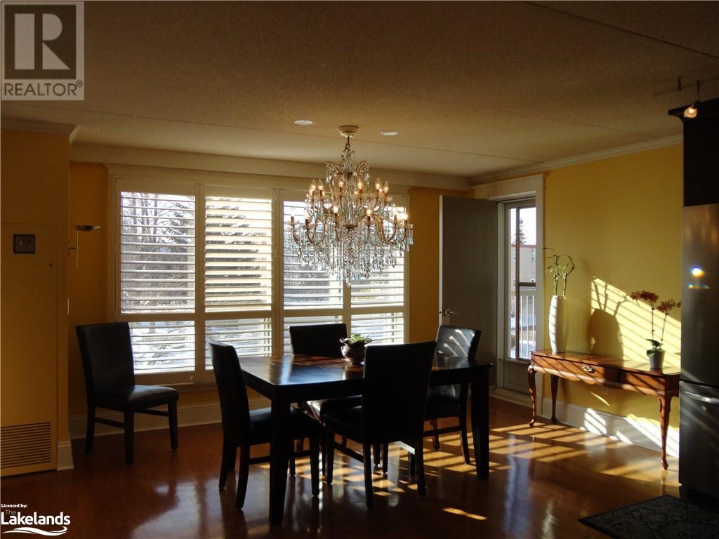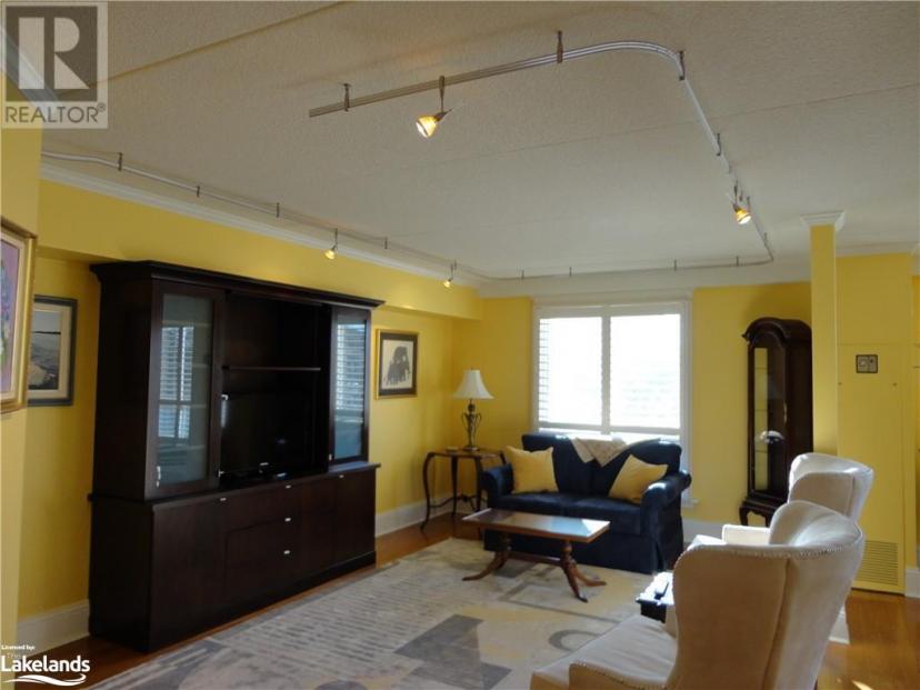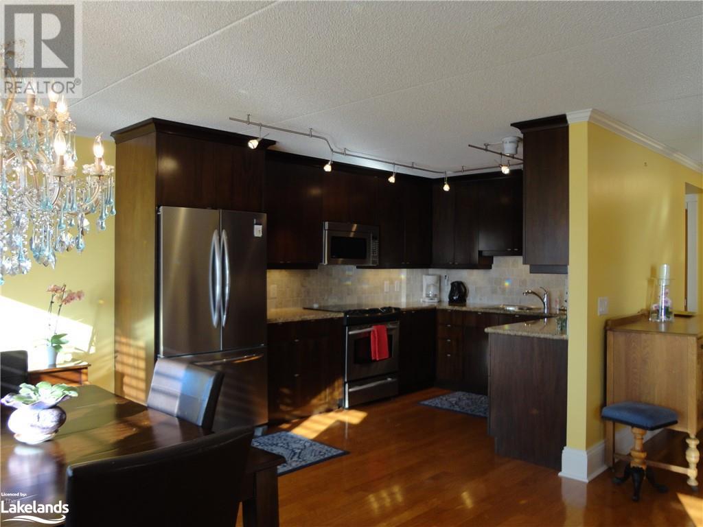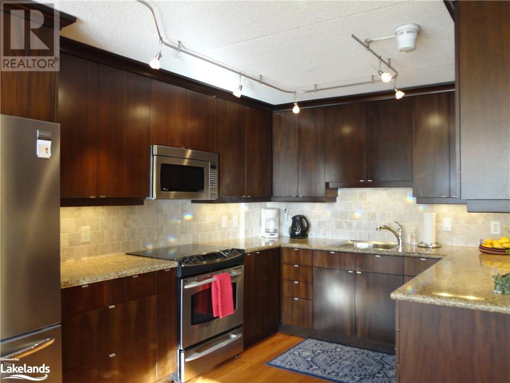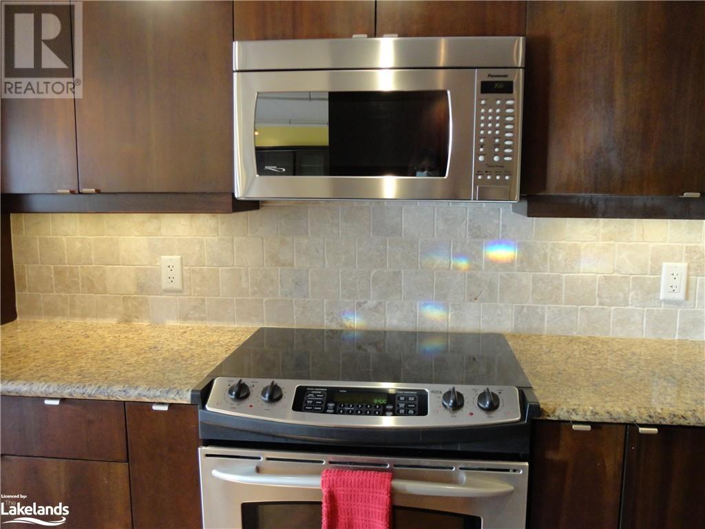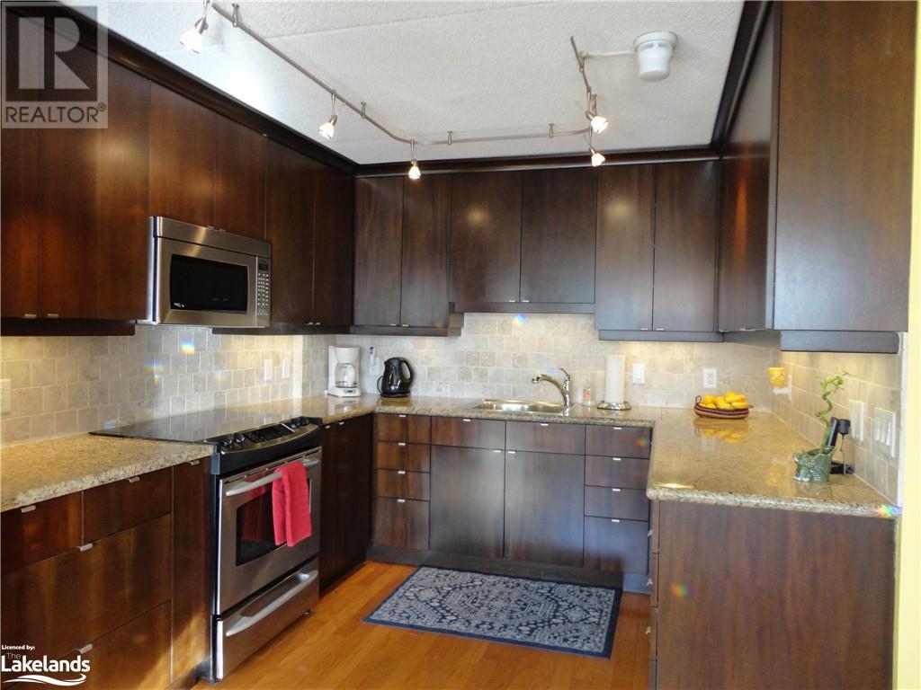 Seasonal/Short Term Rental at The Galleries. This two bedroom, 2 bath one with walk in tub, plus den fully furnished and equipped condo is ready for your rental needs. Fully equipped kitchen with high end appliances, granite counter tops has all the necessary items you would need and more. Beautiful real hardwood flooring, California shutters throughout in this open layout. Large balcony facing Blue Mountain to enjoy those sunny days with access from both bedrooms and dining room.. Redesigned and renovated a few years ago to accommodate 36 wide door openings for those that require the use of an assistive device. Includes one underground parking spot and visitor parking lot. The building features an exercise room, sauna, guest suite, security system and on-site superintendent. Close to all the amenities in town. Rent is all inclusive and includes cable and internet. Security Deposit of $2,500 required. Available immediately till June 10th or after September 20th onwards. (id:22211)