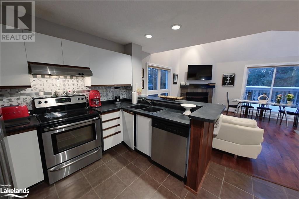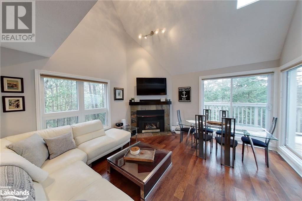 This great end unit townhouse features an open concept kitchen, dining and living space with stunning vaulted ceilings with sky light allow for lots of natural light. Completing the main floor living space are the gas fireplace and large balcony with a seating area for relaxing or entertaining. The main floor also includes one excellent sized bedroom, one full bathroom and laundry. The loft style primary bedroom and ensuite boasts plenty of room and storage. All this just minutes to downtown Collingwood, the base of Blue Mountain and the many local amenities. Book your showing today.. (id:22211)
