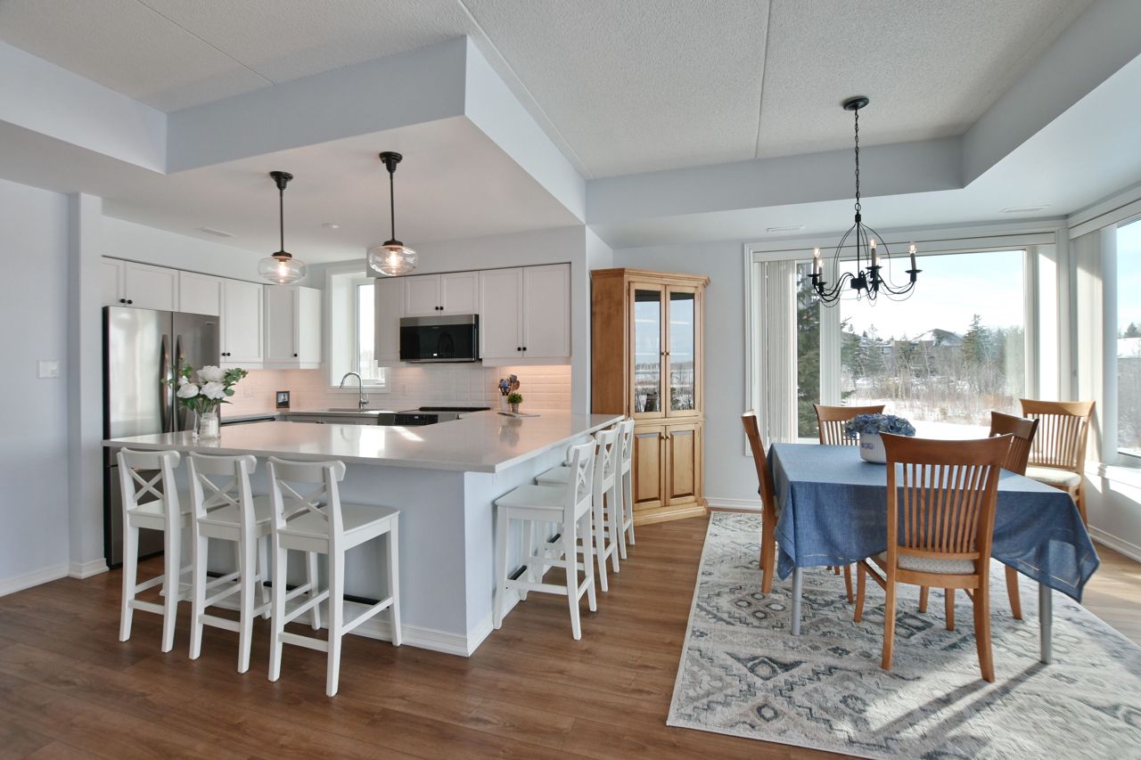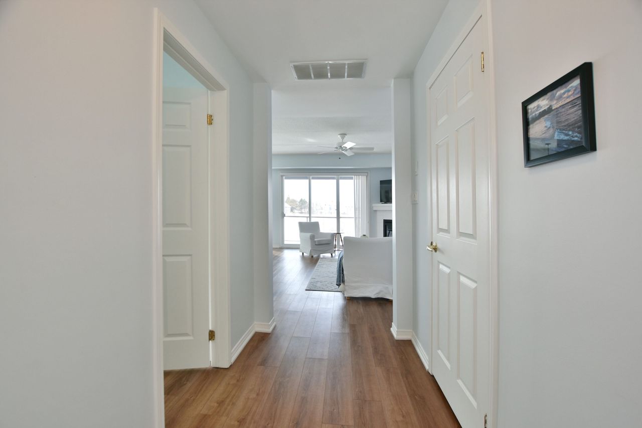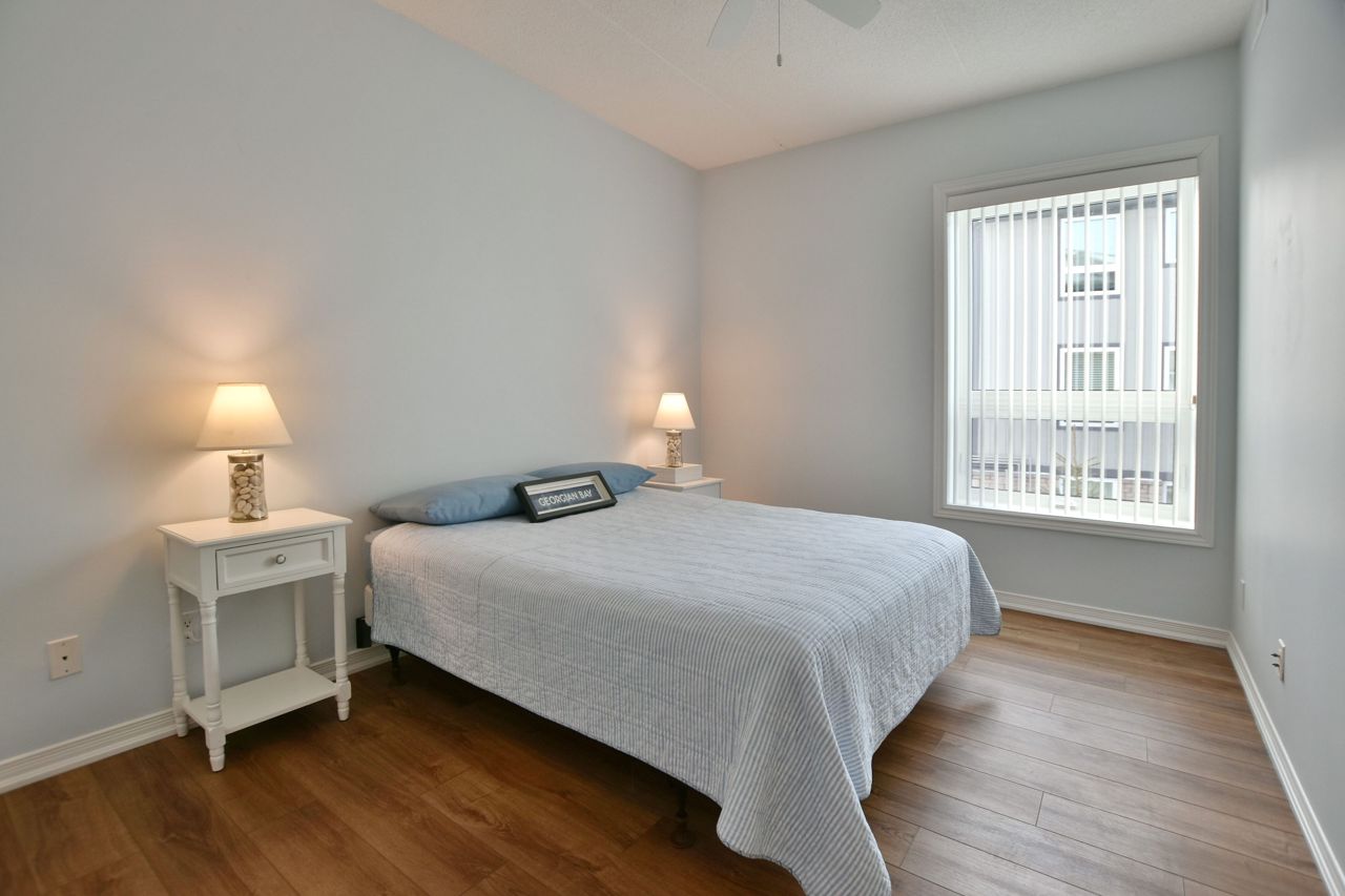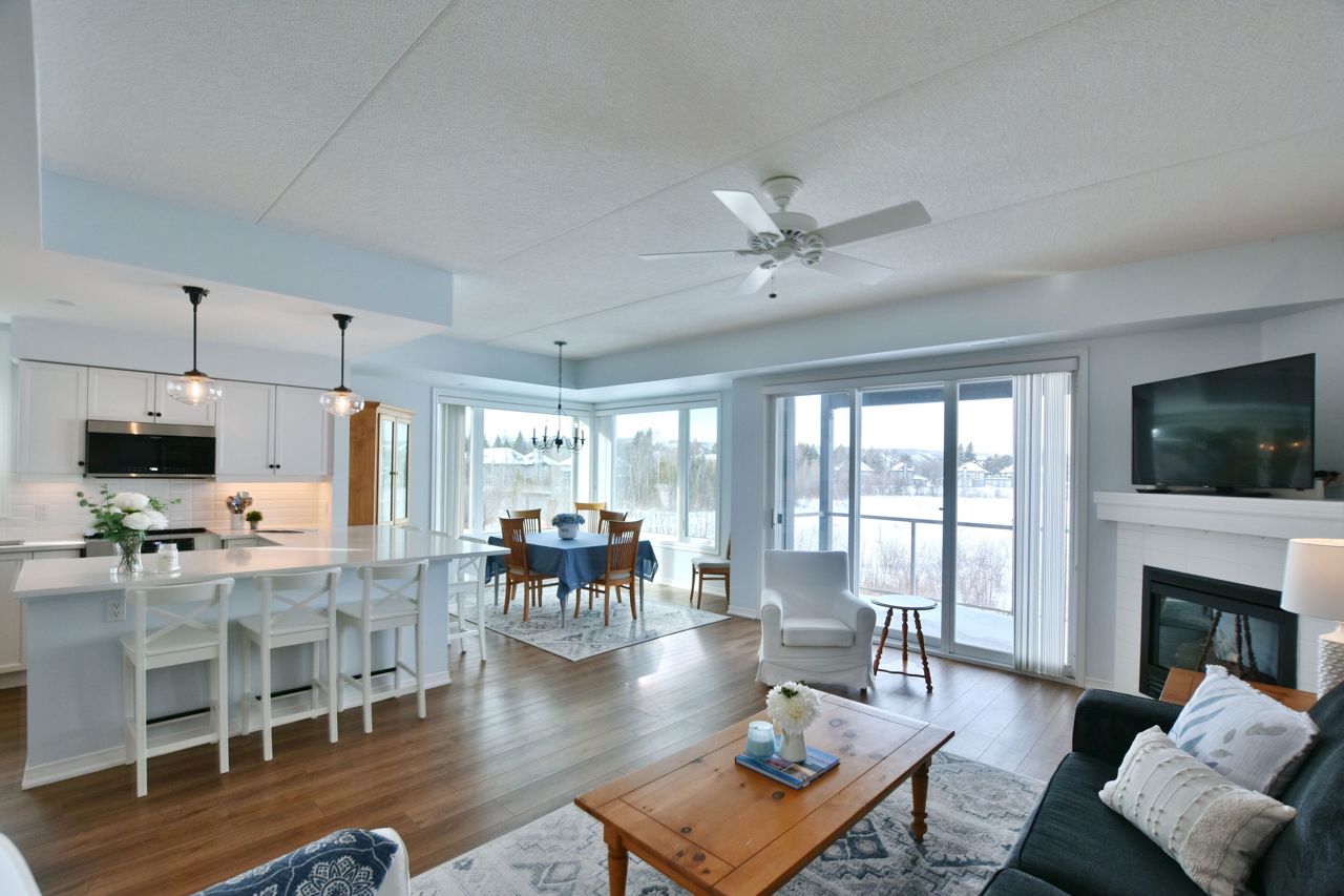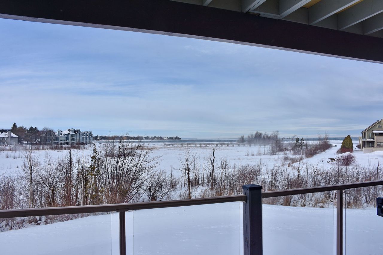 LIGHTHOUSE POINT Second level Spacious Unobstructed Water View Corner Unit. This freshly upgraded residence features Beautiful Panoramic Views Of Georgian Bay & Blue Mountain. 3 Bedrooms and 2 Baths, an open concept Living, Dining and Kitchen with gleaming quartz countertops, and four appliances. Enjoy the breathtaking sunset and views towards the water from your expansive west-facing windows and Large 8'X16' Balcony patio, connected to the Living Room, featuring a gas fireplace. The Primary Bedroom is equipped with a 3-piece ensuite, while the 2 additional Guest Bedrooms enjoy a 4-piece separate Bathroom. Additional storage located beside the unit with it's own locked door, further storage located in the building across. The resort-like experience continues with access to 9 tennis courts, 4 pickleball courts, 2 outdoor swimming pools, 2 sandy beaches, over a mile of winding nature trails, 10 acres of protected natural beauty, marina facilities, and a recreation center that houses an indoor pool, rejuvenating spas, a sauna, well-equipped gym, games room, library, inviting outdoor patio seating, a social room graced by a grand piano, and more. Beautiful Sunsets! Resort Like Living! **EXTRAS** couch, dining room hutch, beds can be negotiated.