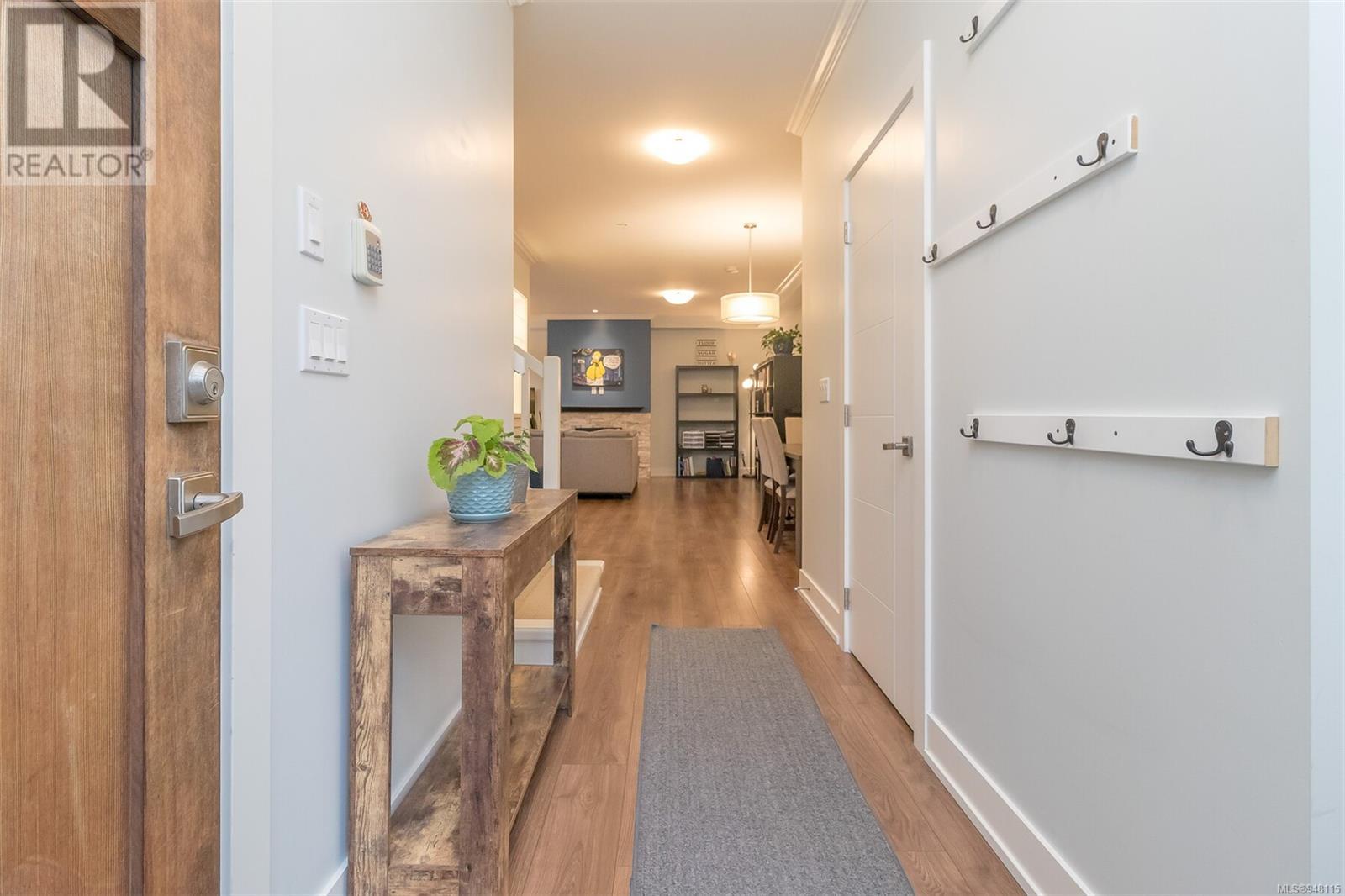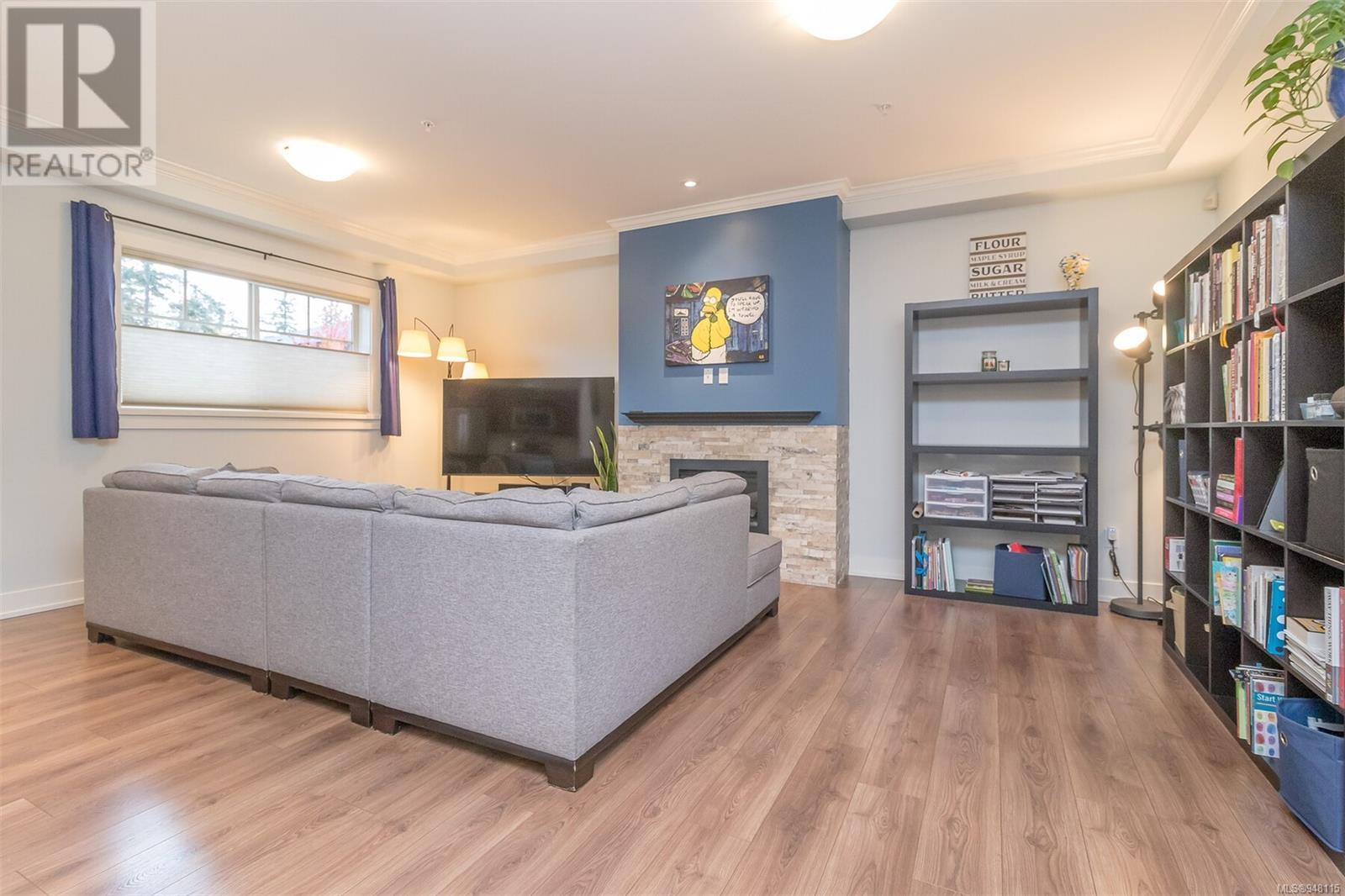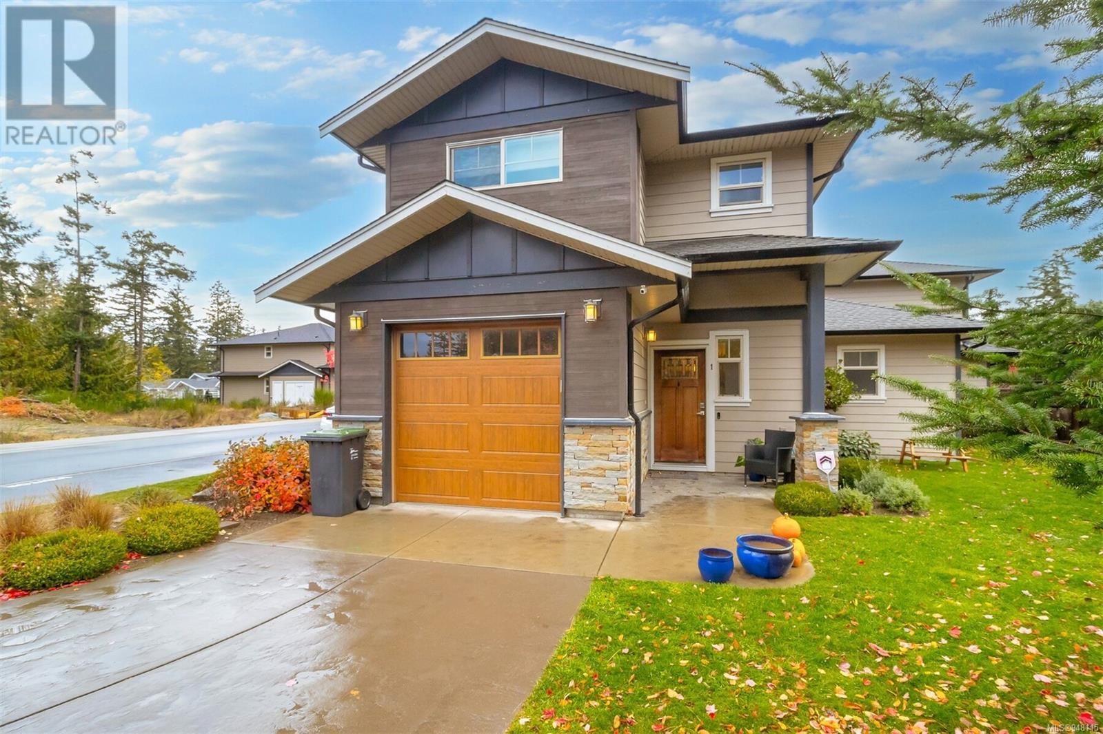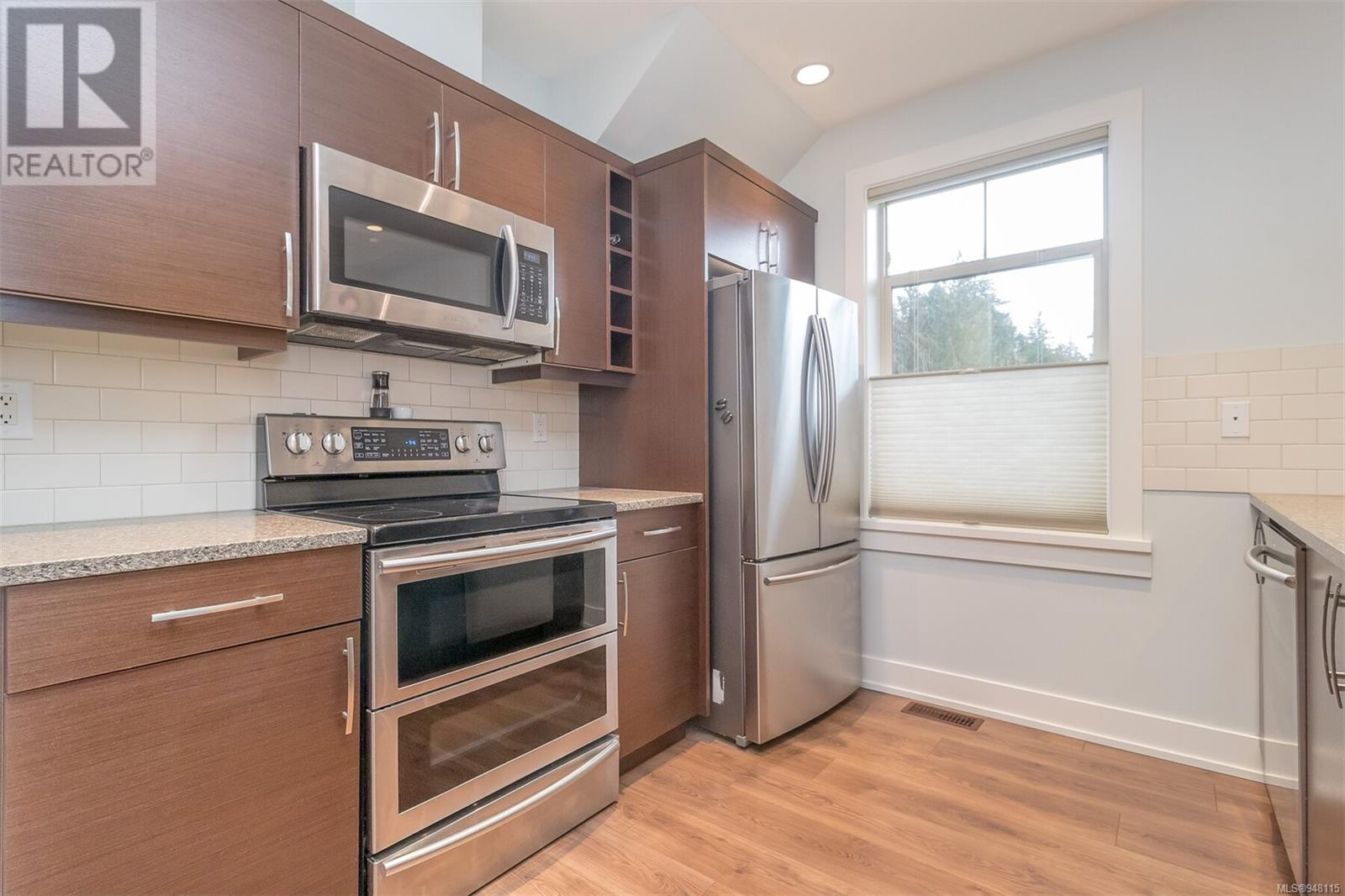 This gorgeous end unit townhome was the original show home at Latoria Heights Offering a unique, flexible floor plan, you have the choice of two primary bedrooms - either upstairs or down. The downstairs primary bedroom can also be a flex space as either an office/den, or a space for guests. Perfect home for entertaining, the kitchen overlooks the living and dining areas and features quartz countertops and upgraded appliances. Tall ceilings with crown molding on the main offers lots of natural light and gives it a nice open feeling. GeoThermal & A/C is a bonus! Lots of storage space with a huge crawlspace and a single car garage with two extra parking spots. Outside offers a private and peaceful patio space with lots of sunshine and great for relaxing. Located in the heart of Latoria and only a short distance to The Beachlands, Royal Bay, hiking, biking trails, sport fields and only minutes from central Langford. (id:22211)