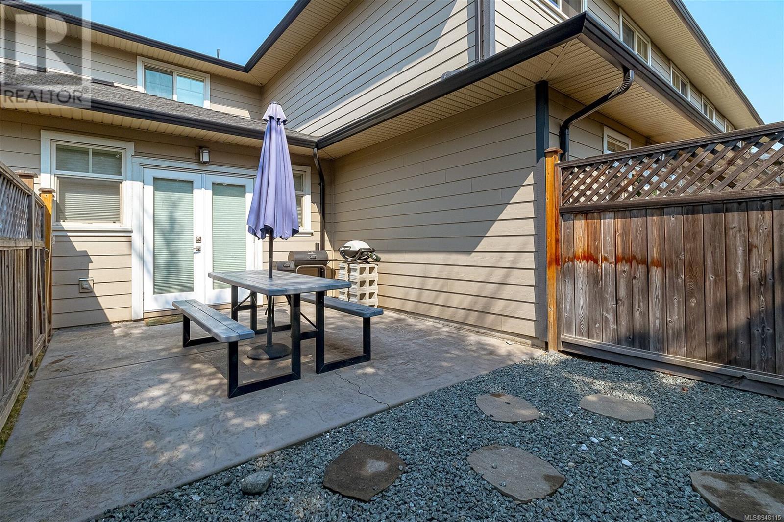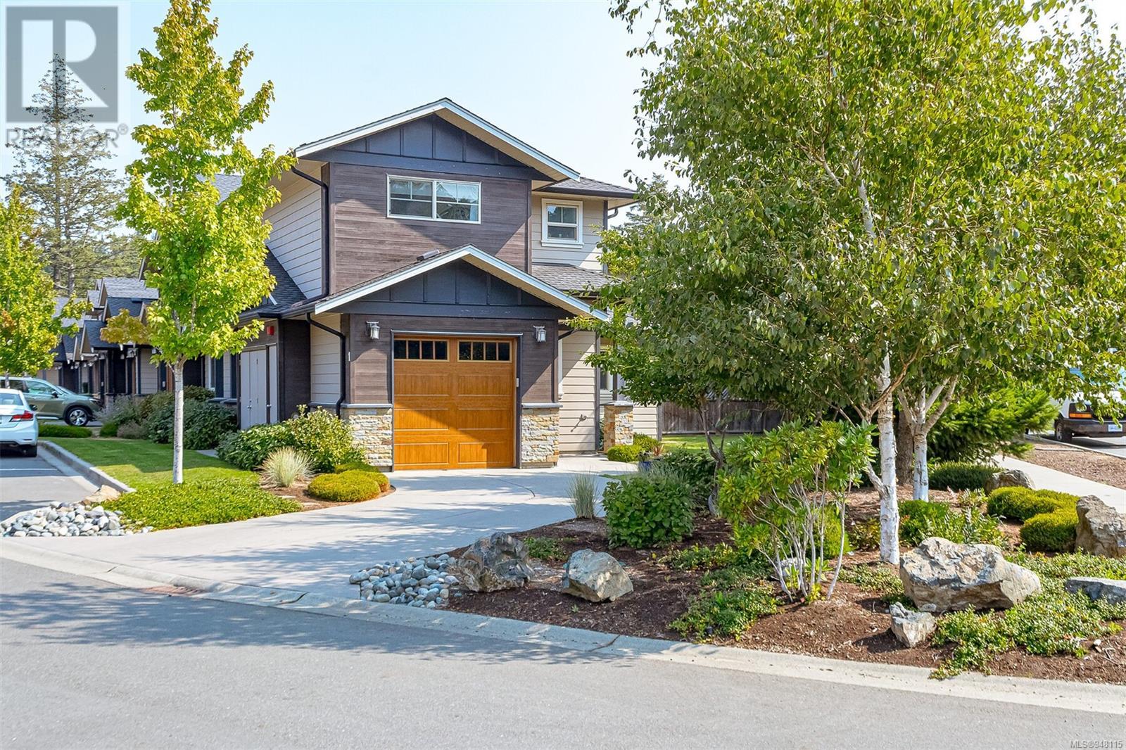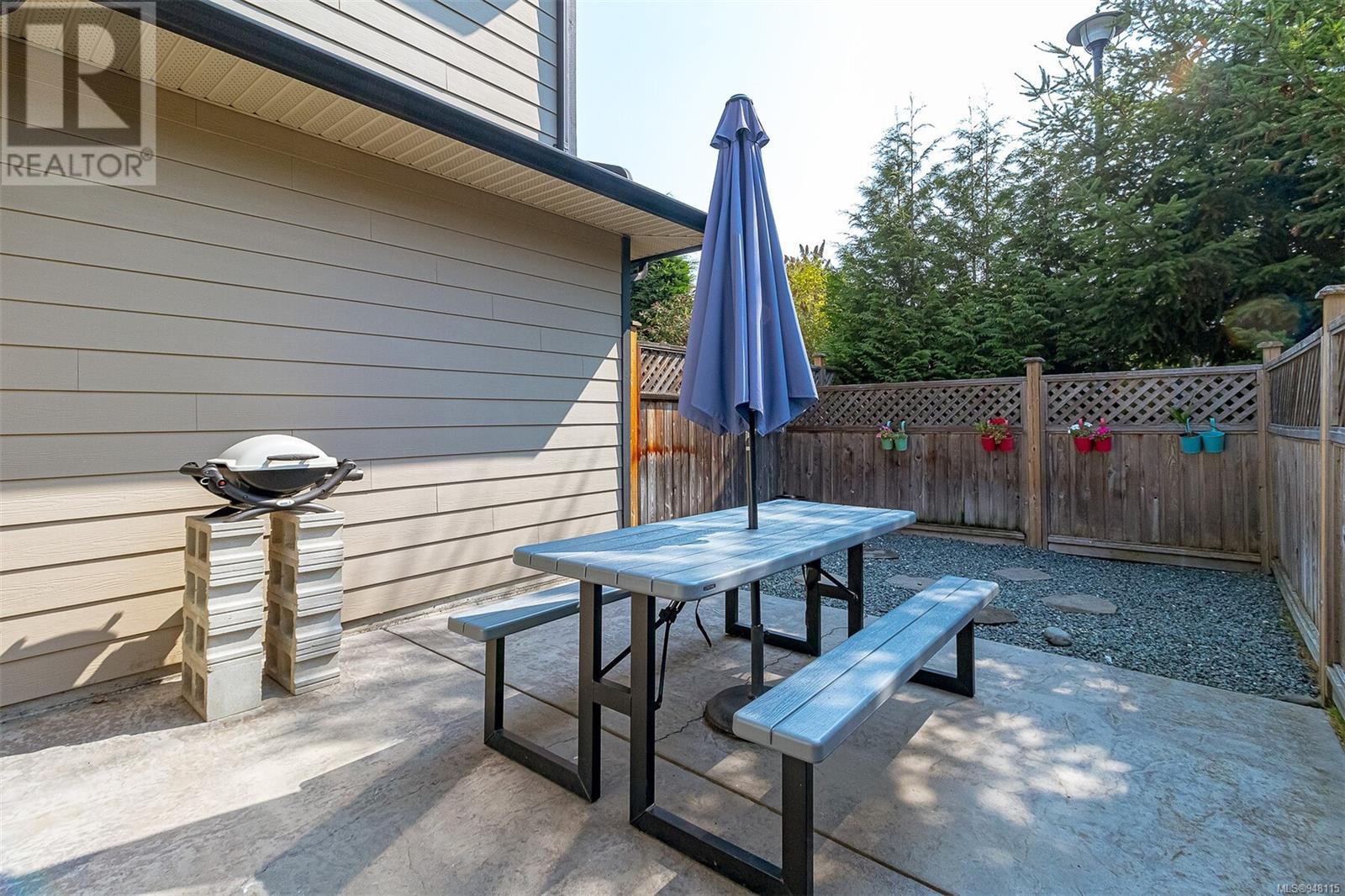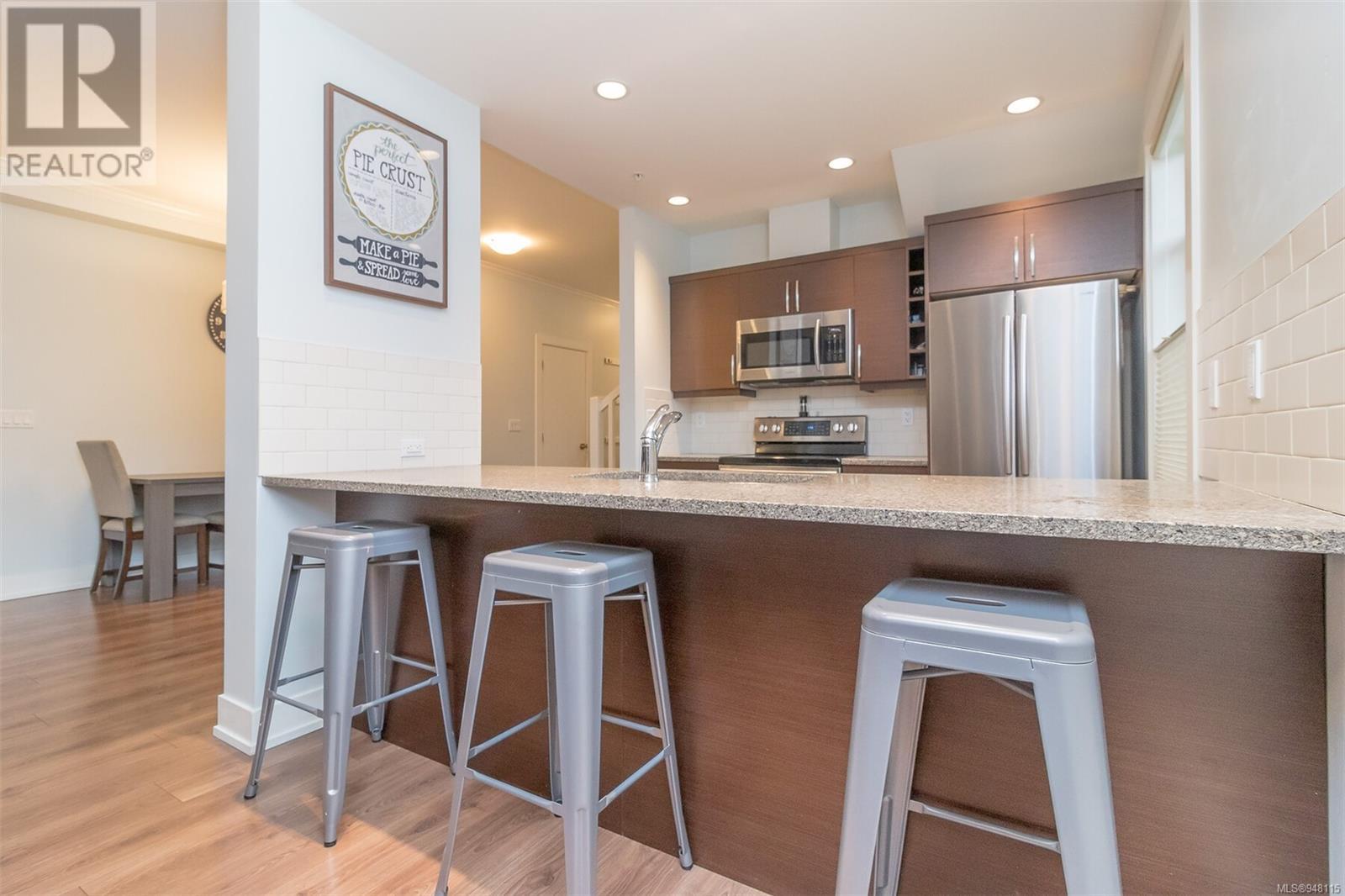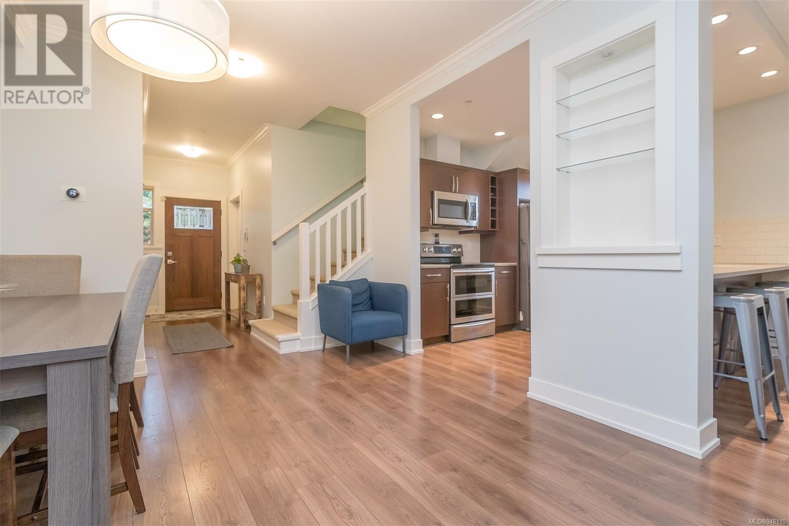 This gorgeous end unit townhome was the original show home at Latoria Heights Offering a unique, flexible floor plan, you have the choice of two primary bedrooms - either upstairs or down. The downstairs primary bedroom can also be a flex space as either an office/den, or a space for guests. Perfect home for entertaining, the kitchen overlooks the living and dining areas and features quartz countertops and upgraded appliances. Tall ceilings with crown molding on the main offers lots of natural light and gives it a nice open feeling. GeoThermal & A/C is a bonus! Lots of storage space with a huge crawlspace and a single car garage with two extra parking spots. Outside offers a private and peaceful patio space with lots of sunshine and great for relaxing. Located in the heart of Latoria and only a short distance to The Beachlands, Royal Bay, hiking, biking trails, sport fields and only minutes from central Langford. (id:22211)
