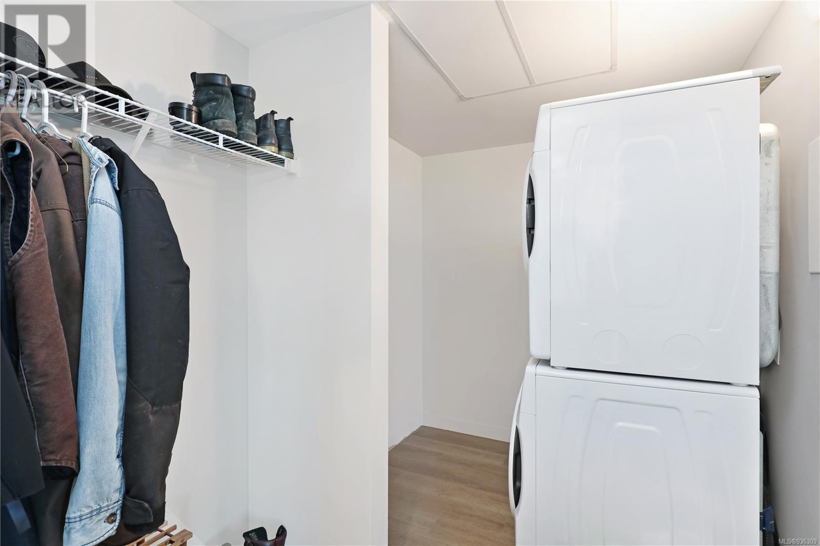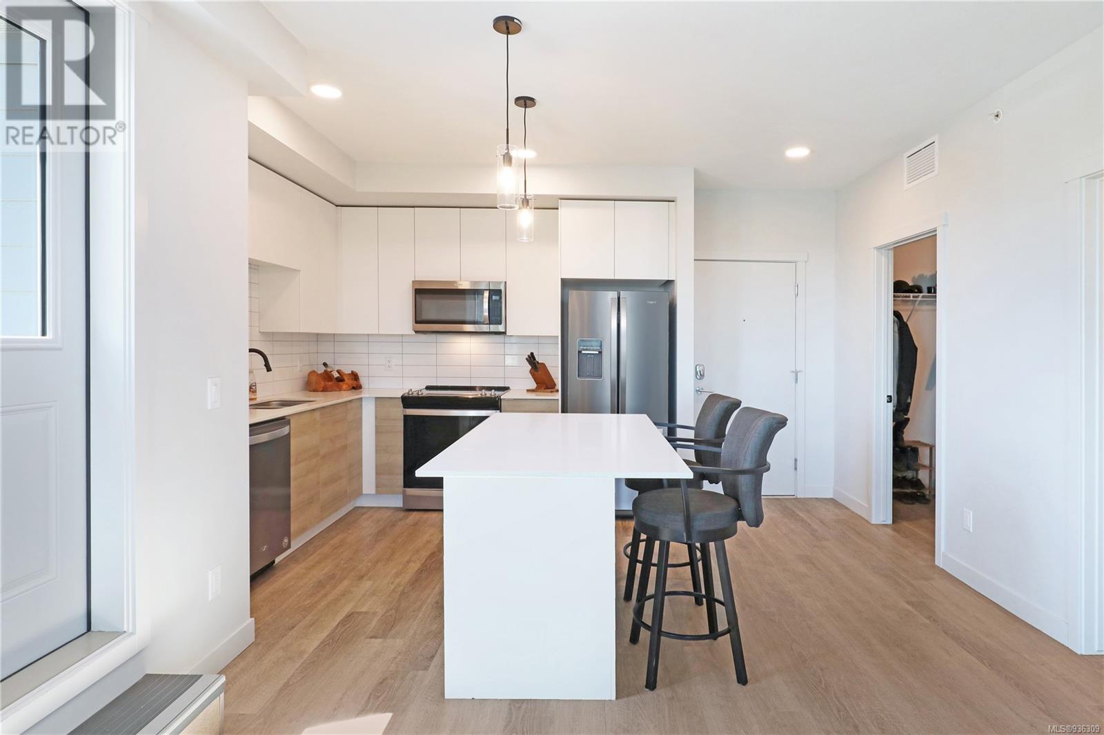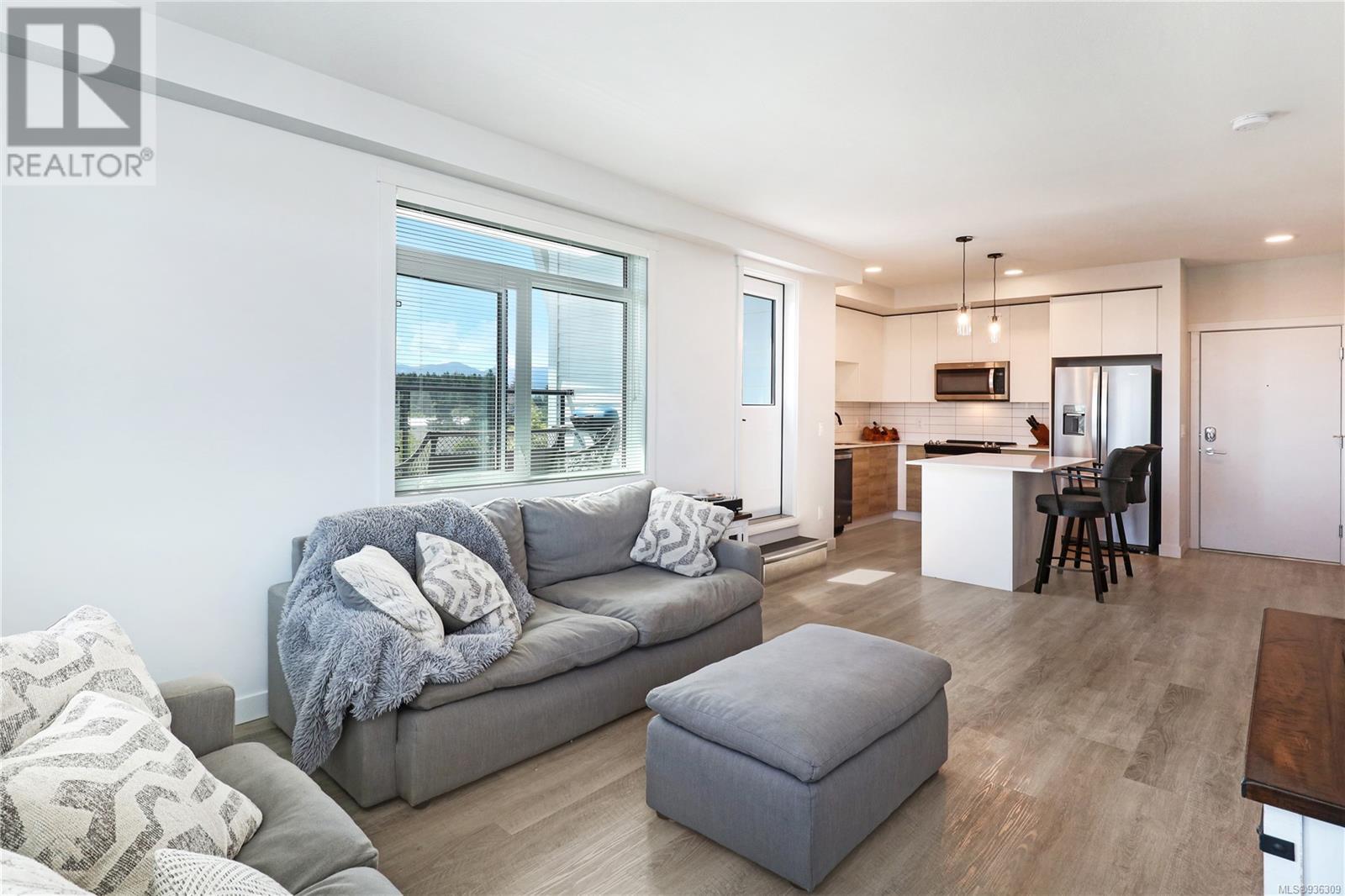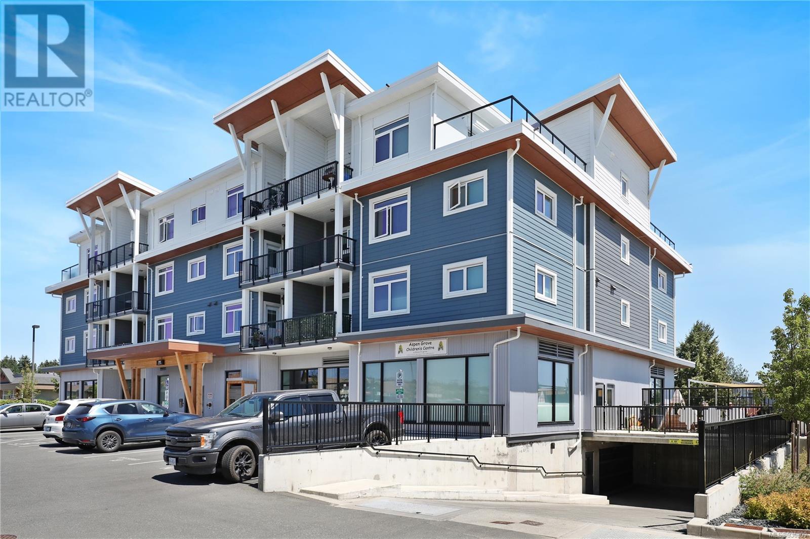 Welcome to Aurora, a 2 year old luxury condo complex in the heart of Comox. This modern corner penthouse condo includes 1 Bed and 1 Bath plus 2 south facing balconies, high end finishes and 694 square feet of easy living space. Step inside to be greeted by an open concept design that blends the living, dining, and kitchen areas. kitchen includes soft close cabinetry, sleek quartz countertops in the kitchen and bathroom, ample storage, and stainless steel appliances. The living area is bathed in natural light that pours in through large windows on 2 sides. From here, step out onto one of the two south-facing balconies and experience amazing views that stretch from the coastal range, ocean view and the Comox Glacier. This Building is secure with FOB access at all entrances and solar panels on the roof to off set the electricity for the common property. 2 Pets are allowed, as are Rentals, and close to many amenities including grocery, pharmacy and walking trails. (id:22211)