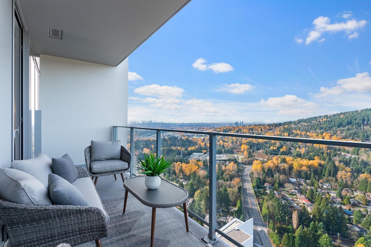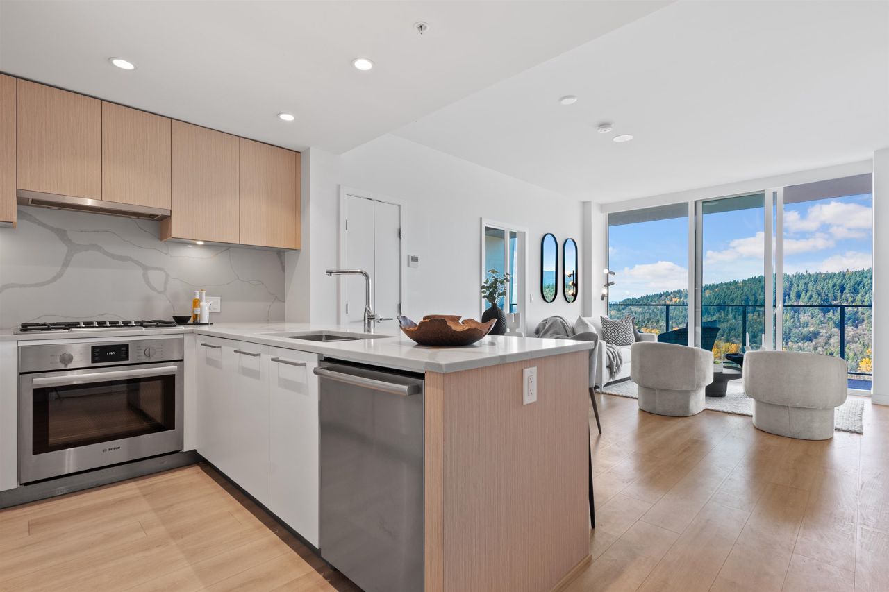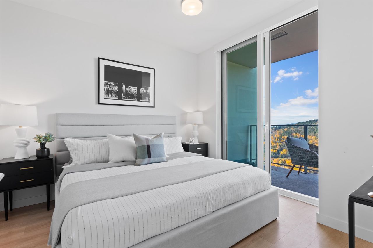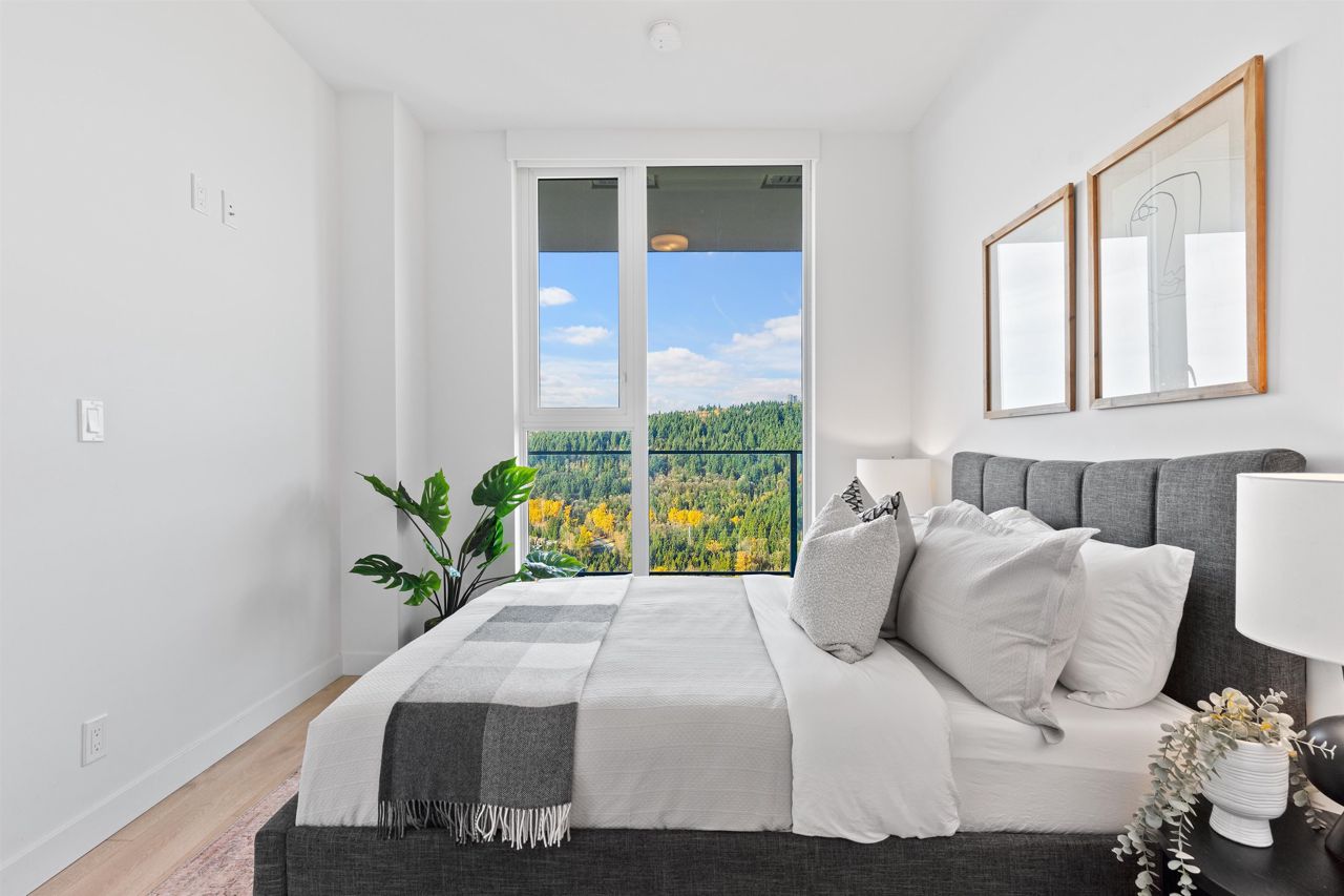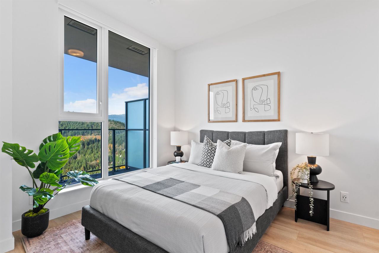 Beautiful forested and city views from this home in Coquitlam’s tallest tower: Clarke + Como. This 2-bed, 2-bath + office suite offers the perfect floor plan. Bedrooms are on opposite sides (both with ensuites), large full-width balcony, AC, and 9’ ceilings. The kitchen features Bosch and Fisher & Paykel appliances, ample storage, and gorgeous marble backsplash. The primary en-suite easily accommodates a couple with spacious double floating vanity and a ton of storage. Tucked away is an office for those WFH. The complex offers over 20,000 sqft of amenities including Sky Lounge (49th floor), guest suites, sauna, basketball court, karaoke, and concierge. Built by MARCON still under the remaining 5-10 warranty. Steps to Burquitlam station. Includes 1 parking and 1 storage locker.