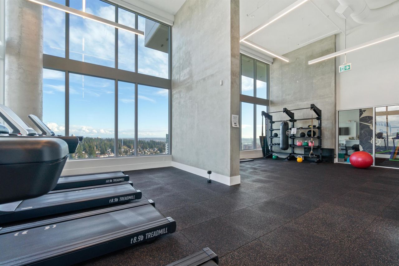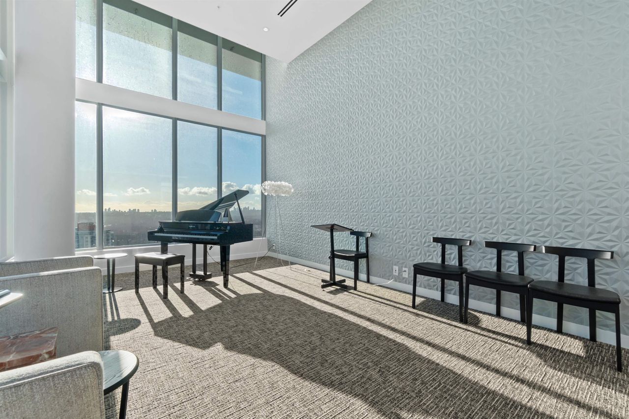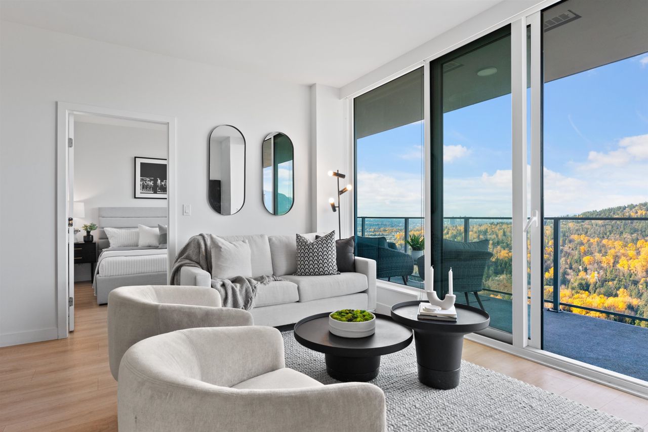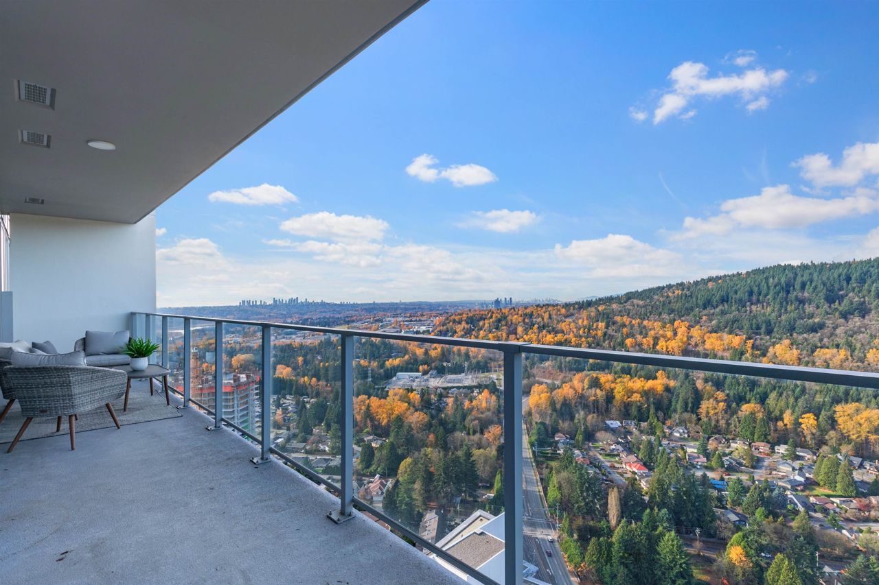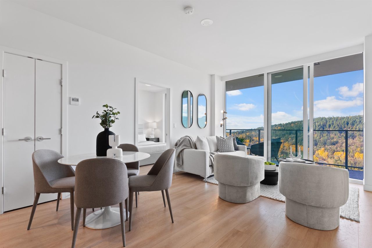 Beautiful forested and city views from this home in Coquitlam’s tallest tower: Clarke + Como. This 2-bed, 2-bath + office suite offers the perfect floor plan. Bedrooms are on opposite sides (both with ensuites), large full-width balcony, AC, and 9’ ceilings. The kitchen features Bosch and Fisher & Paykel appliances, ample storage, and gorgeous marble backsplash. The primary en-suite easily accommodates a couple with spacious double floating vanity and a ton of storage. Tucked away is an office for those WFH. The complex offers over 20,000 sqft of amenities including Sky Lounge (49th floor), guest suites, sauna, basketball court, karaoke, and concierge. Built by MARCON still under the remaining 5-10 warranty. Steps to Burquitlam station. Includes 1 parking and 1 storage locker.