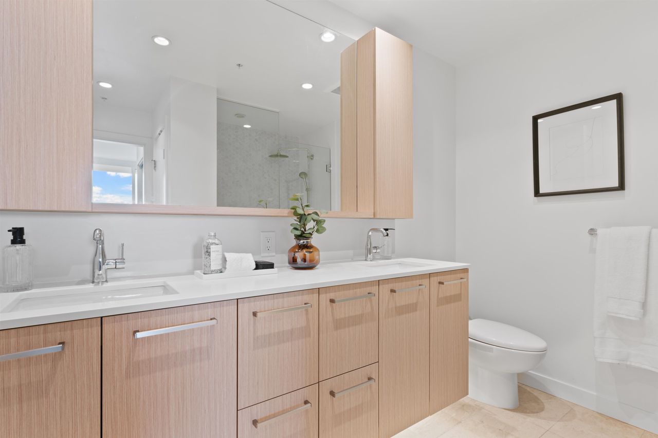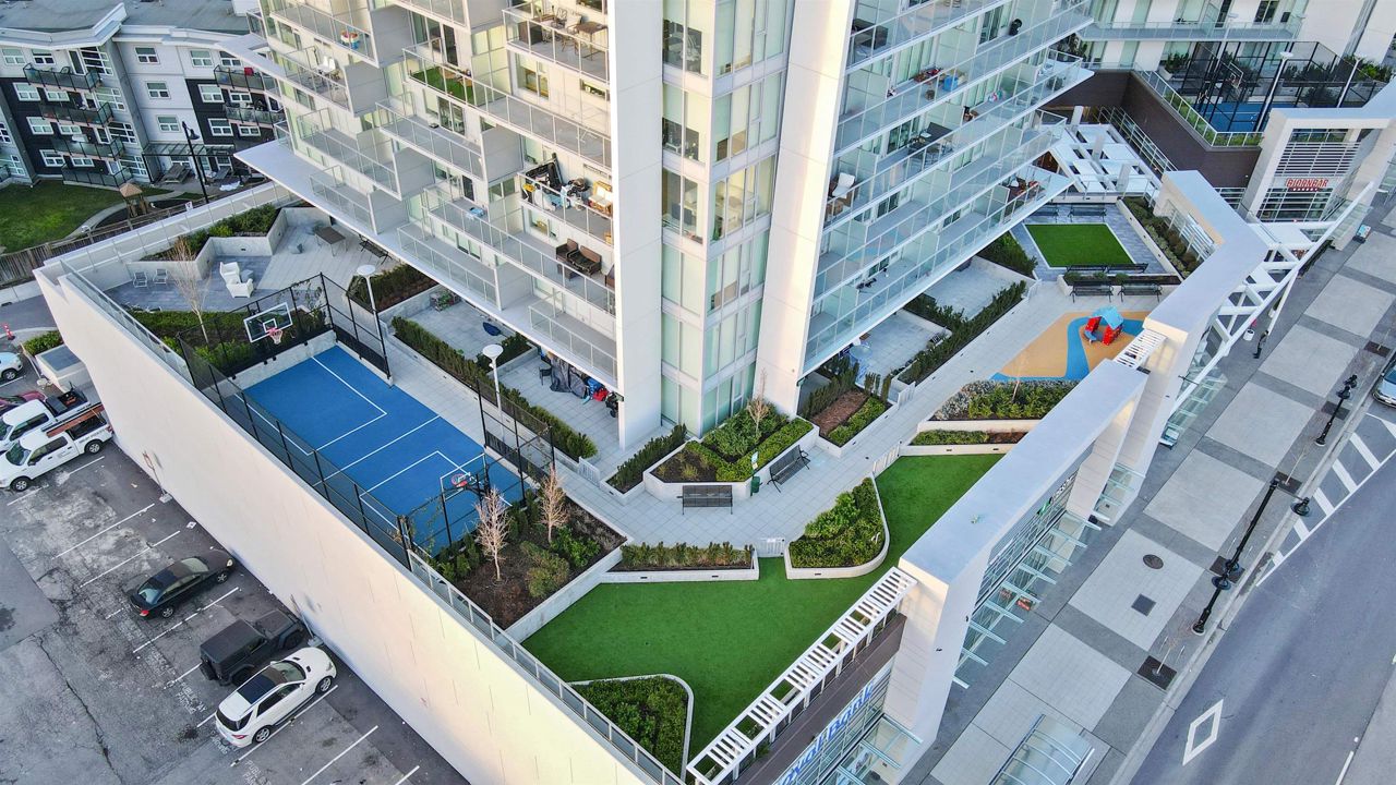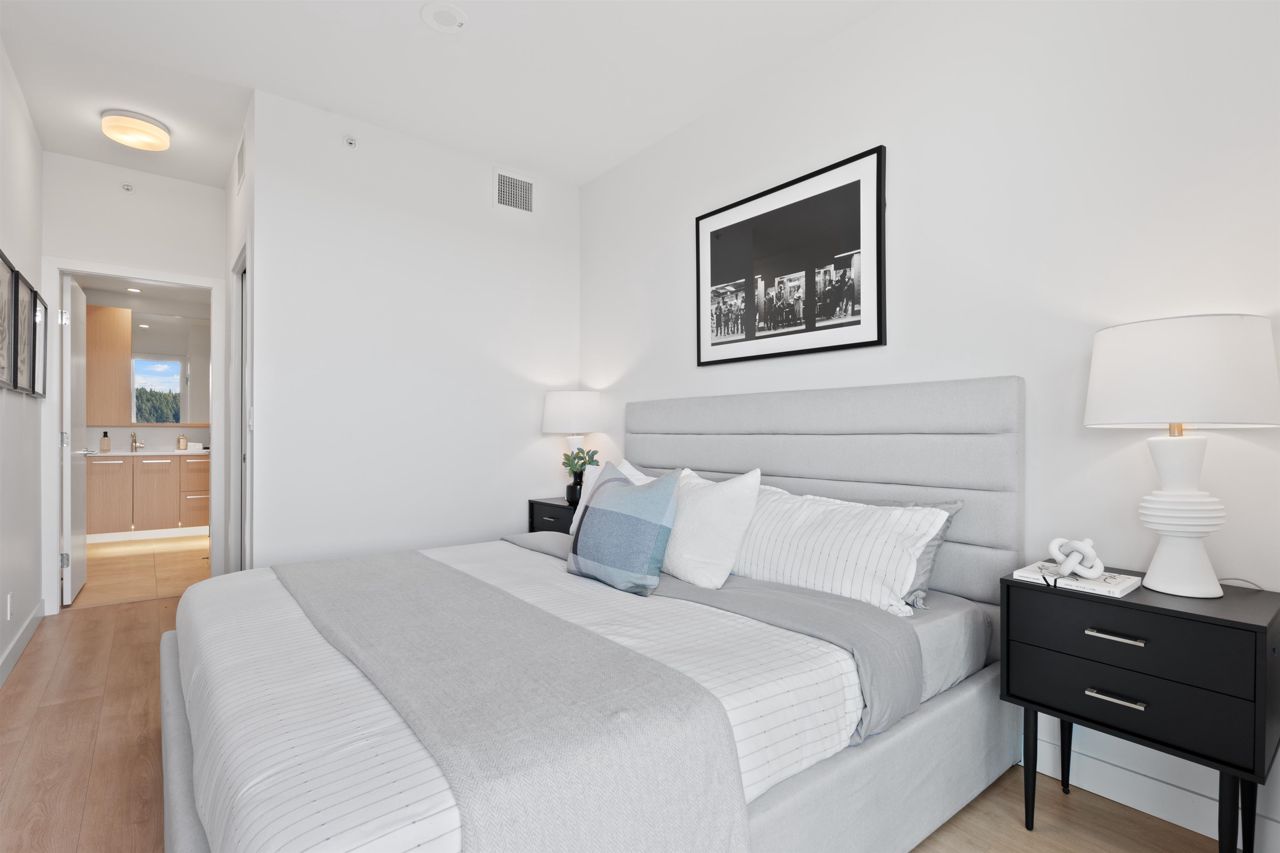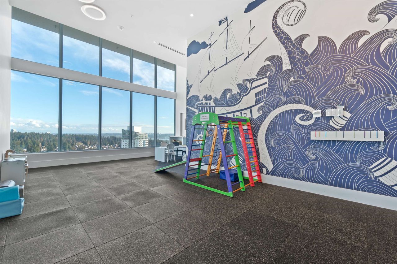 Beautiful forested and city views from this home in Coquitlam’s tallest tower: Clarke + Como. This 2-bed, 2-bath + office suite offers the perfect floor plan. Bedrooms are on opposite sides (both with ensuites), large full-width balcony, AC, and 9’ ceilings. The kitchen features Bosch and Fisher & Paykel appliances, ample storage, and gorgeous marble backsplash. The primary en-suite easily accommodates a couple with spacious double floating vanity and a ton of storage. Tucked away is an office for those WFH. The complex offers over 20,000 sqft of amenities including Sky Lounge (49th floor), guest suites, sauna, basketball court, karaoke, and concierge. Built by MARCON still under the remaining 5-10 warranty. Steps to Burquitlam station. Includes 1 parking and 1 storage locker.