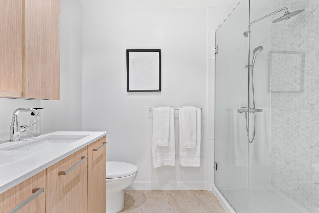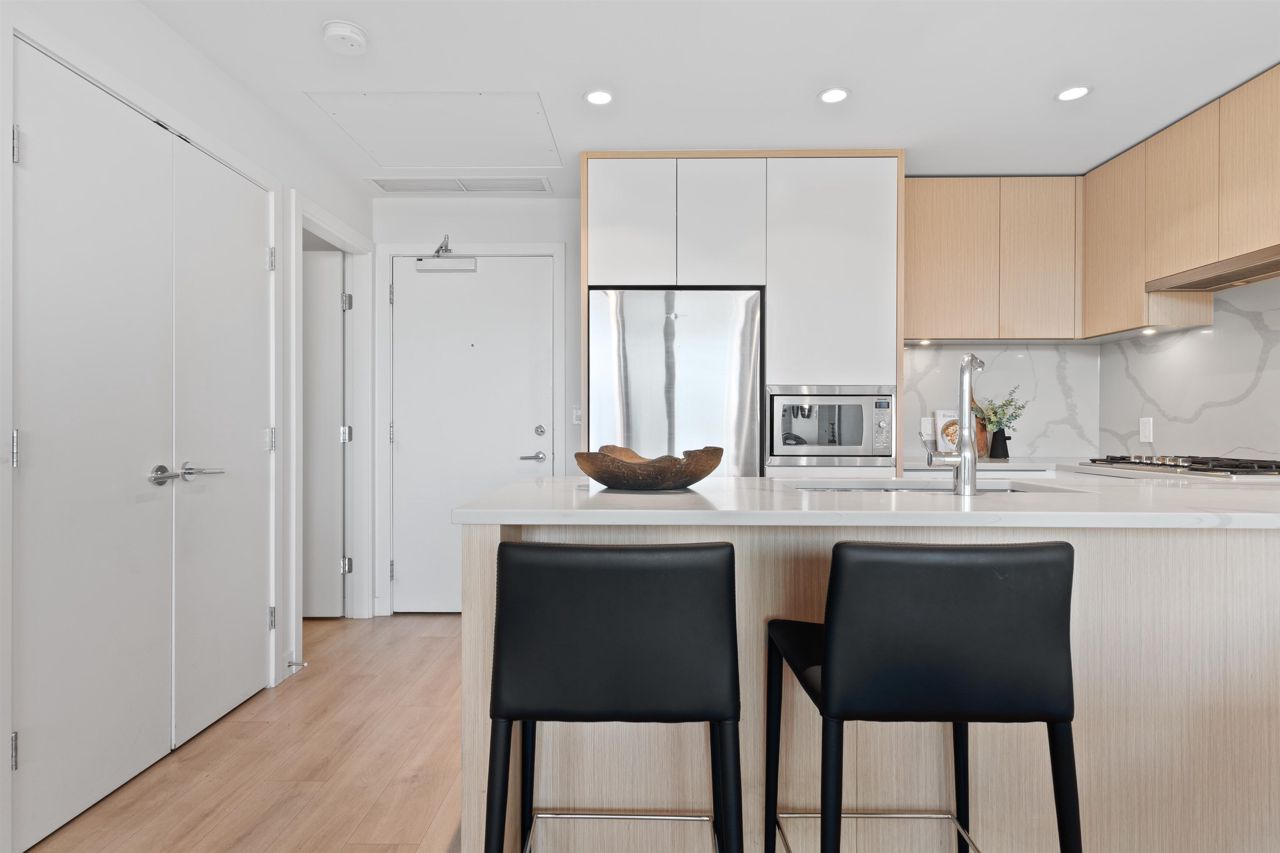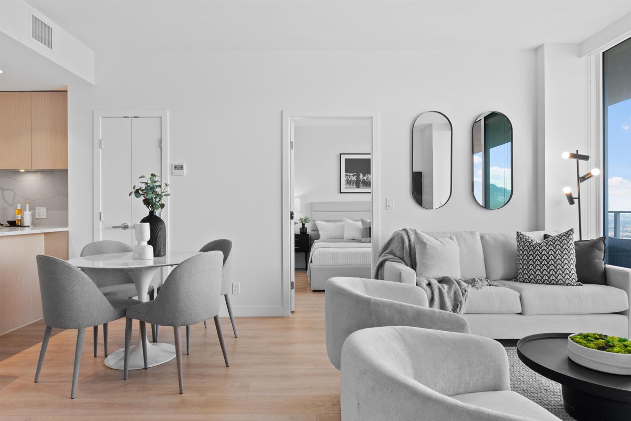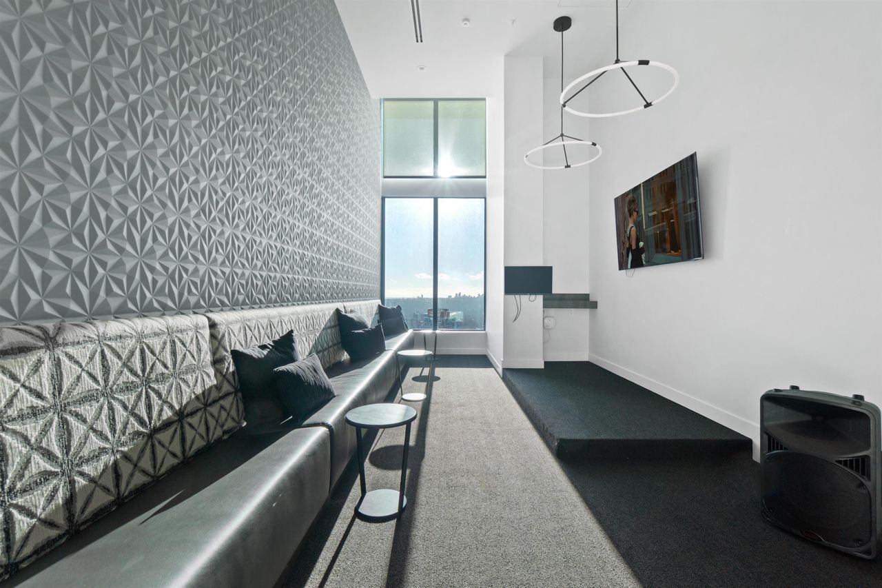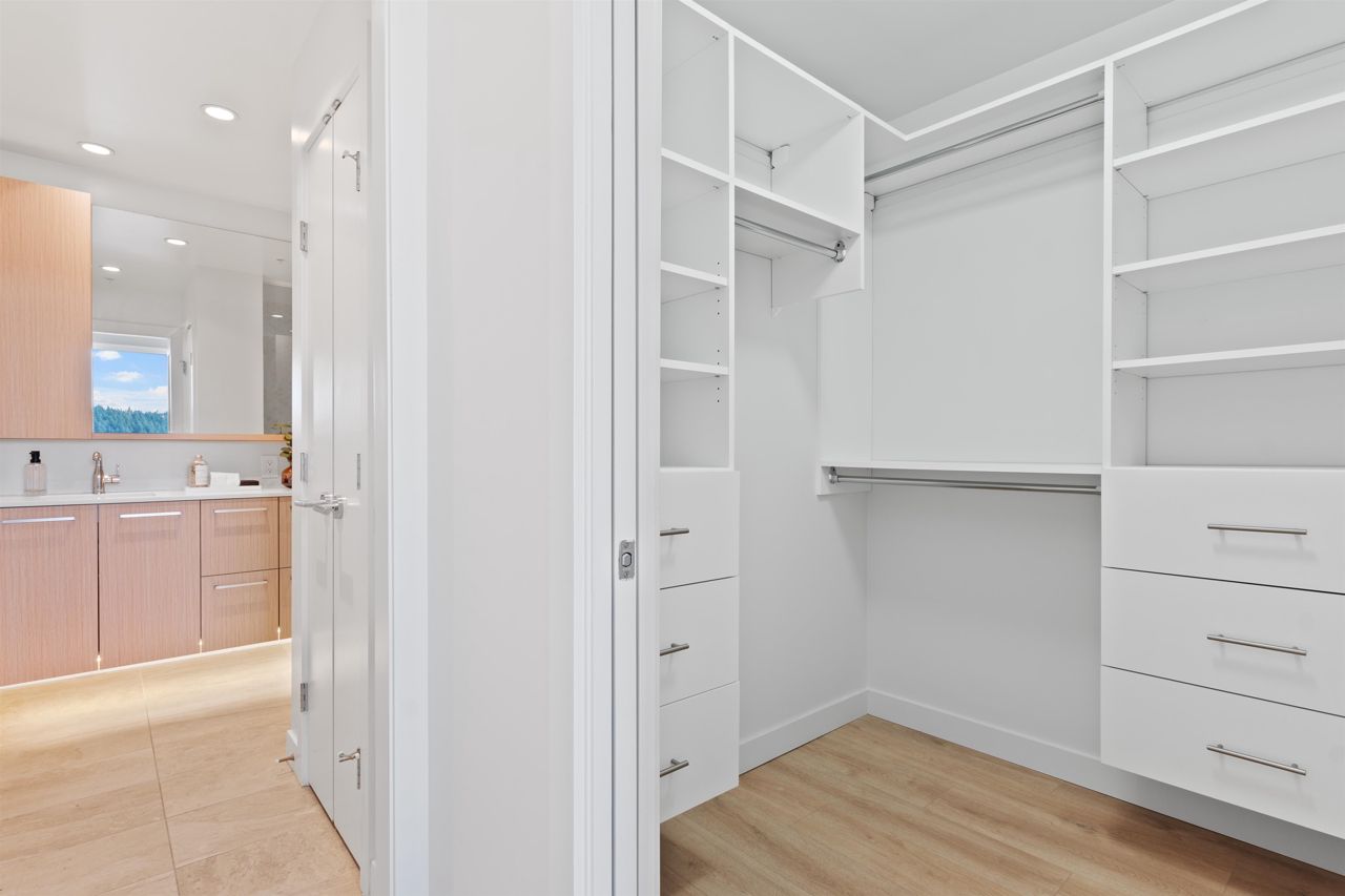 Beautiful forested and city views from this home in Coquitlam’s tallest tower: Clarke + Como. This 2-bed, 2-bath + office suite offers the perfect floor plan. Bedrooms are on opposite sides (both with ensuites), large full-width balcony, AC, and 9’ ceilings. The kitchen features Bosch and Fisher & Paykel appliances, ample storage, and gorgeous marble backsplash. The primary en-suite easily accommodates a couple with spacious double floating vanity and a ton of storage. Tucked away is an office for those WFH. The complex offers over 20,000 sqft of amenities including Sky Lounge (49th floor), guest suites, sauna, basketball court, karaoke, and concierge. Built by MARCON still under the remaining 5-10 warranty. Steps to Burquitlam station. Includes 1 parking and 1 storage locker.