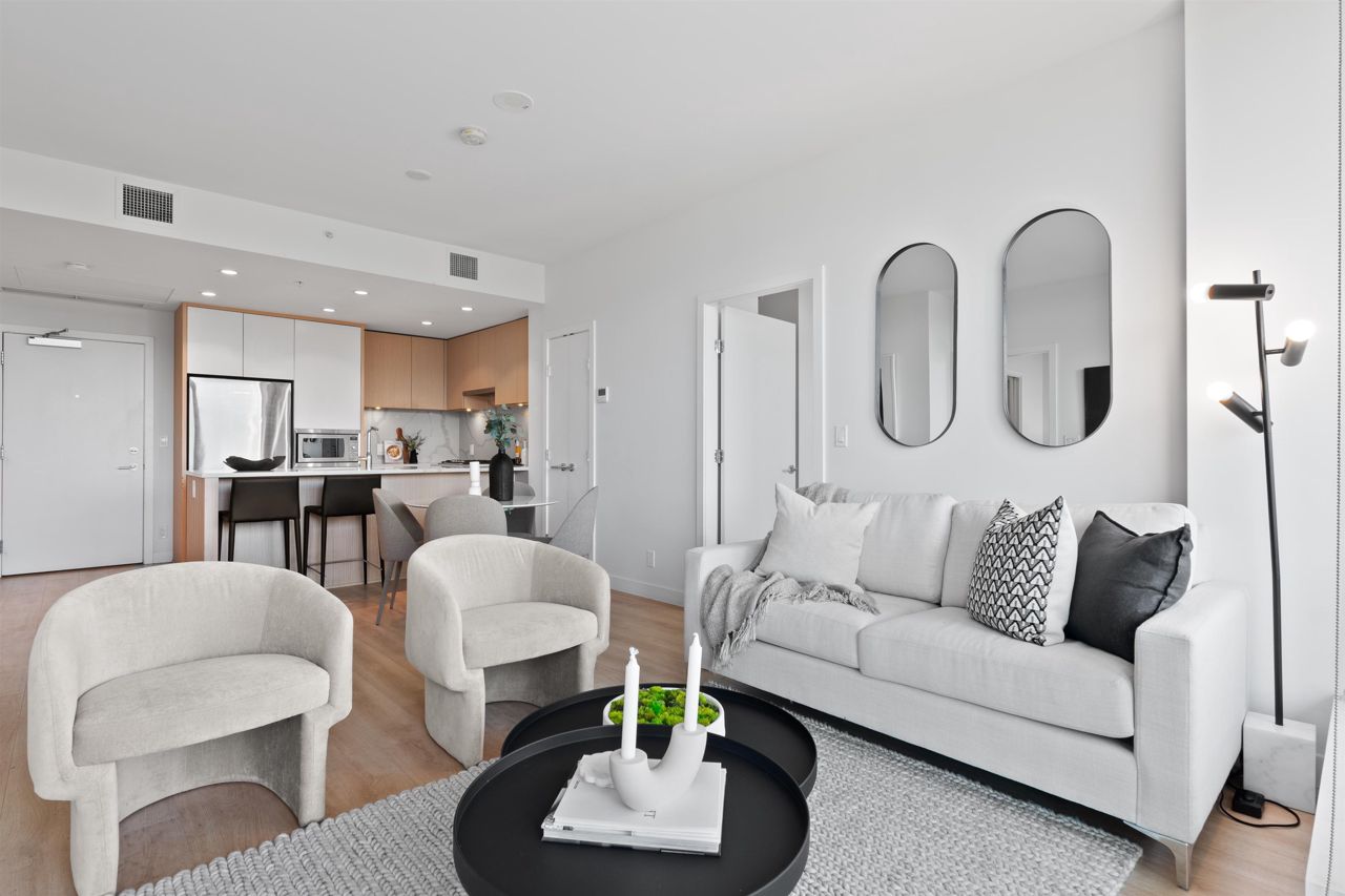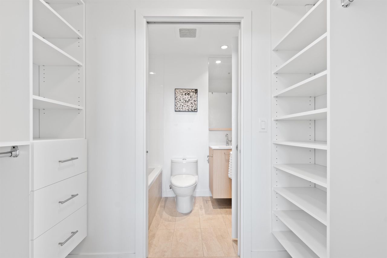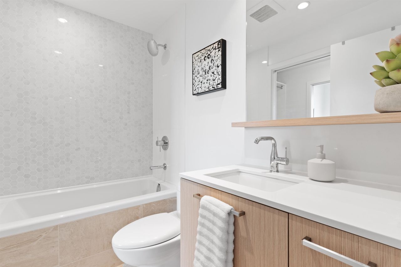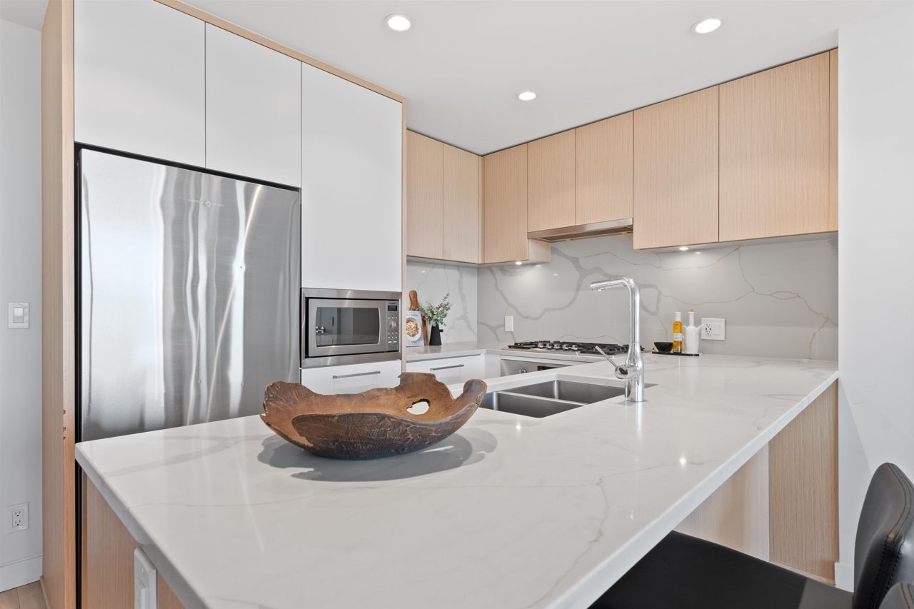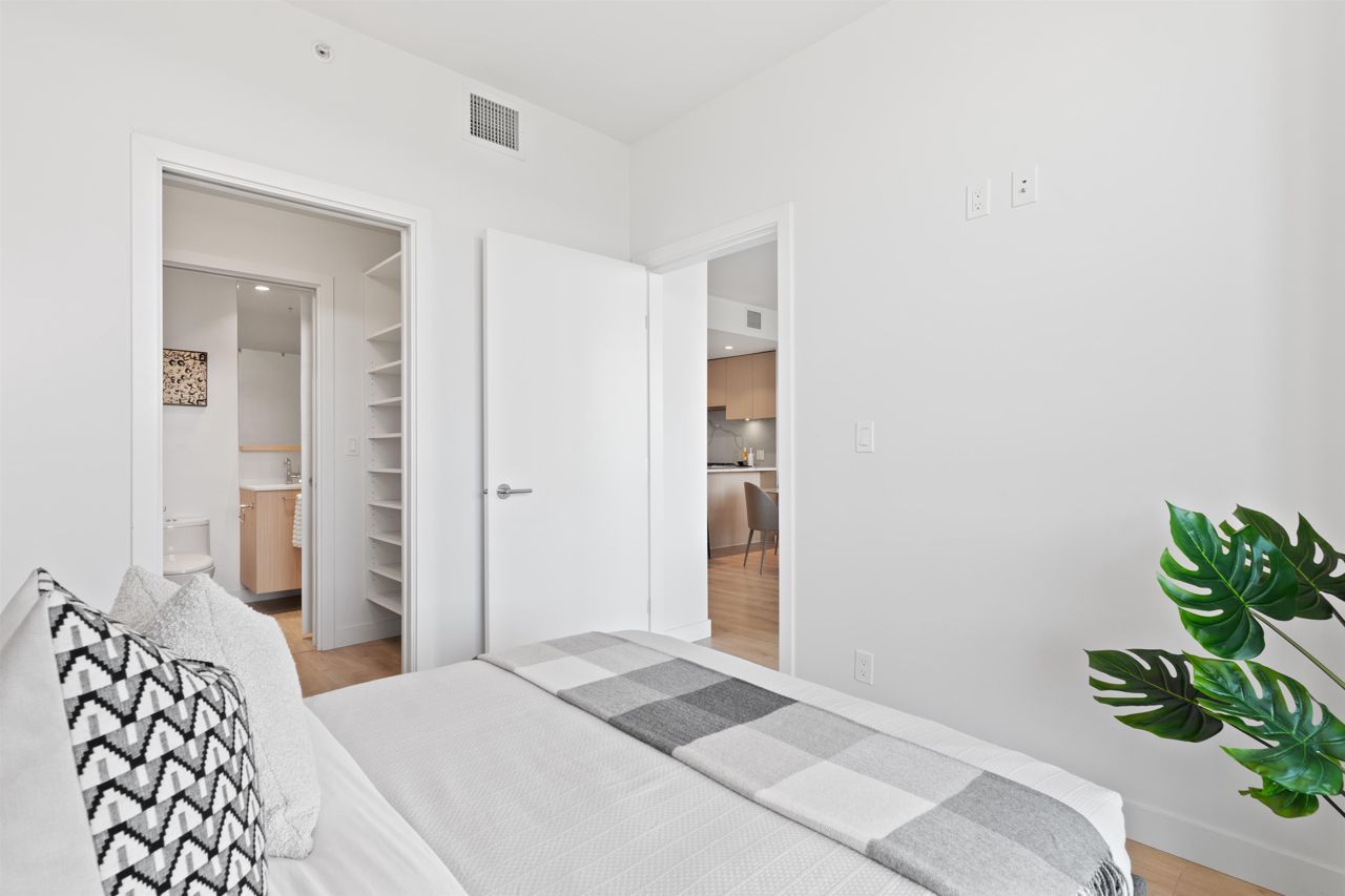 Beautiful forested and city views from this home in Coquitlam’s tallest tower: Clarke + Como. This 2-bed, 2-bath + office suite offers the perfect floor plan. Bedrooms are on opposite sides (both with ensuites), large full-width balcony, AC, and 9’ ceilings. The kitchen features Bosch and Fisher & Paykel appliances, ample storage, and gorgeous marble backsplash. The primary en-suite easily accommodates a couple with spacious double floating vanity and a ton of storage. Tucked away is an office for those WFH. The complex offers over 20,000 sqft of amenities including Sky Lounge (49th floor), guest suites, sauna, basketball court, karaoke, and concierge. Built by MARCON still under the remaining 5-10 warranty. Steps to Burquitlam station. Includes 1 parking and 1 storage locker.
