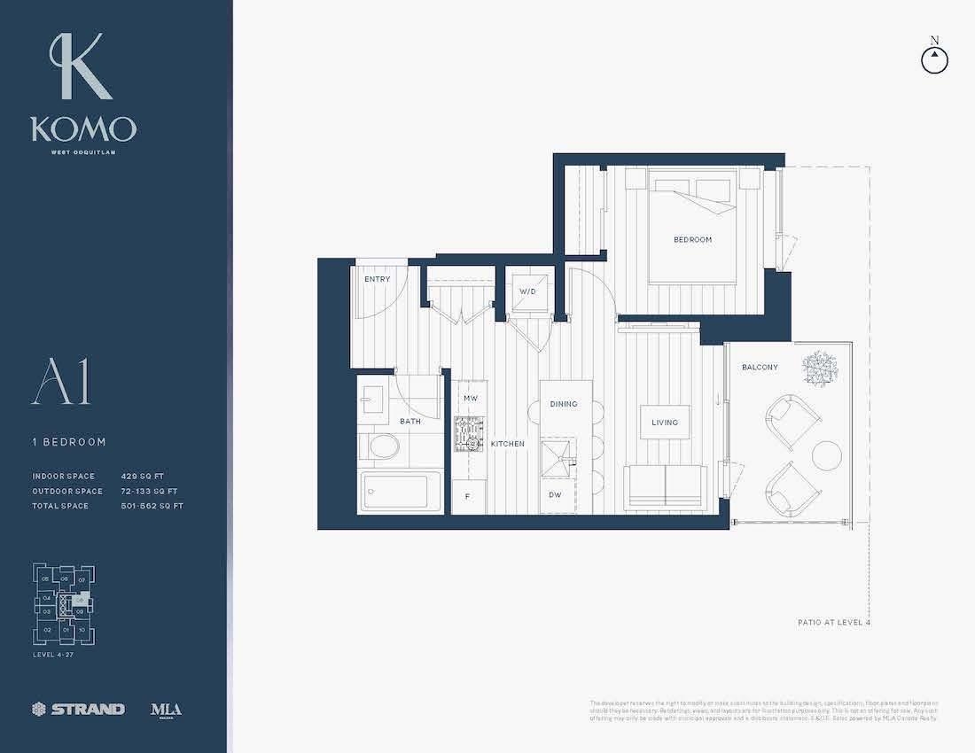 An urban haven in West Coquitlam! This 1 bed, 1 bath home 429 sq. ft. of bright and airy interior living space, plus a 72 sq. ft. balcony. Enjoy the open concept kitchen/living/dining area with large windows and 9 ceiling. Efficient layout with no wasted space, stacked washer & dryer, and EV-ready parking stall is included! Conveniently located only a 5 minute walk from shops, restaurants, the Burquitlam Skytrain Station, trails and more.