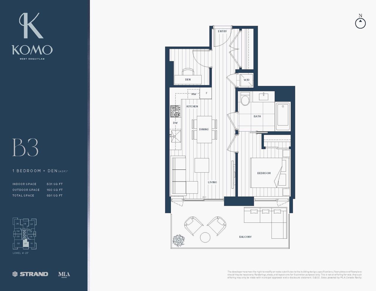 An urban haven in West Coquitlam! This 1 bed Plus den, 1 bath home 531 sq. ft. of bright and airy interior living space, plus a 72 sq. ft. balcony. Enjoy the open concept kitchen/living/dining area with large windows and 9 ceiling. Efficient layout with no wasted space, stacked washer & dryer, and EV-ready parking stall is included! Conveniently located only a 5 minute walk from shops, restaurants, the Burquitlam Skytrain Station, trails and more.