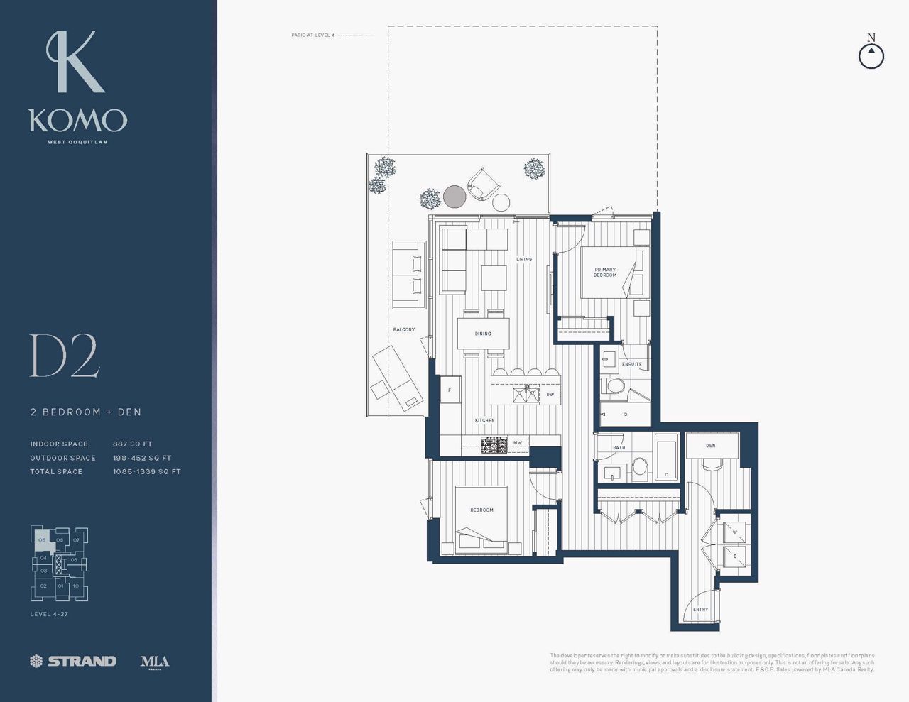 An urban haven in West Coquitlam! This 2 bed, 2 bath plus den corner home boasts 887 sq. ft. of bright and airy interior living space, plus a 198 sq. ft. wrap-around covered balcony. Enjoy the open concept kitchen/living/dining area with large windows and 9 ceilings, generous walk-in closet and ensuite in the primary bedroom, and a separated second bedroom for maximum privacy. Efficient layout with no wasted space, large front hall closet, side by side washer & dryer, plus storage locker and EV-ready parking stall are included! Conveniently located only a 5 minute walk from shops, restaurants, the Burquitlam Skytrain Station, trails and more.