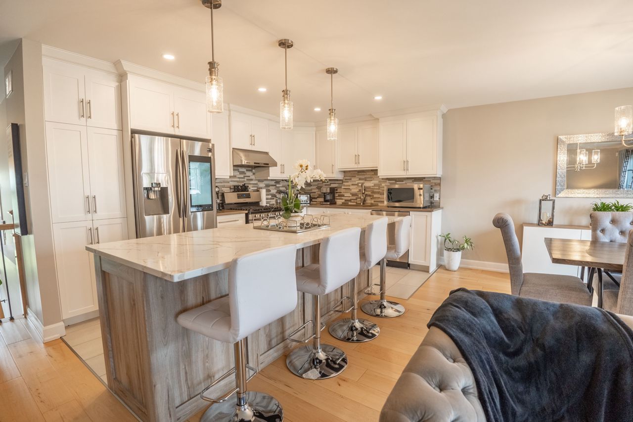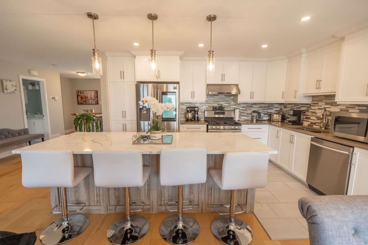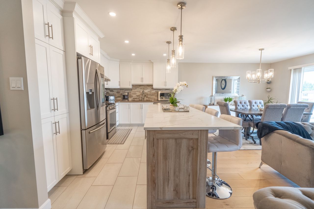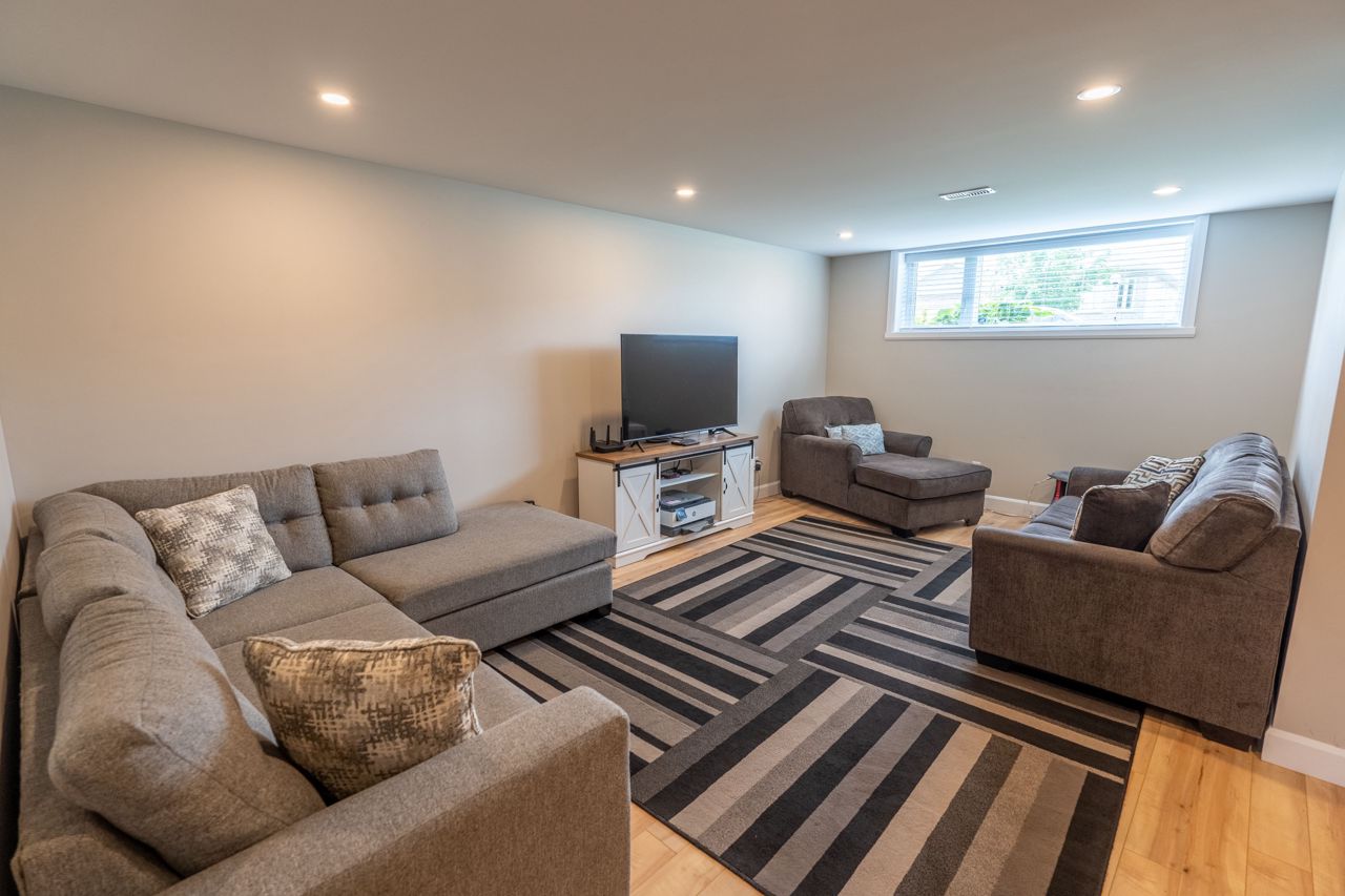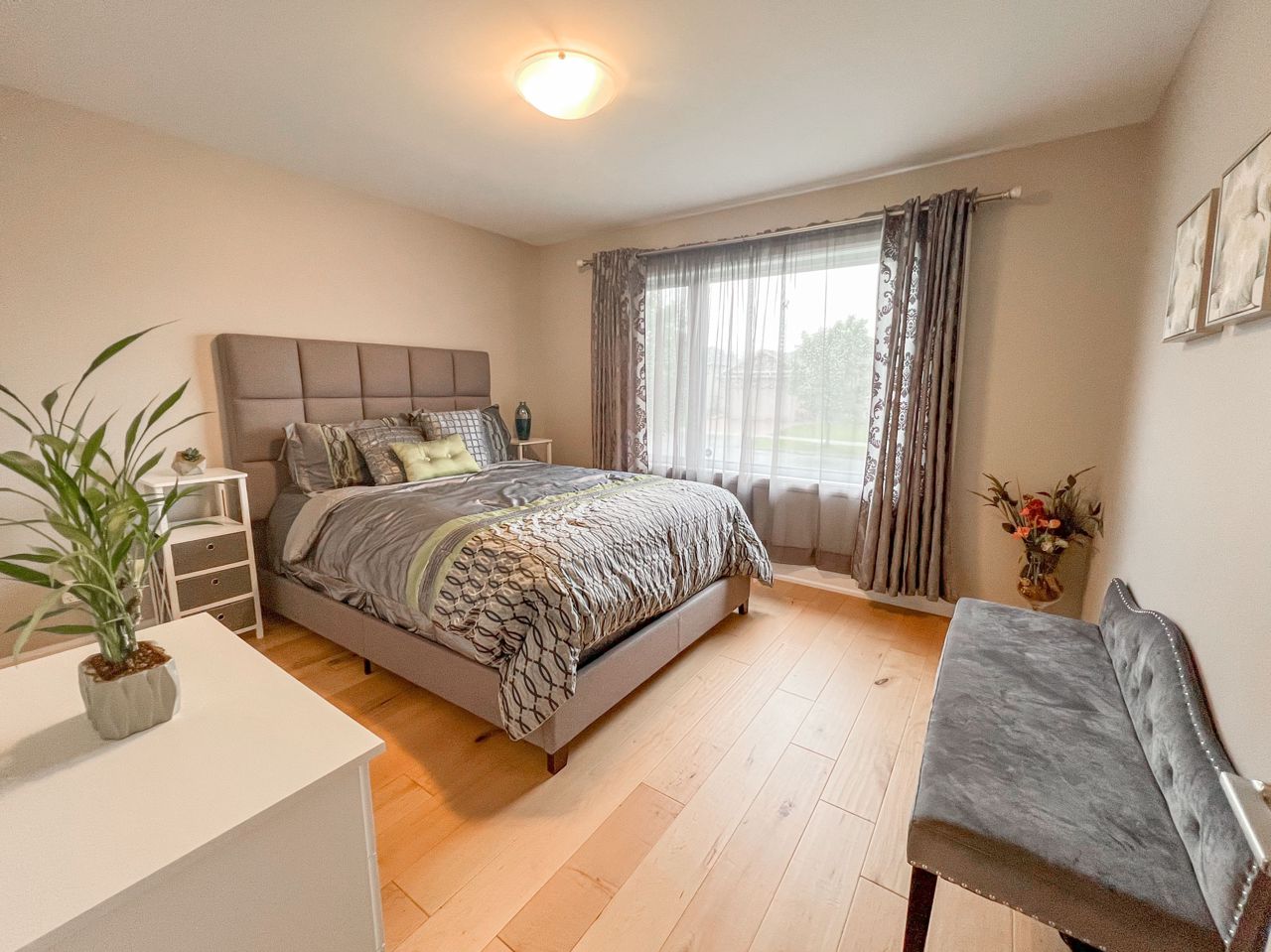 Beautiful bungalow around 1,500 sq/ft plus fully finished basement . Large foyer leads to bright open concept floor plan, living room, kitchen with large island and pantry, backsplash,stainless steel appliances, master bedroom and one more bedroom, 5-pc main bathroom includes tub and separate shower. Granite/quartz countertops in kitchen and both bathroom. Lower level includes recreation-room, 3rd bedroom and 4th bedroom, 4-pc bath, Laundry and utility, storage room. Fully fenced backyard and step out patio doors from dining area to a raised deck for relax. Inside access to garage and Large driveway can park 4 cars.S/S fridge, stove, dishwasher, washer and dryer