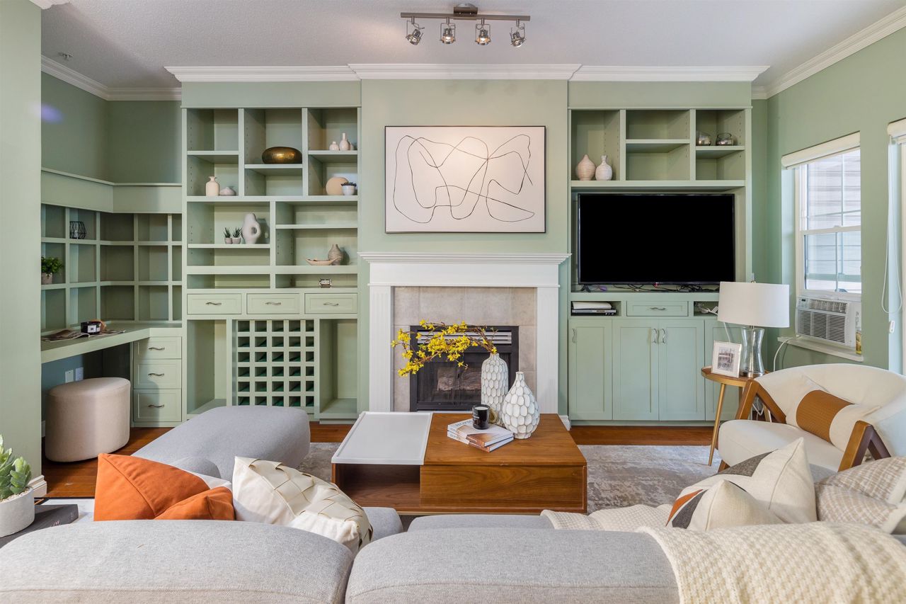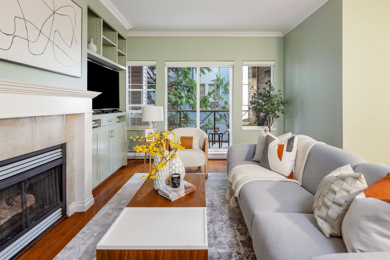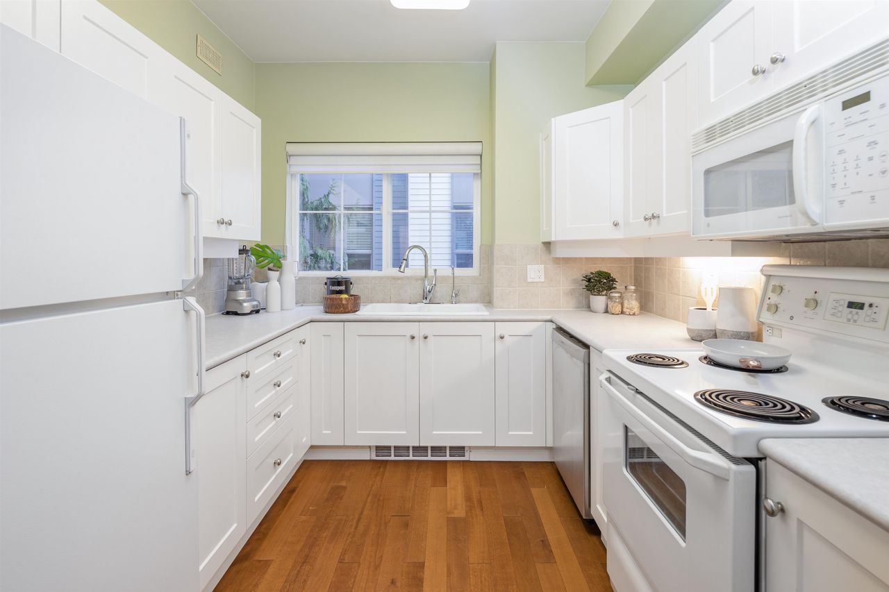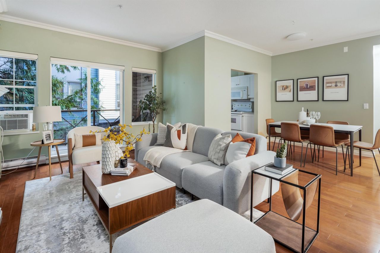Welcome to ADLINGTON COURT! This ultra-spacious 811 SF 1 bed home has been meticulously maintained & tastefully renovated! Open concept living & dining room features functional wall built-ins which provide tons of storage space including wine rack, side table & AIR CON! Kitchen has new dishwasher & plenty of countertop & cabinets for your culinary ideas. Large quiet patio is the ideal oasis for relaxation & BBQs. Beautifully updated bathroom has spa-inspired shower w/ large mirror & vanity! Incredible bedroom can fit KING bed + ample space for dressers/crib! Guest suite avail for your family & friends to stay over. 1 PARKING & LOCKER. 2 PETS & RENTALS OK! STEPS to Trenant Park Square, Community Centre, Schools, Parks, Dining, Transit & Hwy to Van! OPEN HOUSE NOV 18/19 2-4PM. MUST SEE!