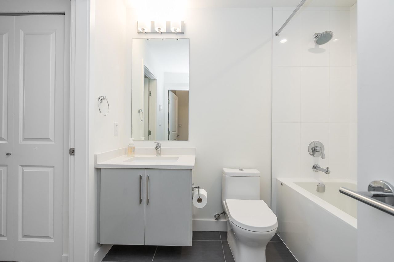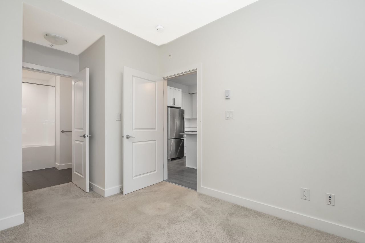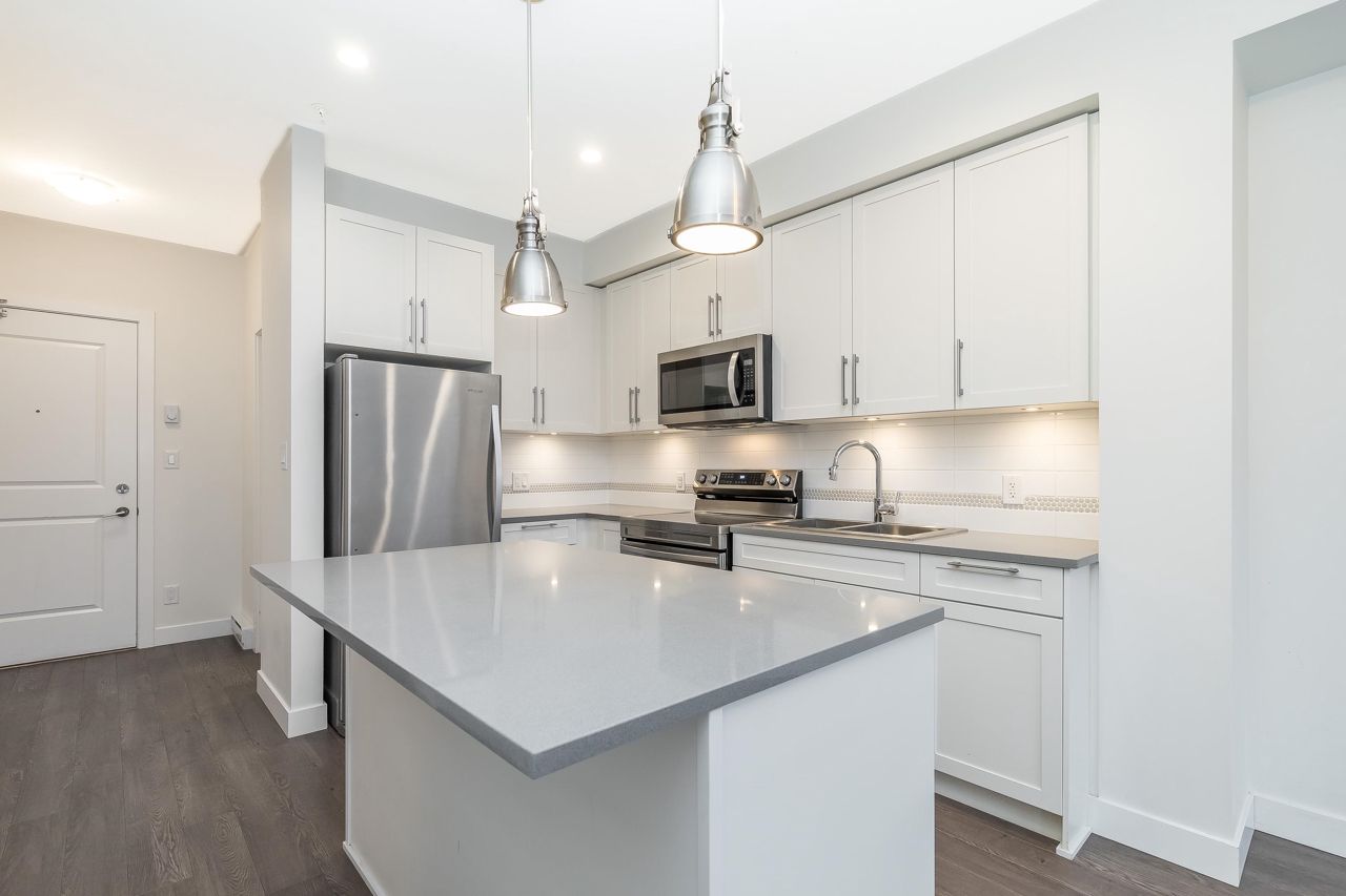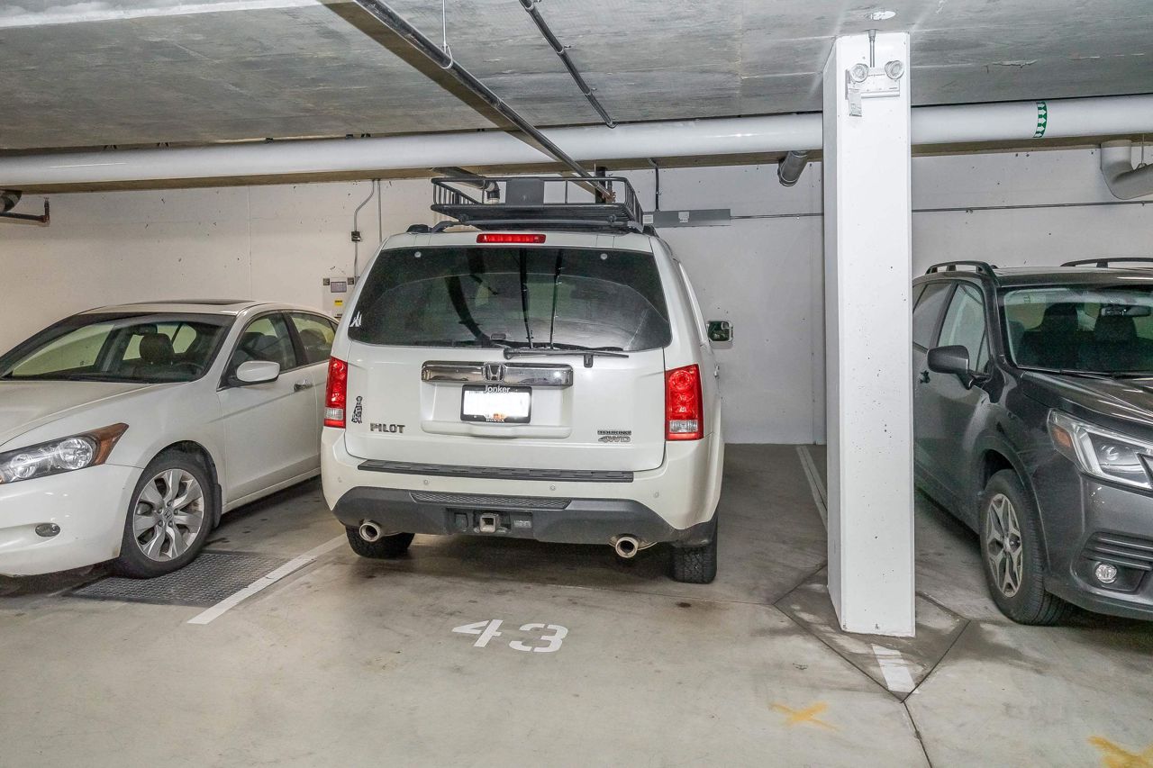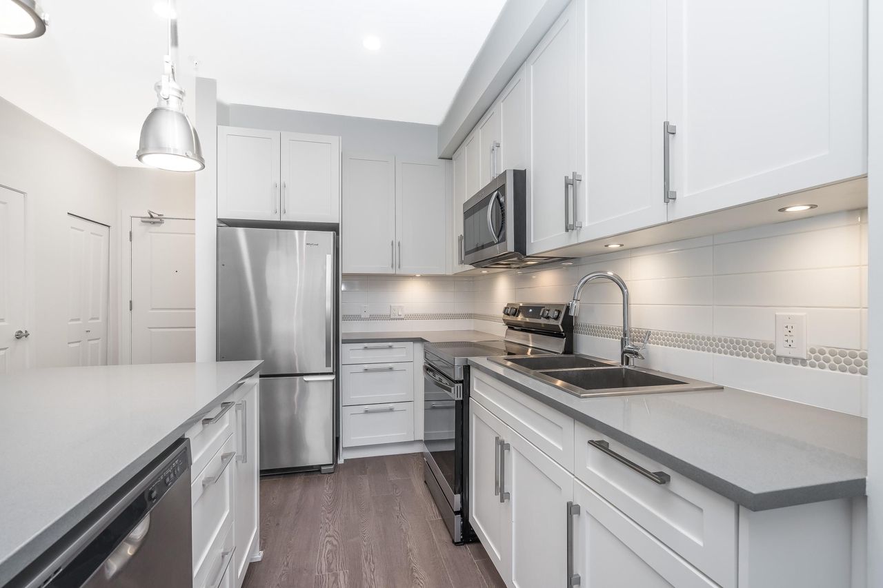 Spectacular 1 spacious bdrm PLUS den, 1 bthrm almost 600 sf south facing home w/ private, covered balcony. In-floor heating in your bathroom, deep soaker tub! Close organizers. Beautiful laminate flooring, 2" faux wood blinds, carpet in the bedroom, soft close cabinet doors and drawers. Top of the line! Immaculate home w/a great room concept. Stunning white shaker-style cabinets w/quartz countertops, huge island, s/s appliances - brand new stove! 1 parking spot, 1 storage locker. Super bright home. Screens. Great location close to transit, shopping, liquor store, gym, pharmacy, choice schools, etc. So many natural trails to check out! Amenities - bike room, 2 elevators, club house, bike room. Call today. Quick possession available.