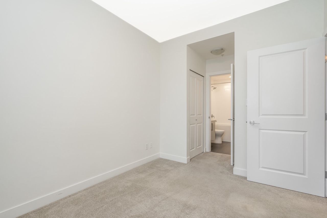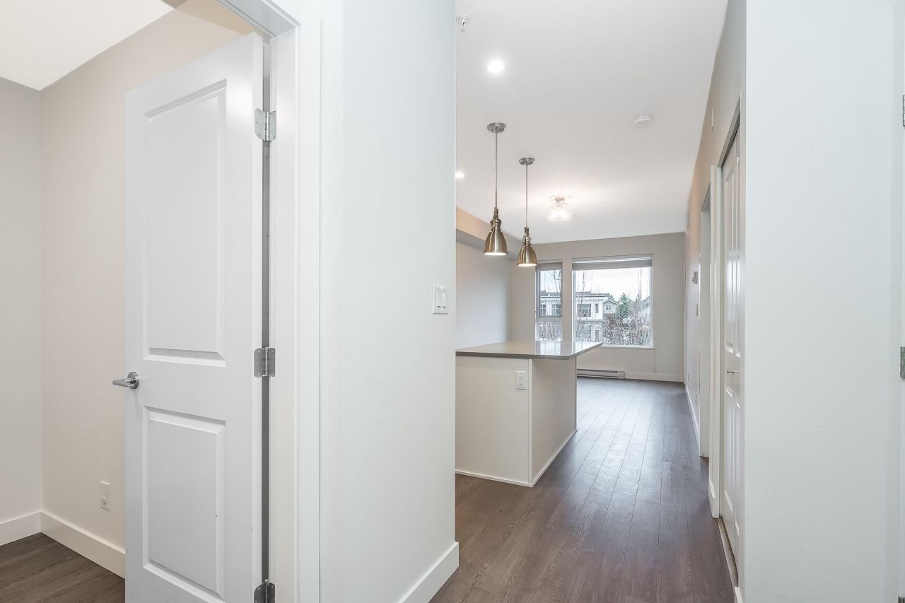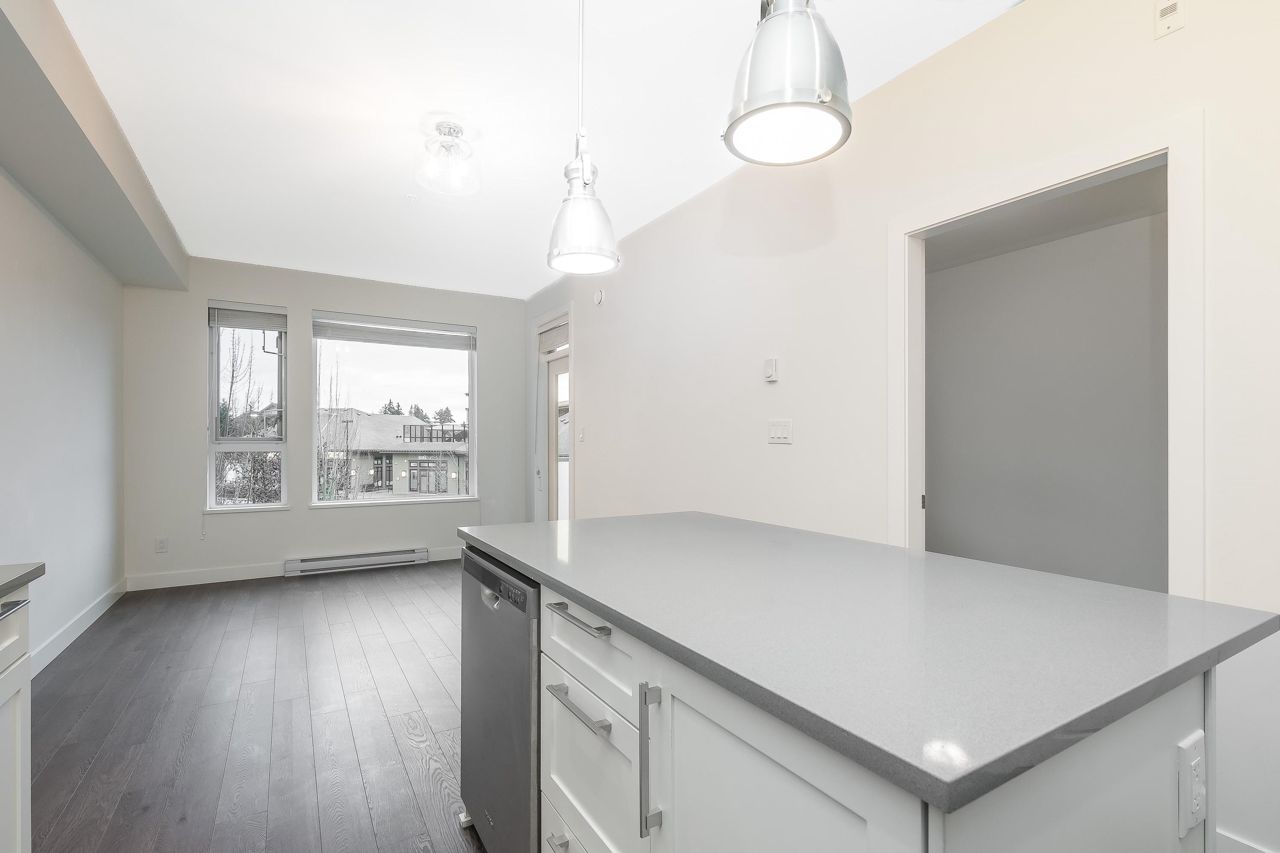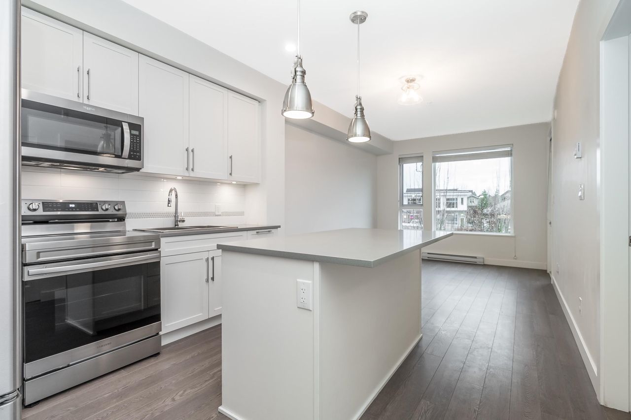 Spectacular 1 spacious bdrm PLUS den, 1 bthrm almost 600 sf south facing home w/ private, covered balcony. In-floor heating in your bathroom, deep soaker tub! Close organizers. Beautiful laminate flooring, 2" faux wood blinds, carpet in the bedroom, soft close cabinet doors and drawers. Top of the line! Immaculate home w/a great room concept. Stunning white shaker-style cabinets w/quartz countertops, huge island, s/s appliances - brand new stove! 1 parking spot, 1 storage locker. Super bright home. Screens. Great location close to transit, shopping, liquor store, gym, pharmacy, choice schools, etc. So many natural trails to check out! Amenities - bike room, 2 elevators, club house, bike room. Call today. Quick possession available.