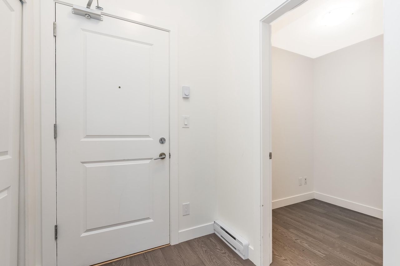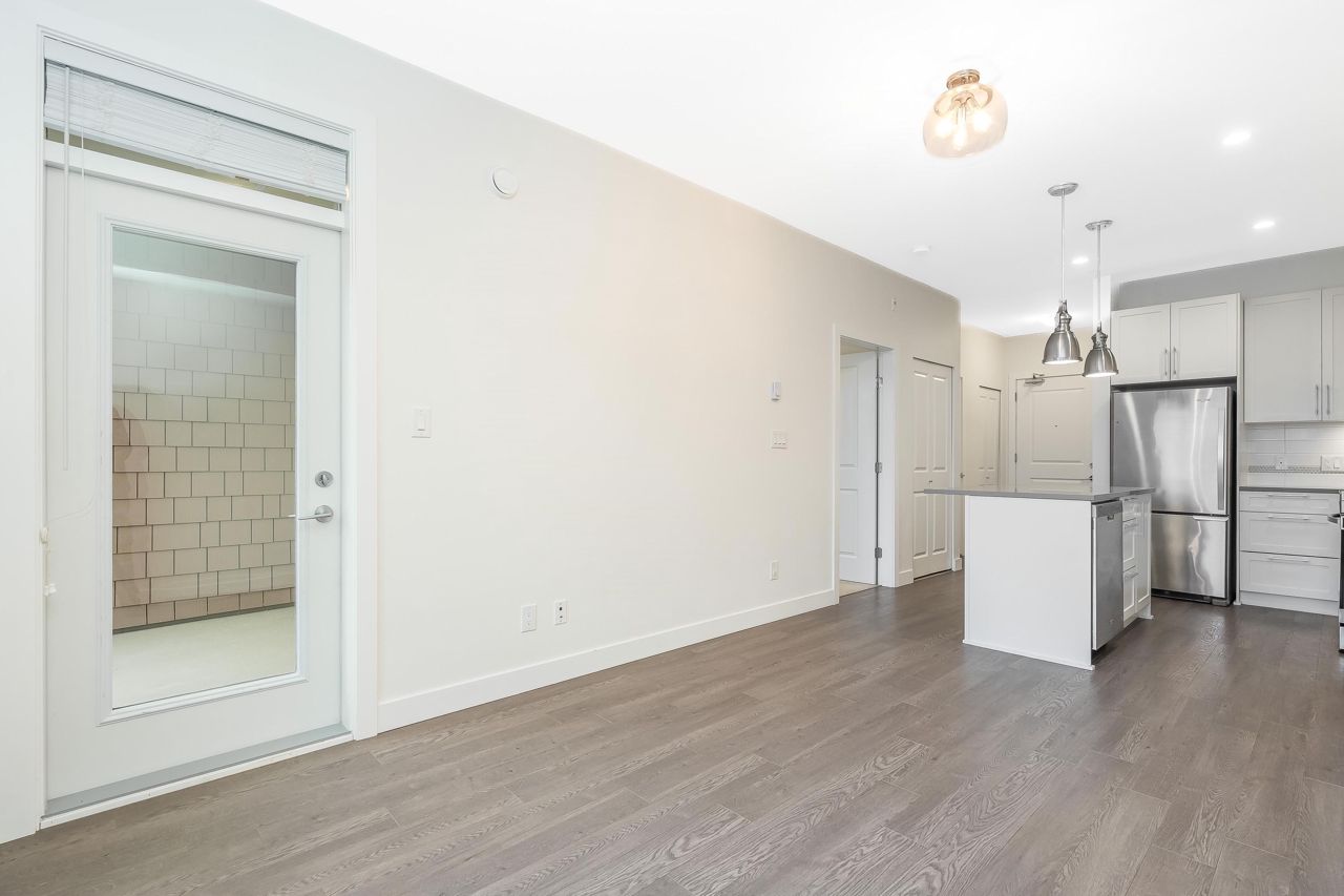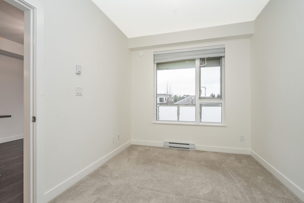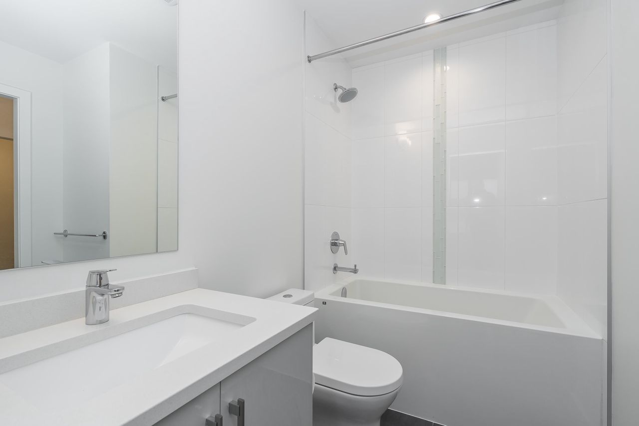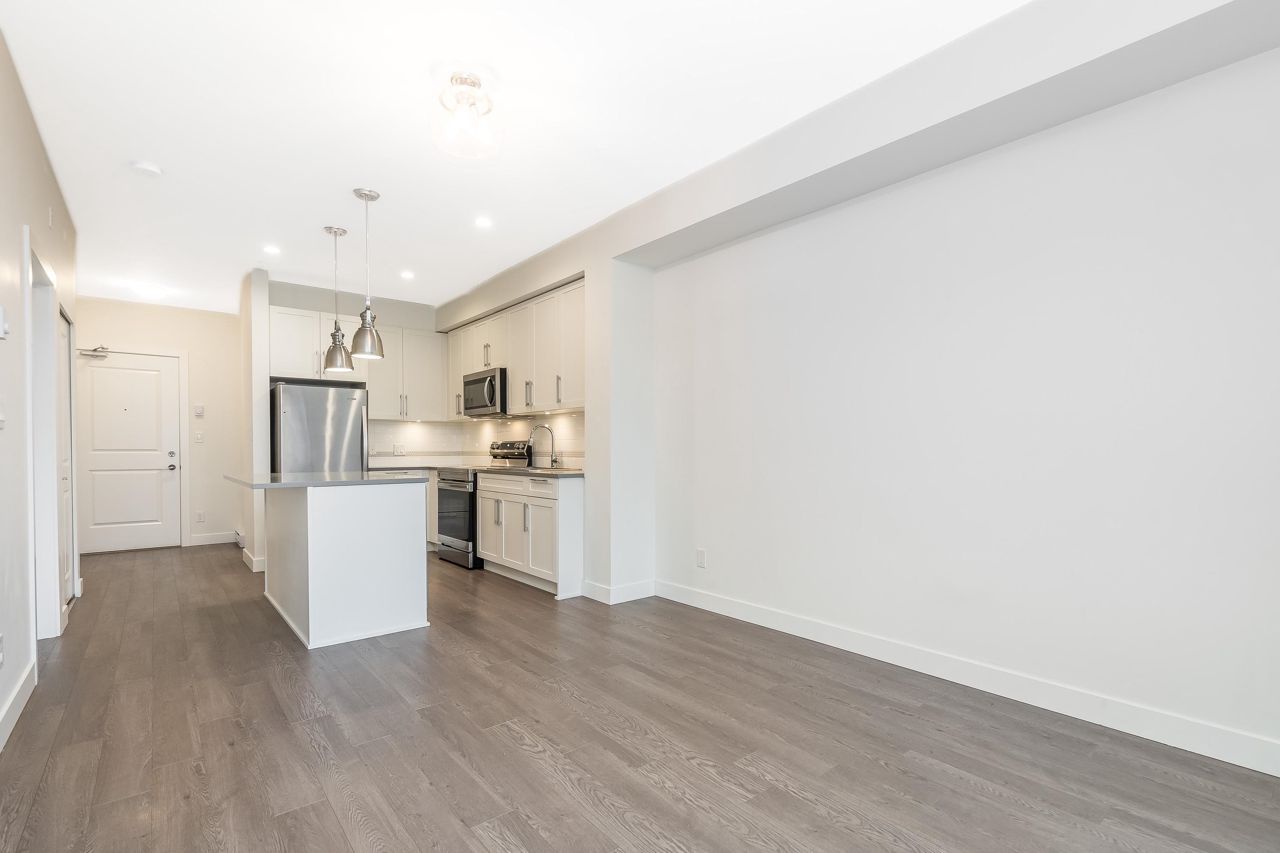Spectacular 1 spacious bdrm PLUS den, 1 bthrm almost 600 sf south facing home w/ private, covered balcony. In-floor heating in your bathroom, deep soaker tub! Close organizers. Beautiful laminate flooring, 2" faux wood blinds, carpet in the bedroom, soft close cabinet doors and drawers. Top of the line! Immaculate home w/a great room concept. Stunning white shaker-style cabinets w/quartz countertops, huge island, s/s appliances - brand new stove! 1 parking spot, 1 storage locker. Super bright home. Screens. Great location close to transit, shopping, liquor store, gym, pharmacy, choice schools, etc. So many natural trails to check out! Amenities - bike room, 2 elevators, club house, bike room. Call today. Quick possession available.