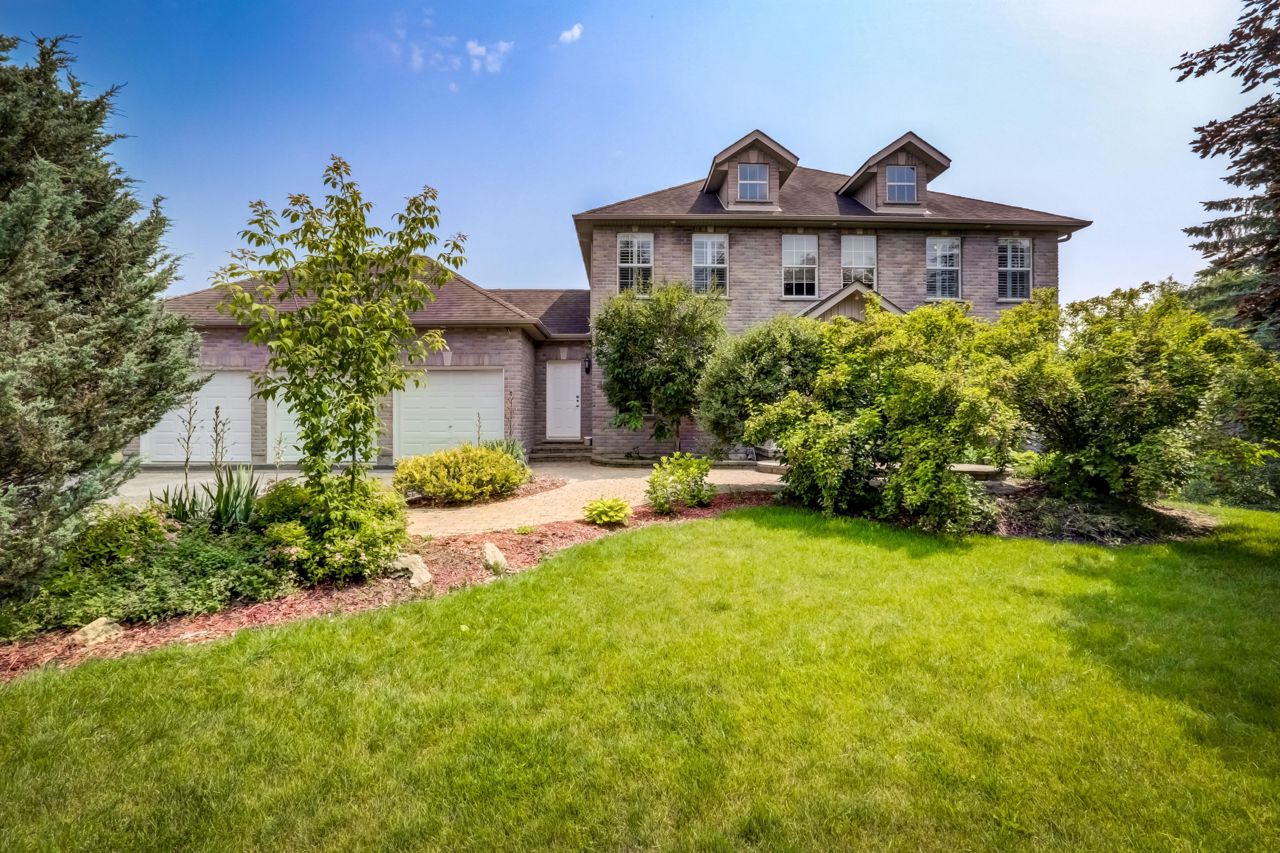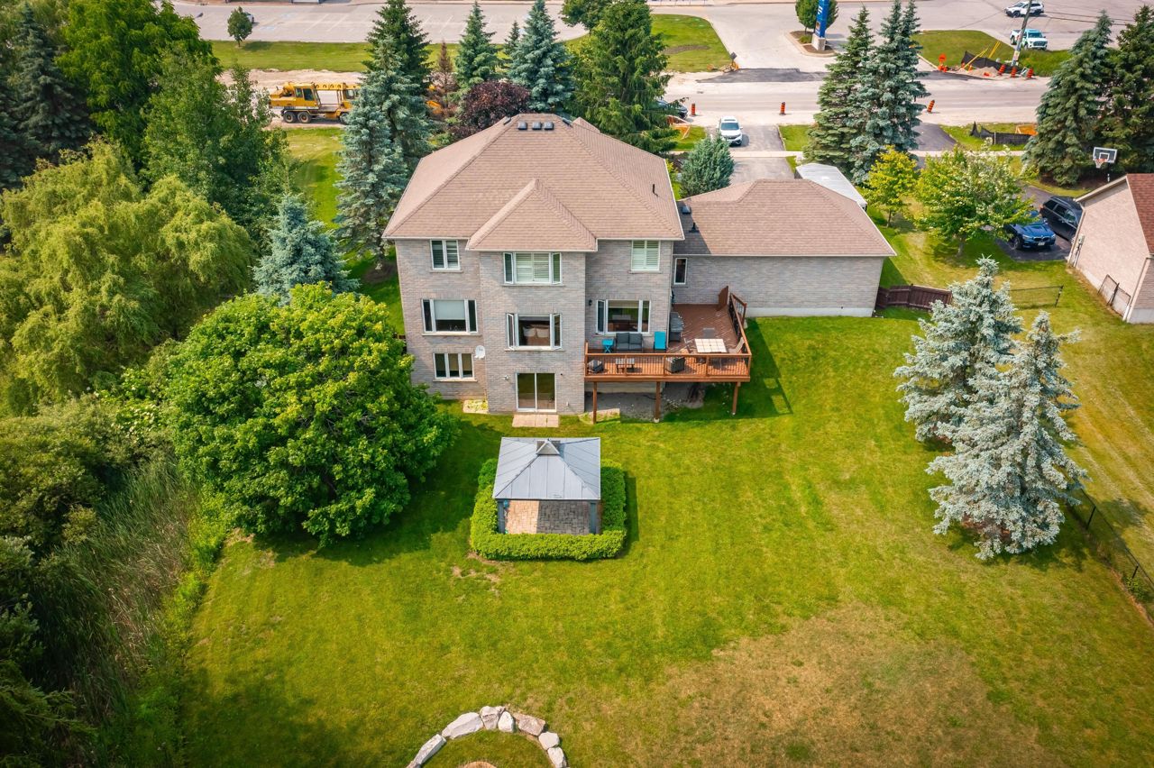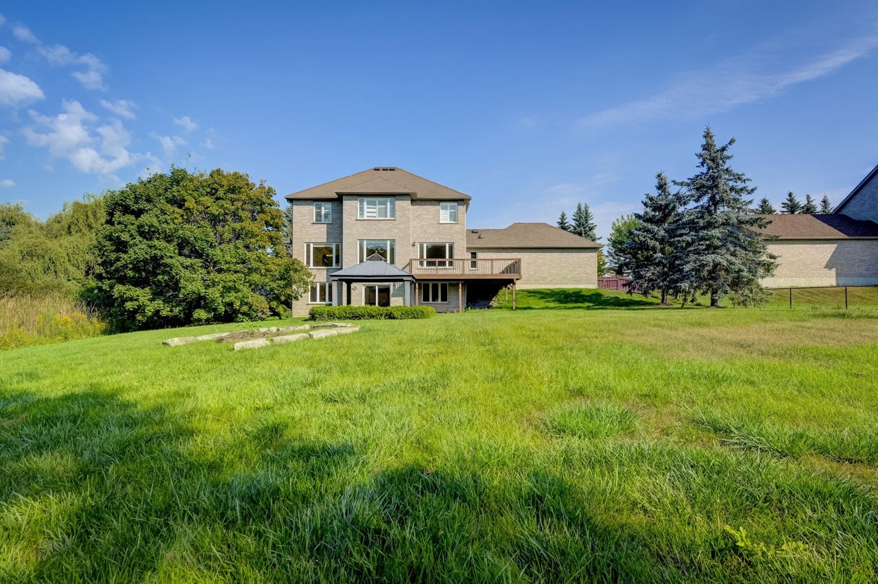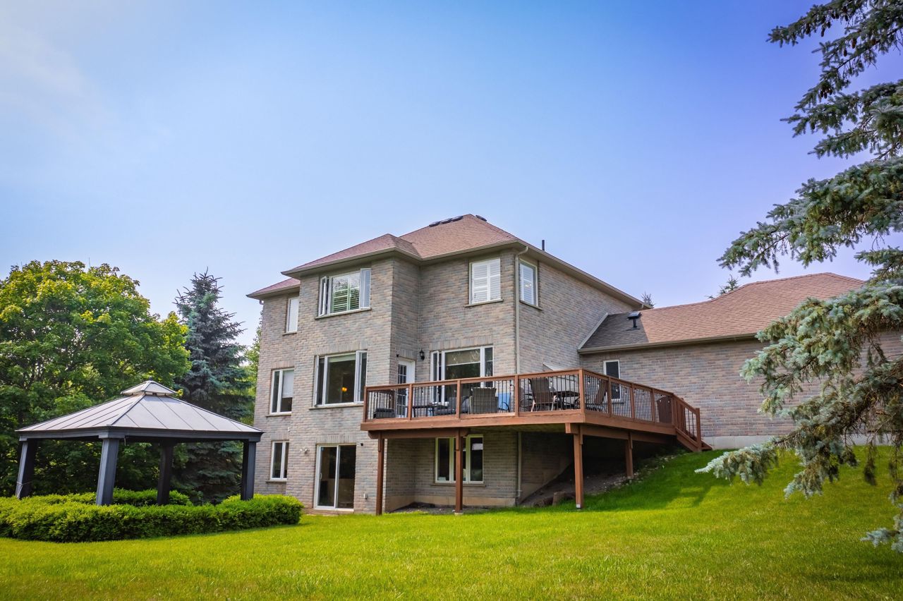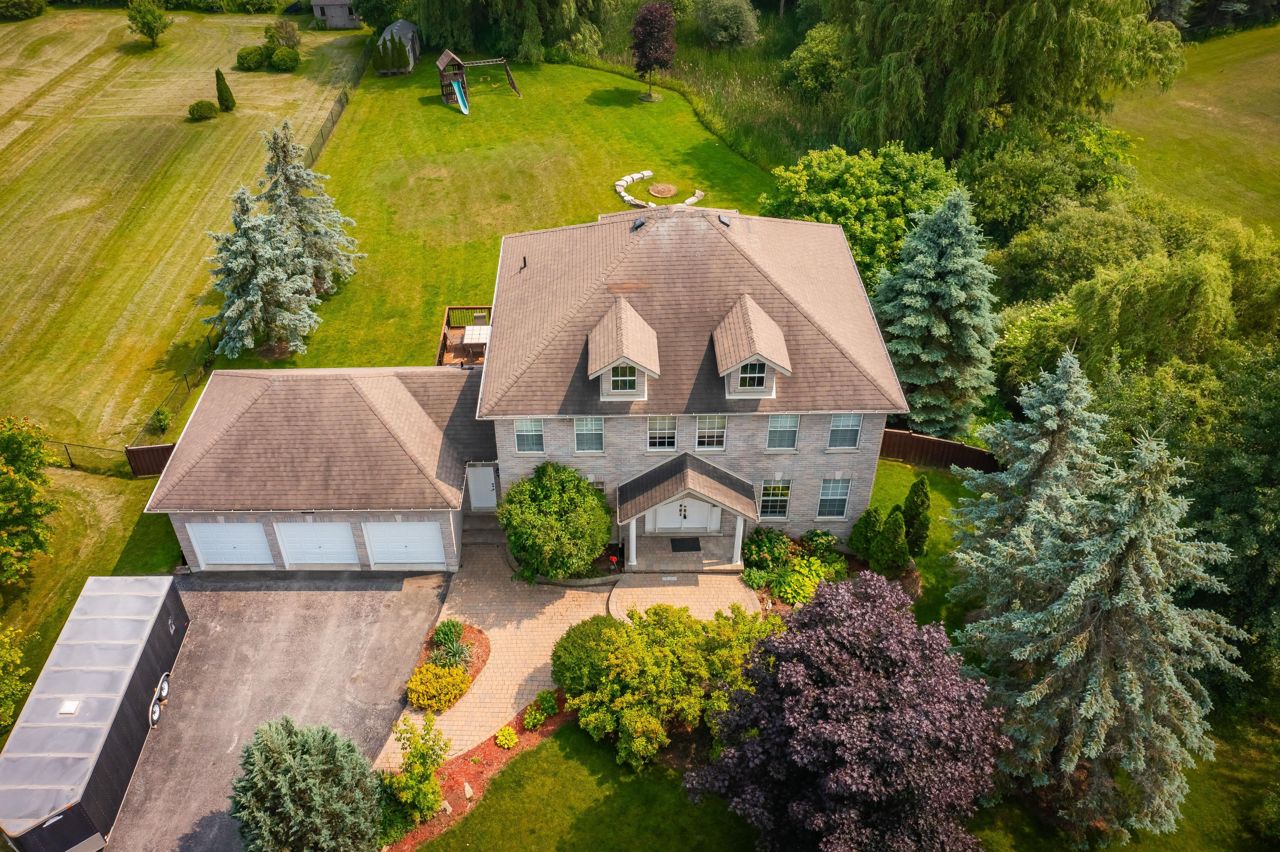 Open concept 2 storey Executive home in Sharon Hills with 9ft ceilings on main floor on picturesque 3/4 acre lot backing onto conservation. Sunny south facing backyard with gazebo & children's playset. Aprox 4200 sqft of total living space including finished walkout basement, 3 car garage & 12 car parking in total.ELF, all window coverings, CAC (2yrs new), new furnace (2023), gazebo, stainless steel fridge, stove, b/i dishwasher, bar fridge, washer, dryer, storage shed, swing set (as is)