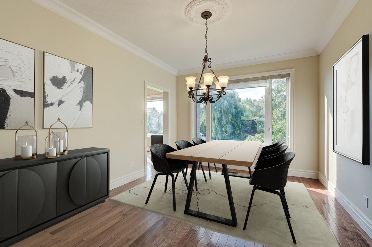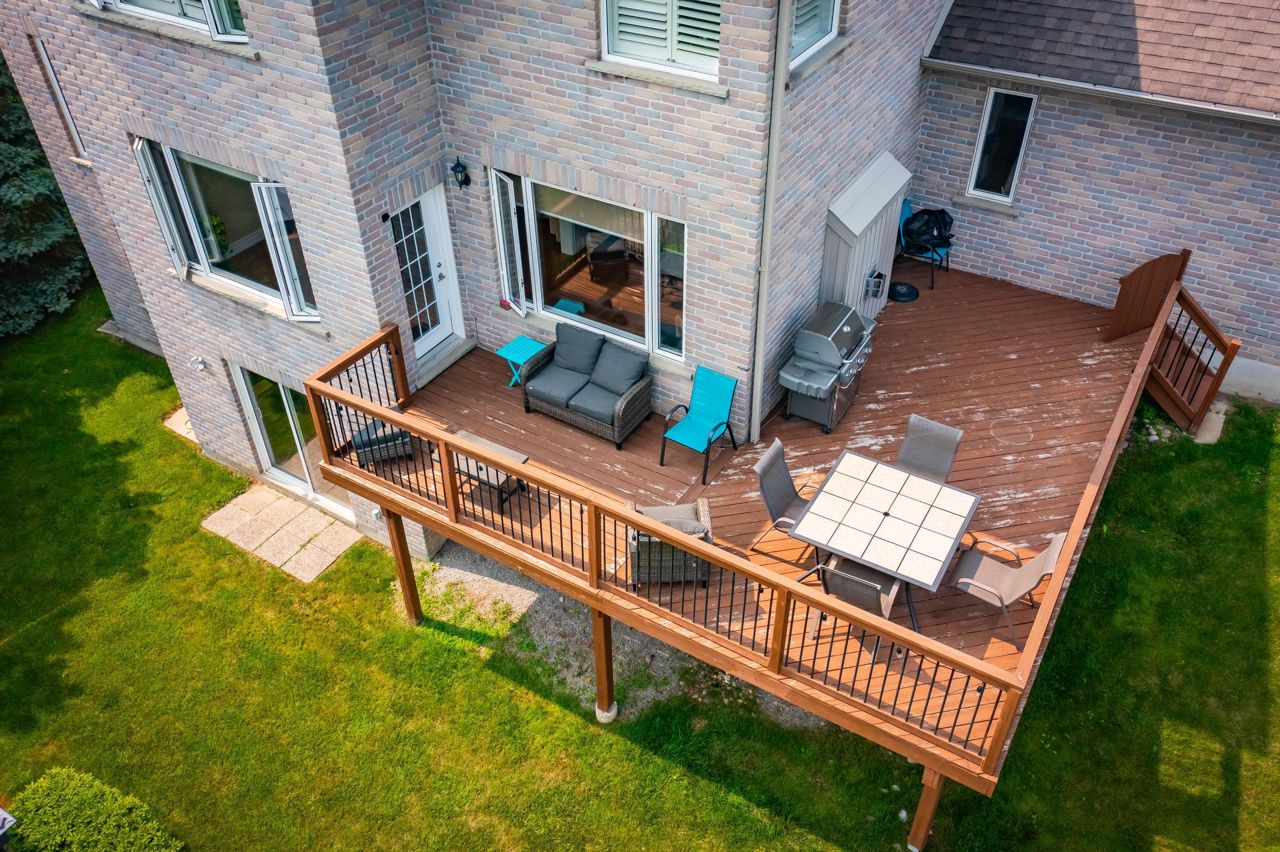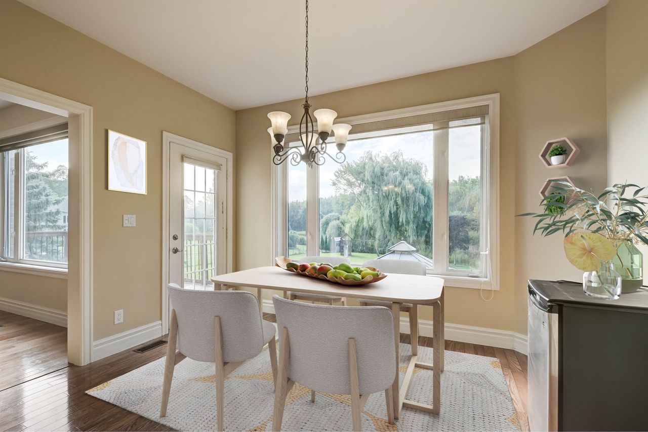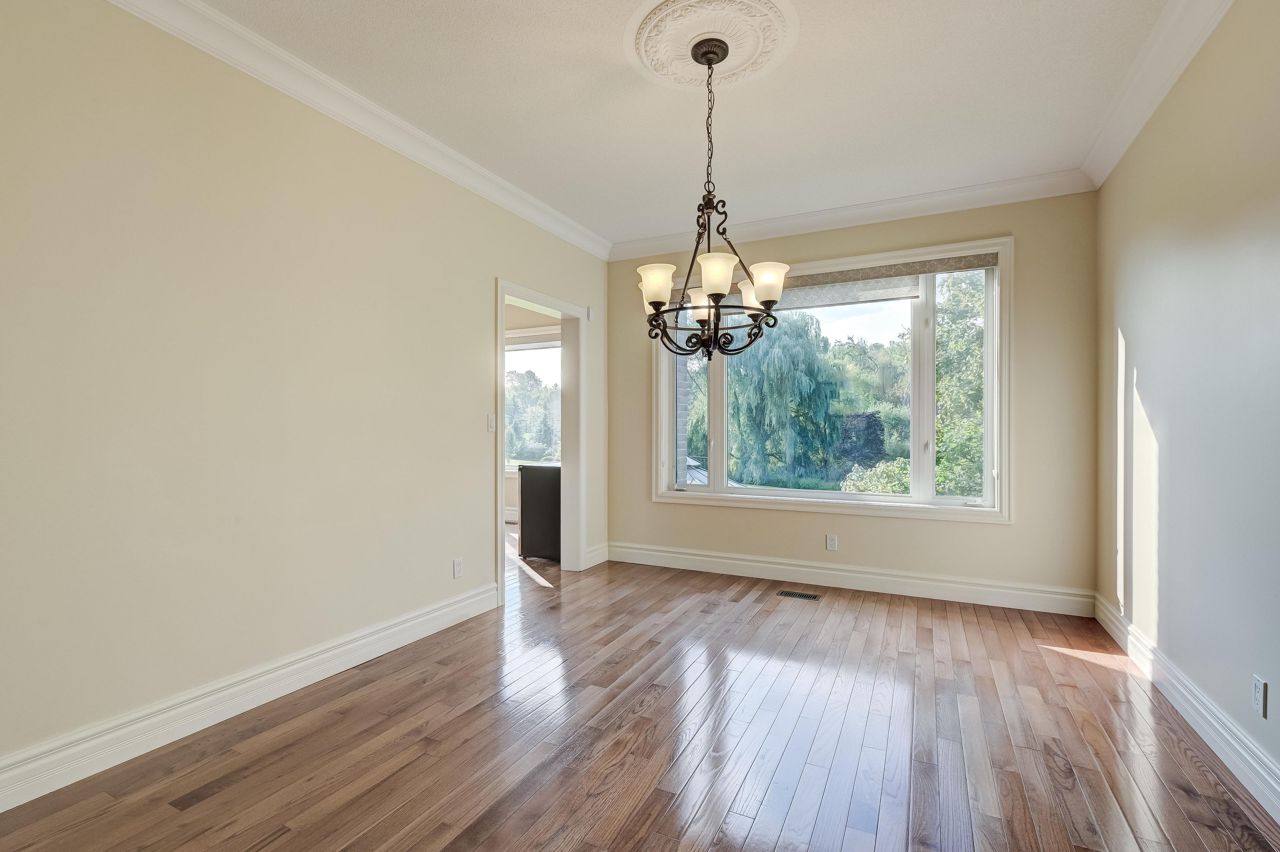 Open concept 2 storey Executive home in Sharon Hills with 9ft ceilings on main floor on picturesque 3/4 acre lot backing onto conservation. Sunny south facing backyard with gazebo & children's playset. Aprox 4200 sqft of total living space including finished walkout basement, 3 car garage & 12 car parking in total.ELF, all window coverings, CAC (2yrs new), new furnace (2023), gazebo, stainless steel fridge, stove, b/i dishwasher, bar fridge, washer, dryer, storage shed, swing set (as is)