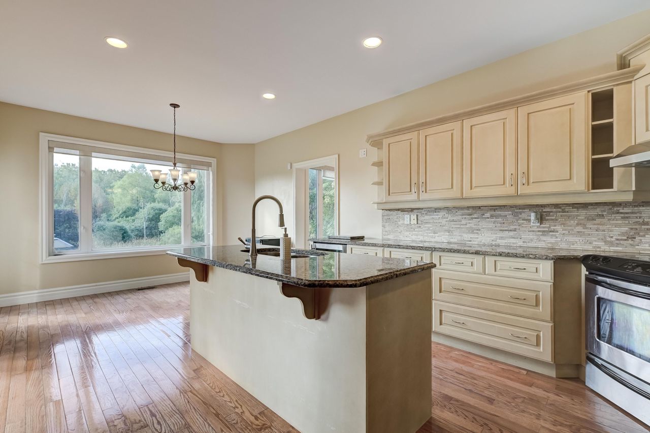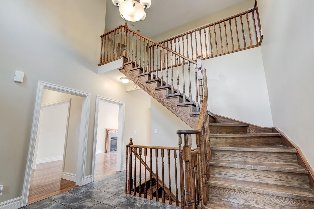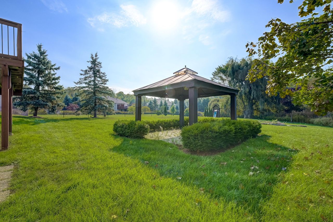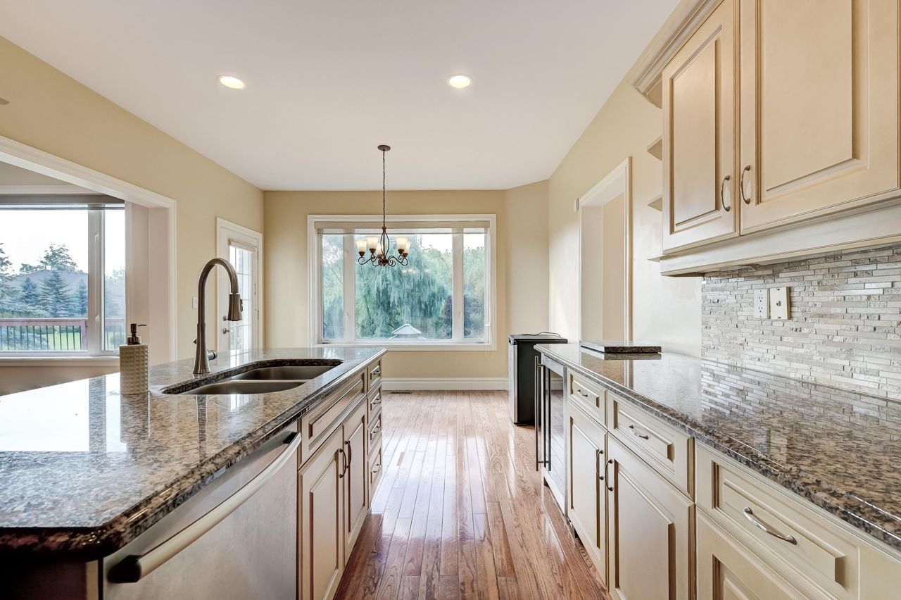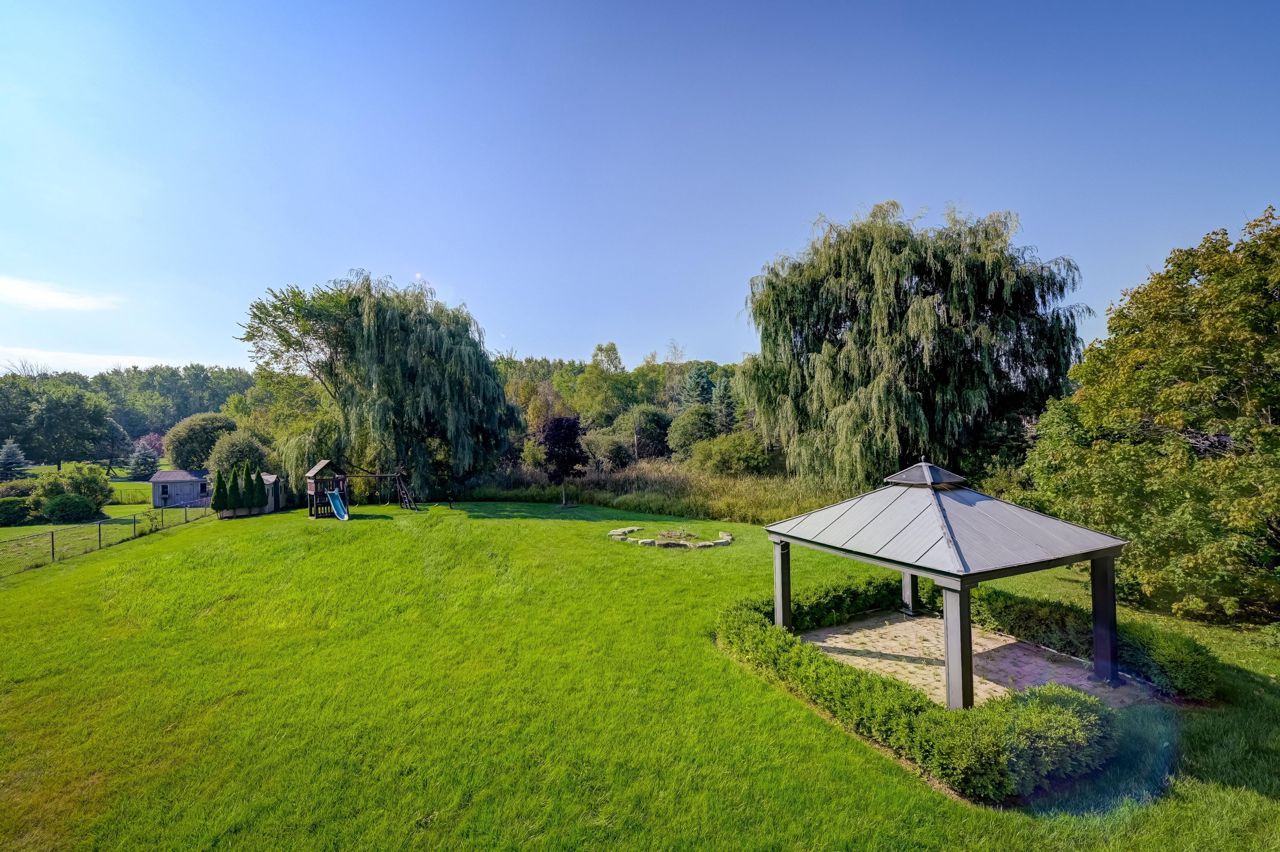 Open concept 2 storey Executive home in Sharon Hills with 9ft ceilings on main floor on picturesque 3/4 acre lot backing onto conservation. Sunny south facing backyard with gazebo & children's playset. Aprox 4200 sqft of total living space including finished walkout basement, 3 car garage & 12 car parking in total.ELF, all window coverings, CAC (2yrs new), new furnace (2023), gazebo, stainless steel fridge, stove, b/i dishwasher, bar fridge, washer, dryer, storage shed, swing set (as is)