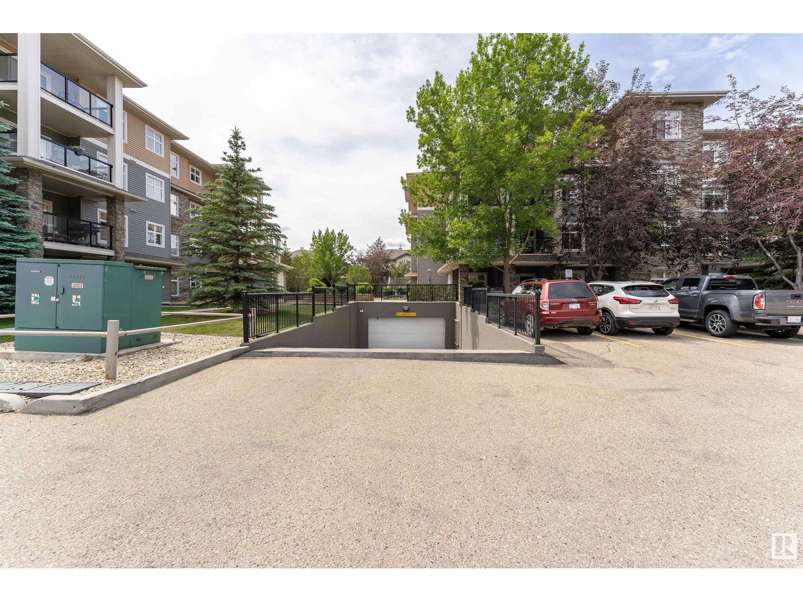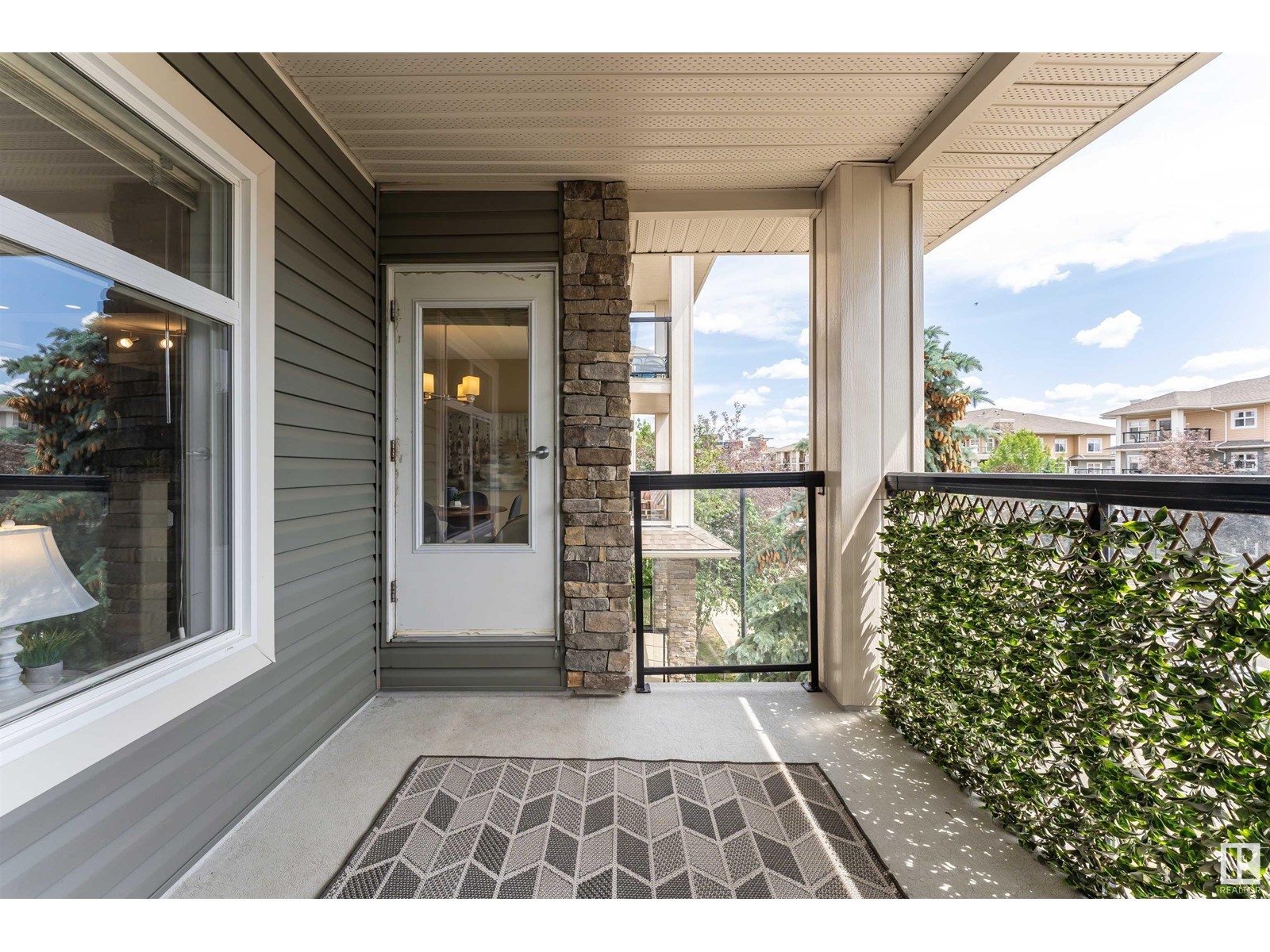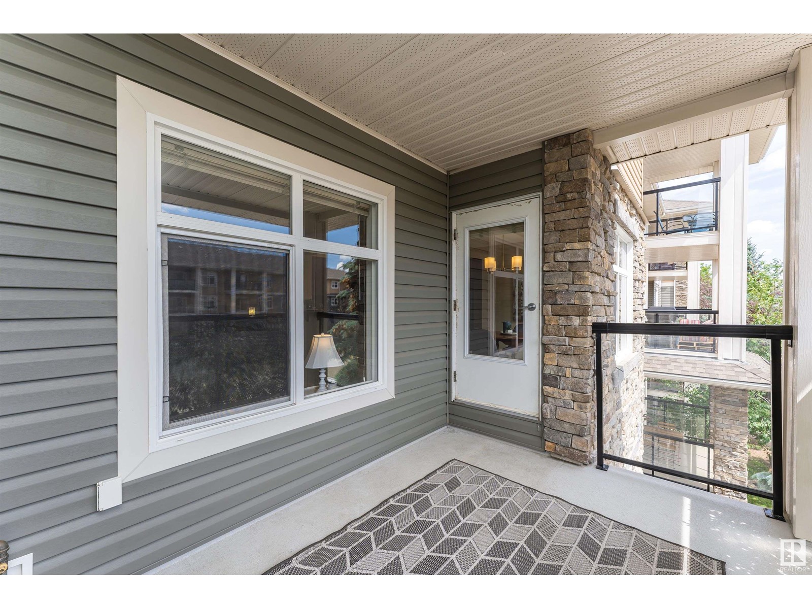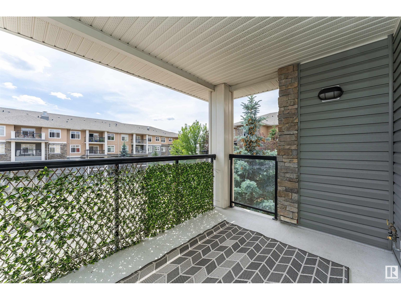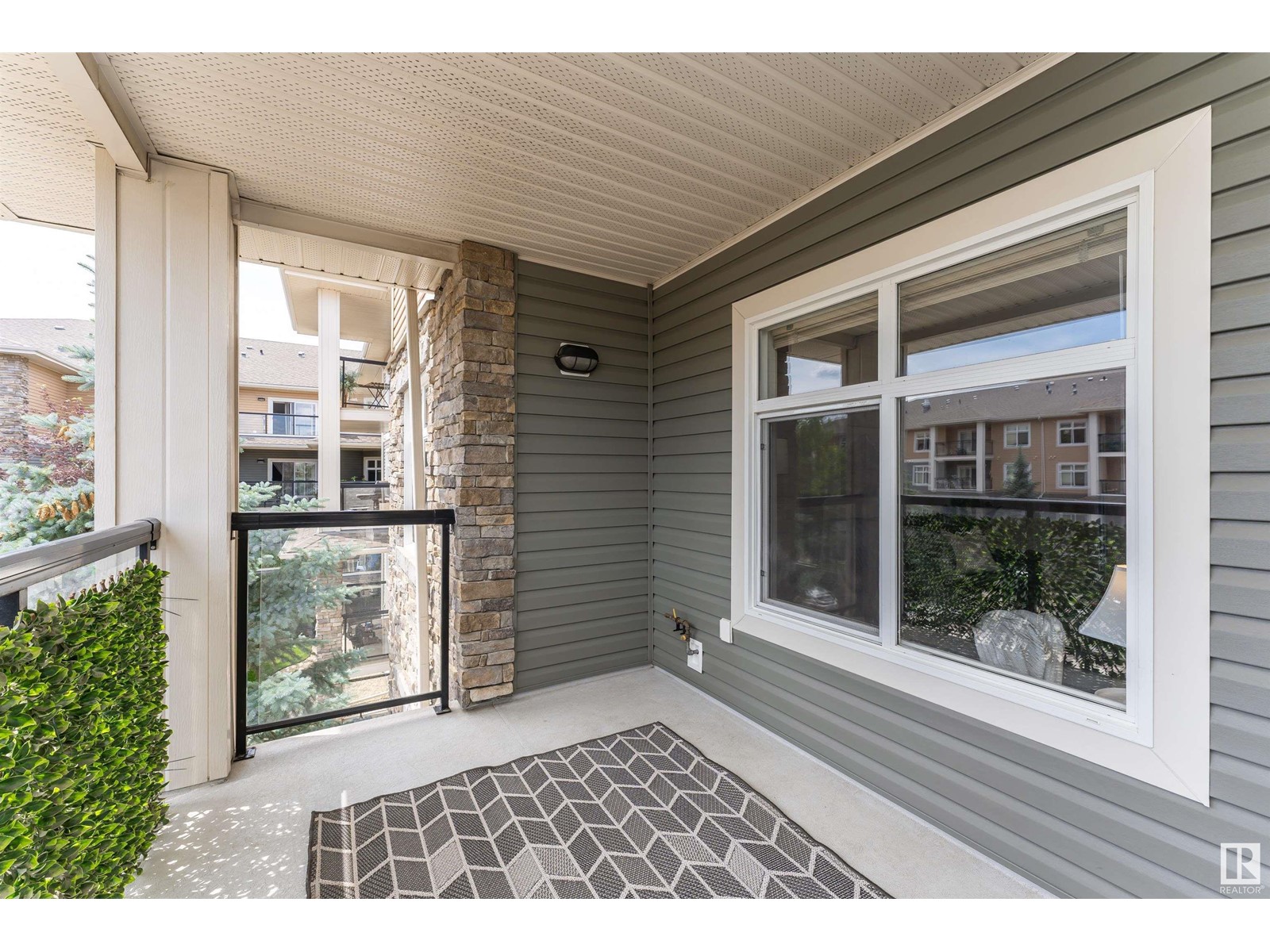 Spacious, two-bedroom + den suite with over 1000 SqFt of living space, this condo delivers an excellent floor plan with lots of storage. The well-appointed kitchen has sleek appliances with a breakfast bar that seamlessly flows into the living & dining area that opens to the LRG, south-facing covered balcony w/ a gas BBQ line - a perfect sunny retreat! The primary bedroom has a DBL walk-through closet extending into the ensuite bath with glass shower. An additional spacious bedroom & a versatile den, is ideal for use as a home office. This unit offers a private & quiet setting, with no neighbours below & only one adjacent unit. Positioned above the social & a utility room, peace and tranquility are guaranteed. In-suite laundry, titled UG stall w/ storage cage adds to the value. Residents of Rutherford Gate enjoy an exercise room, party room, with a kitchen, pool table, table tennis & seating area. For out-of-town visitors, a guest suite is available. Quick access to all amenities & the Anthony Henday. (id:22211)