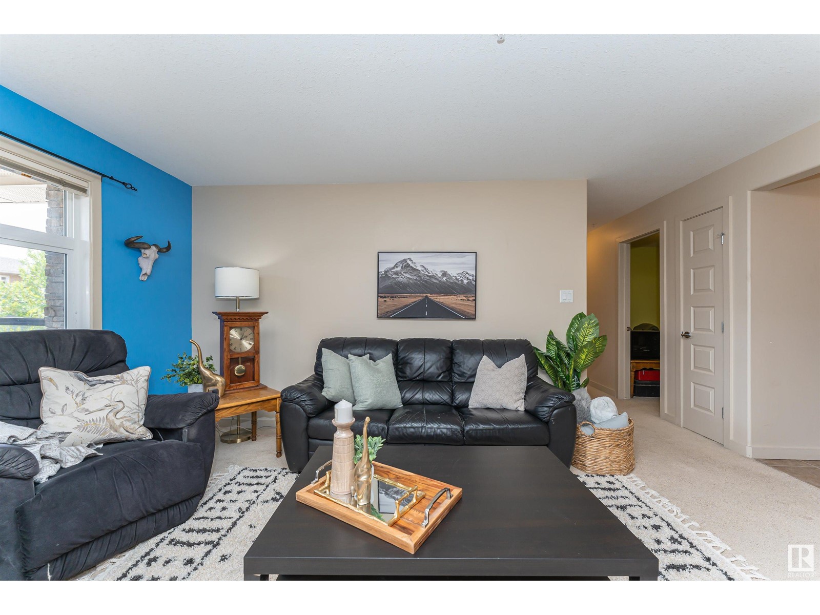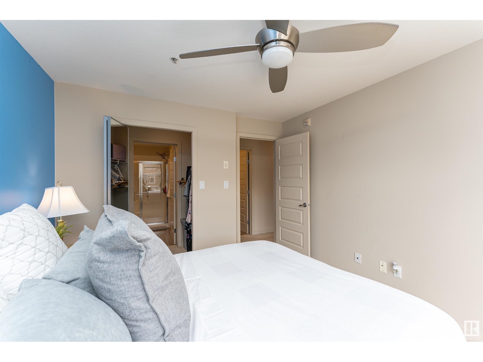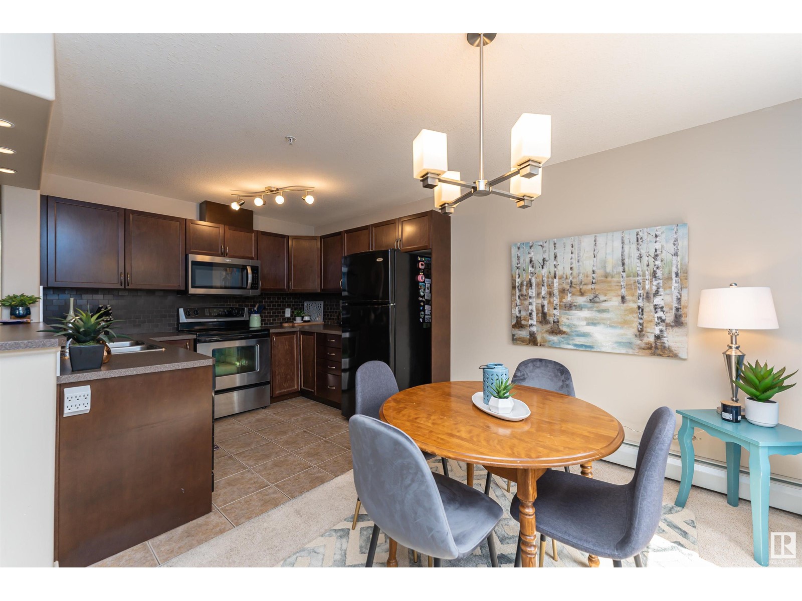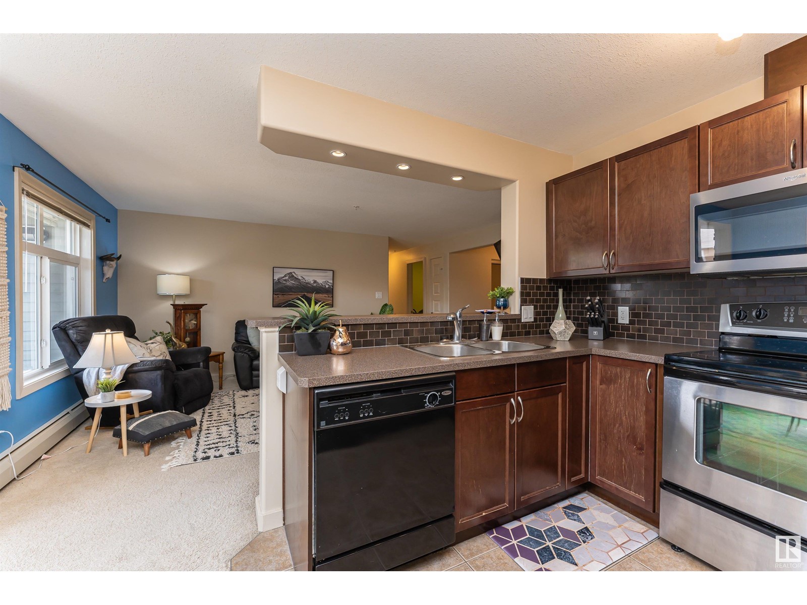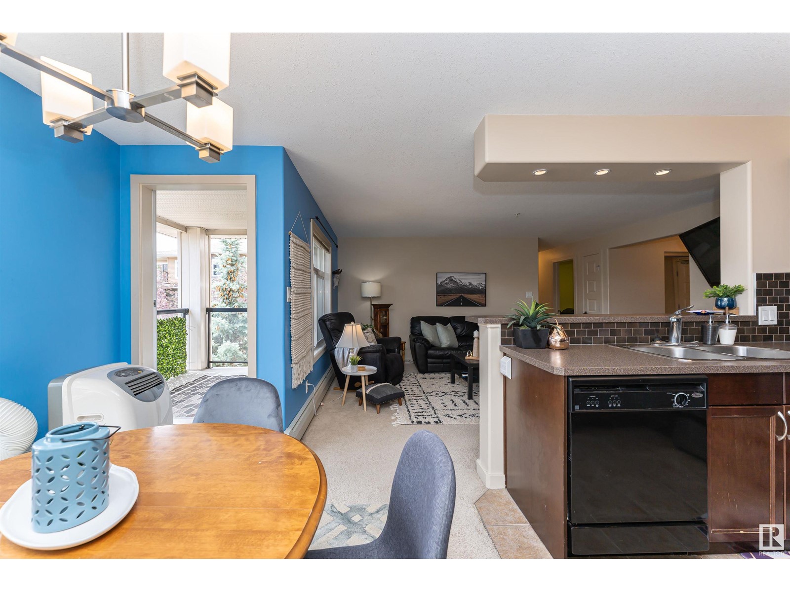 Spacious, two-bedroom + den suite with over 1000 SqFt of living space, this condo delivers an excellent floor plan with lots of storage. The well-appointed kitchen has sleek appliances with a breakfast bar that seamlessly flows into the living & dining area that opens to the LRG, south-facing covered balcony w/ a gas BBQ line - a perfect sunny retreat! The primary bedroom has a DBL walk-through closet extending into the ensuite bath with glass shower. An additional spacious bedroom & a versatile den, is ideal for use as a home office. This unit offers a private & quiet setting, with no neighbours below & only one adjacent unit. Positioned above the social & a utility room, peace and tranquility are guaranteed. In-suite laundry, titled UG stall w/ storage cage adds to the value. Residents of Rutherford Gate enjoy an exercise room, party room, with a kitchen, pool table, table tennis & seating area. For out-of-town visitors, a guest suite is available. Quick access to all amenities & the Anthony Henday. (id:22211)