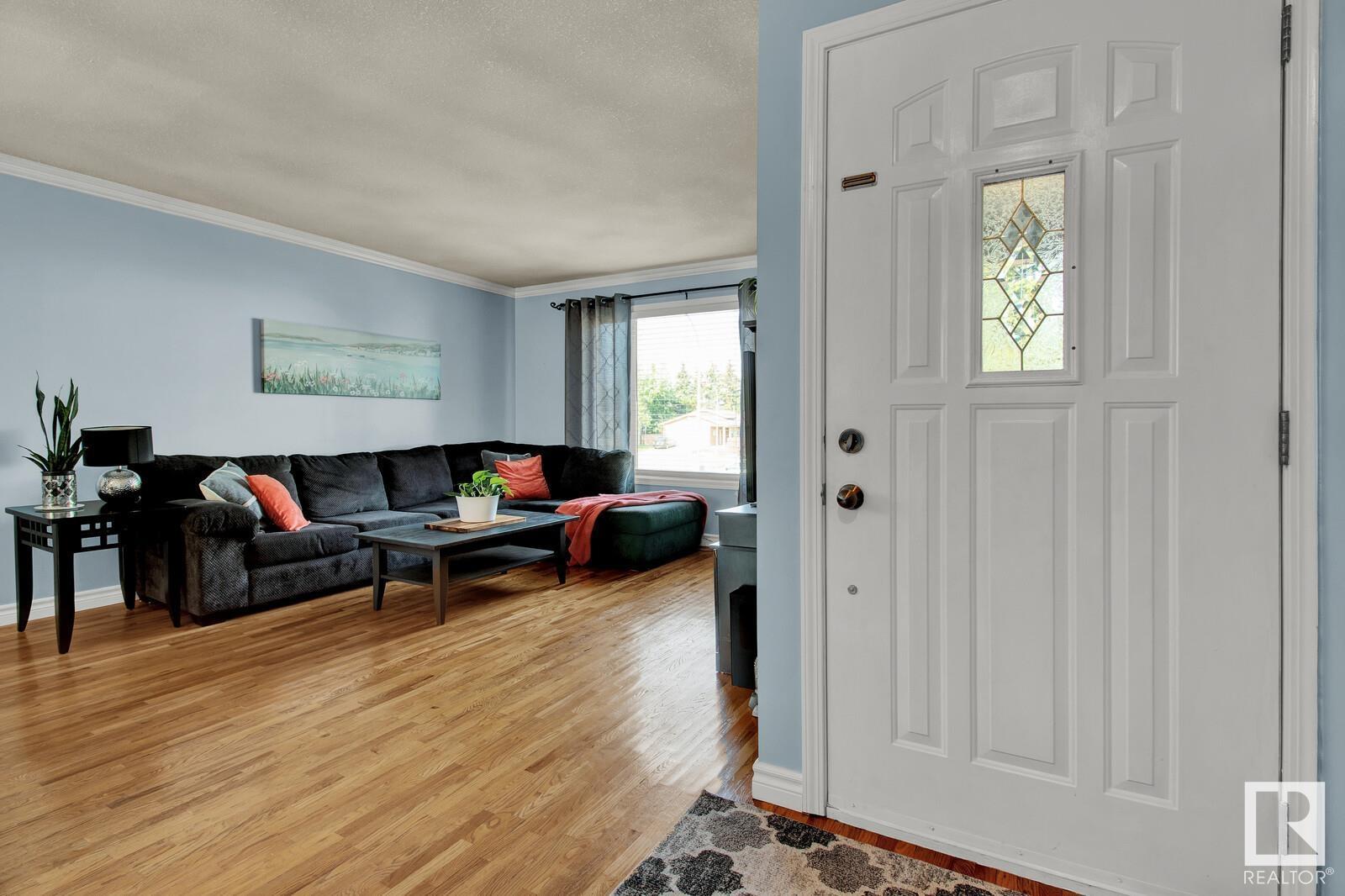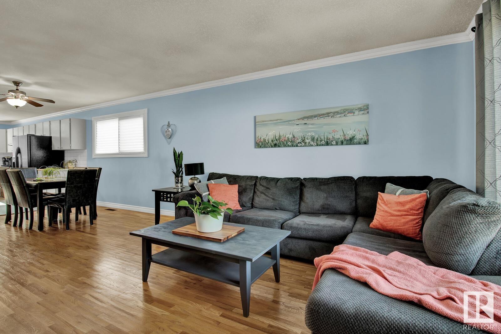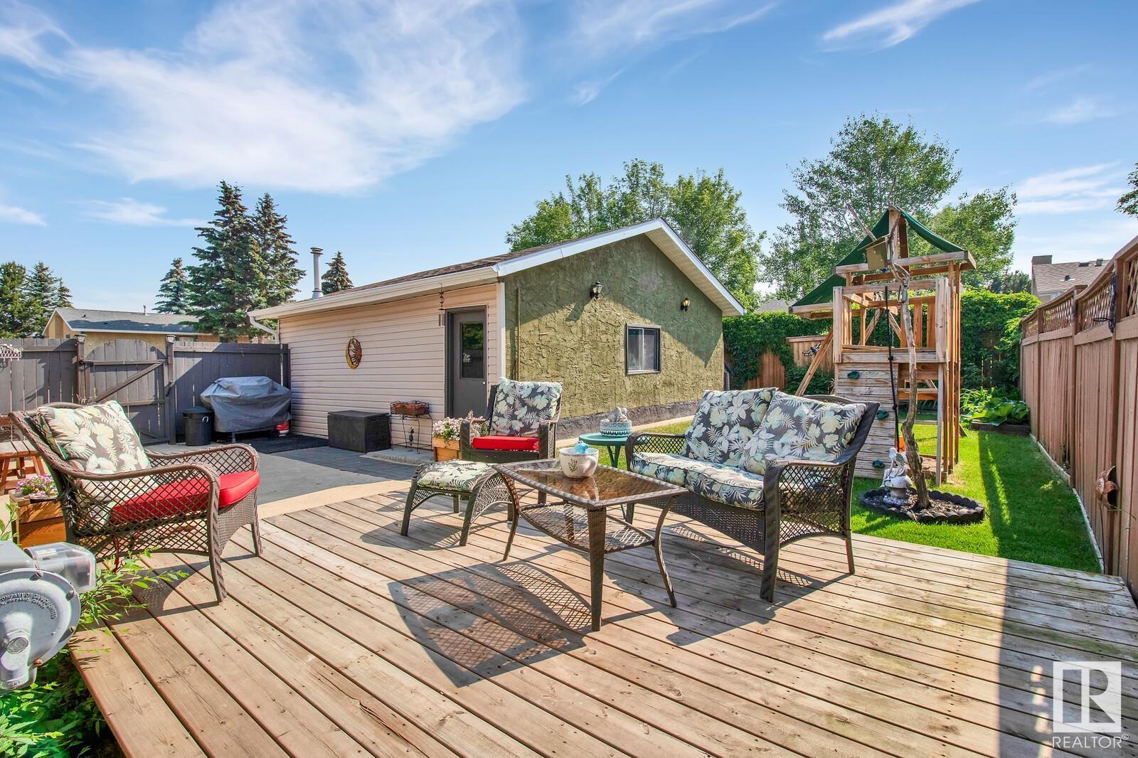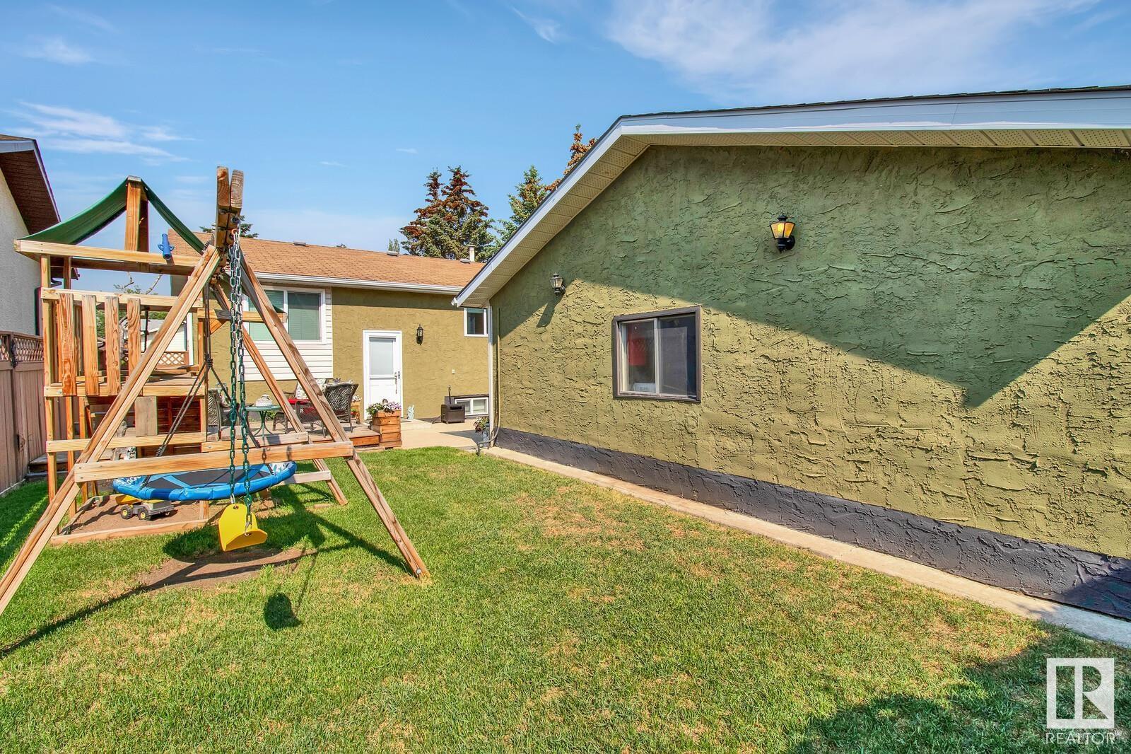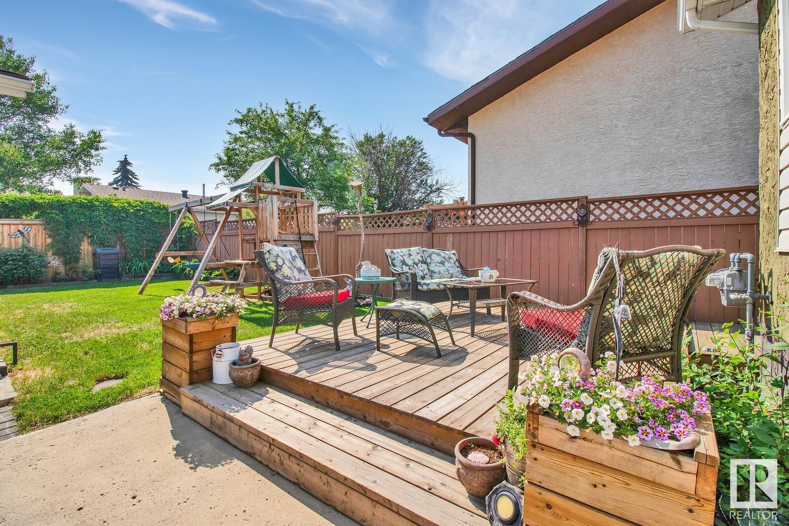 Gorgeous bungalow is located in a quiet crescent only steps to schools (Jr High & K-6), bus and quick access to Anthony Henday. Open floor plan with spacious kitchen open to dining and living areas. Features hardwood, vinyl plank and ceramic tile flooring, California knock down ceiling with crown moulding, spacious kitchen with 2 pantries. The kitchen over looks the fully fenced backyard with a large deck and patio. Basement is nicely finished with a 4th bedroom, family room, games room, laundry/storage room and full bathroom. Oversized 24 x 22 heated garage with 220V. Lots of parking including potential RV parking. Upgrades include furnace, hot water tank, facia, soffit and windows. Very well maintained inside and out. Shows great! For more details please visit the REALTOR's Website. (id:22211)