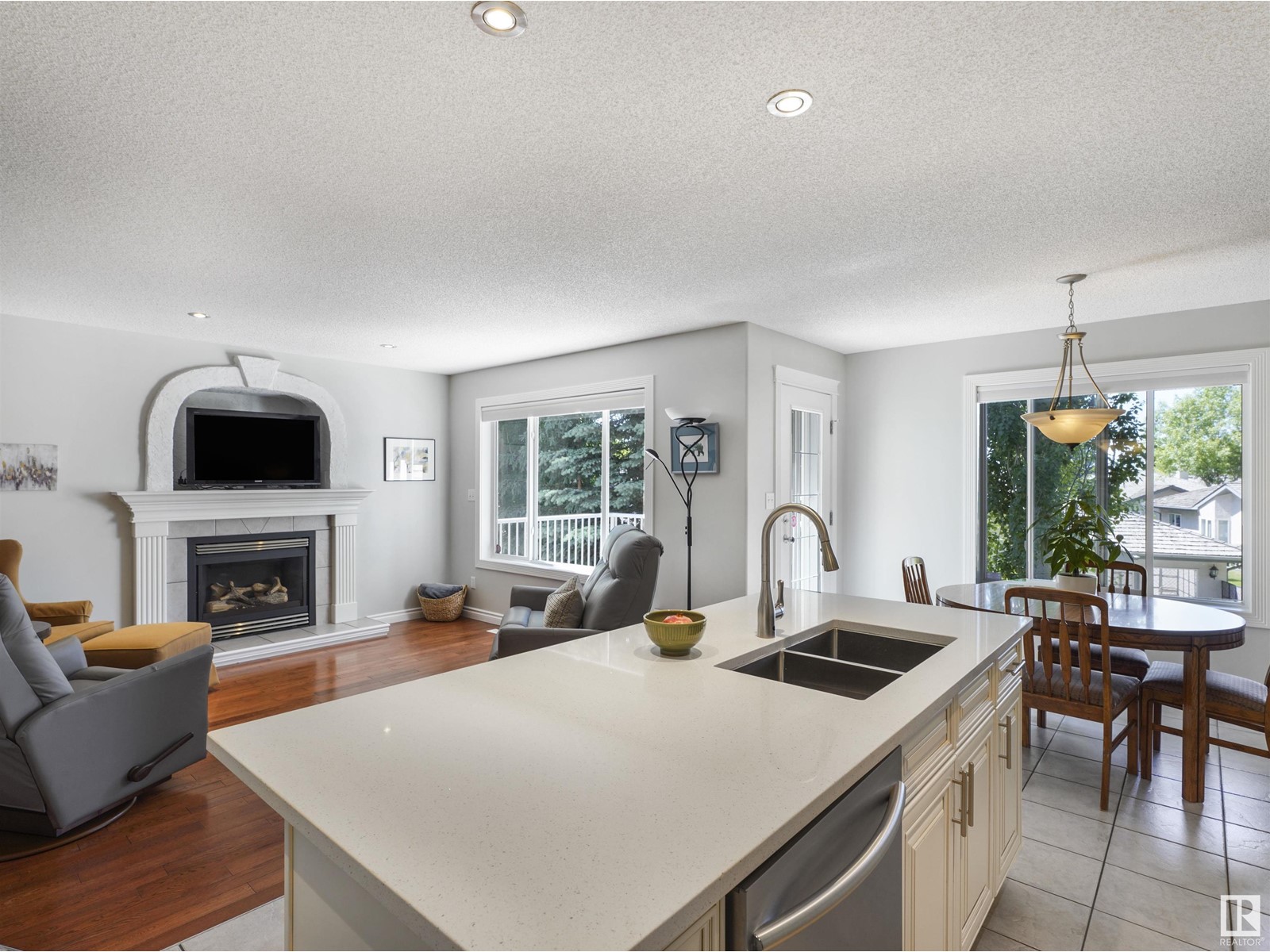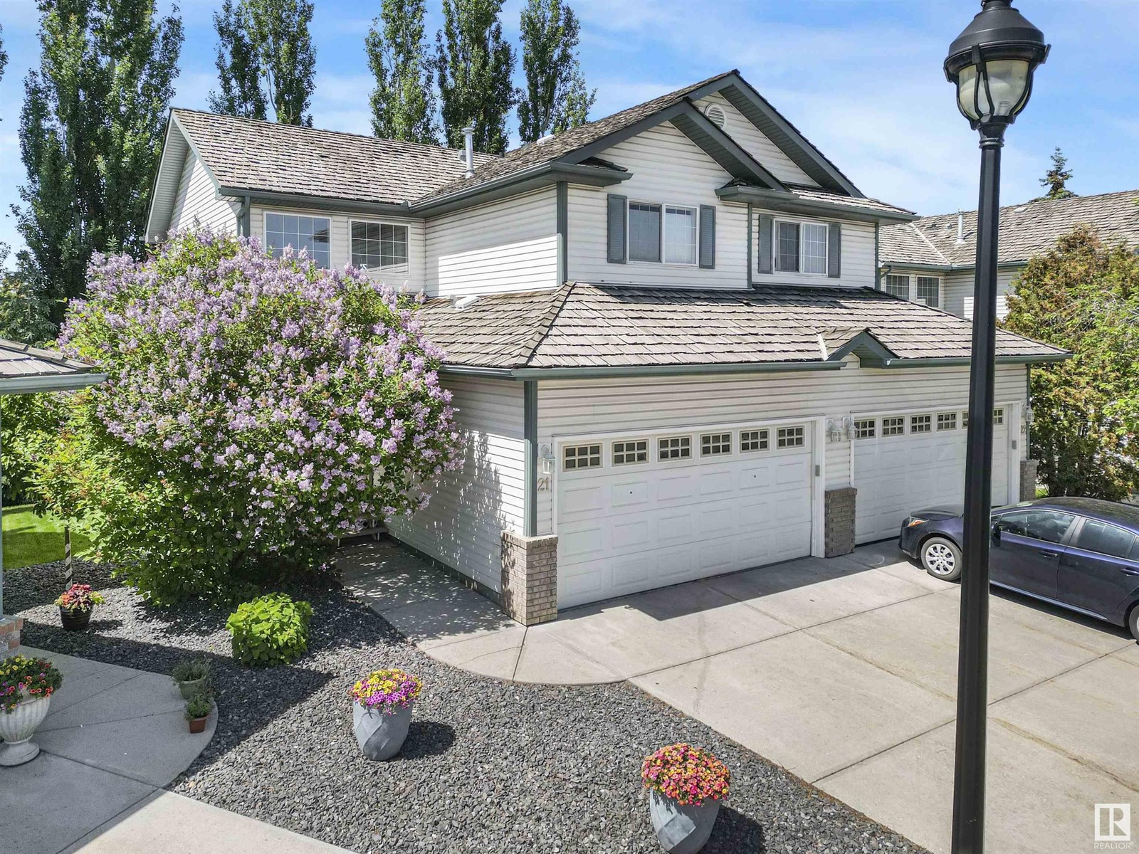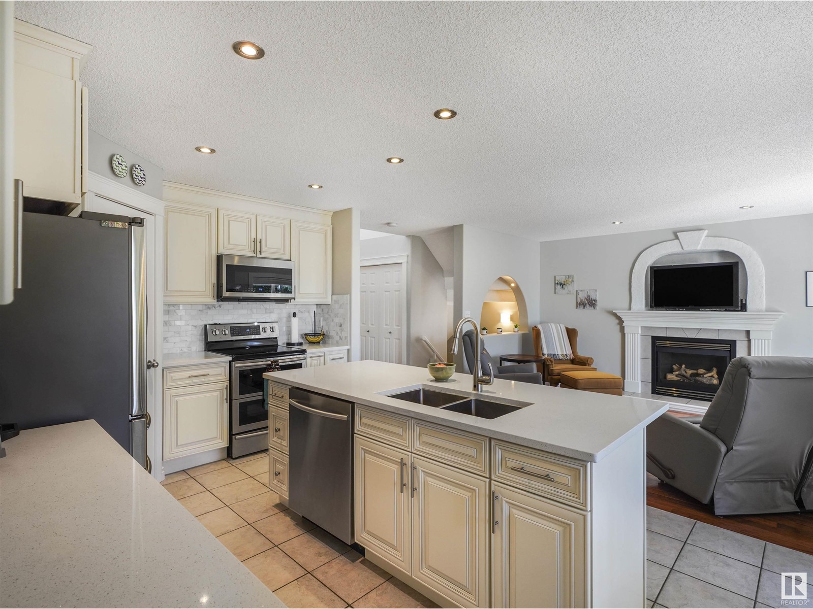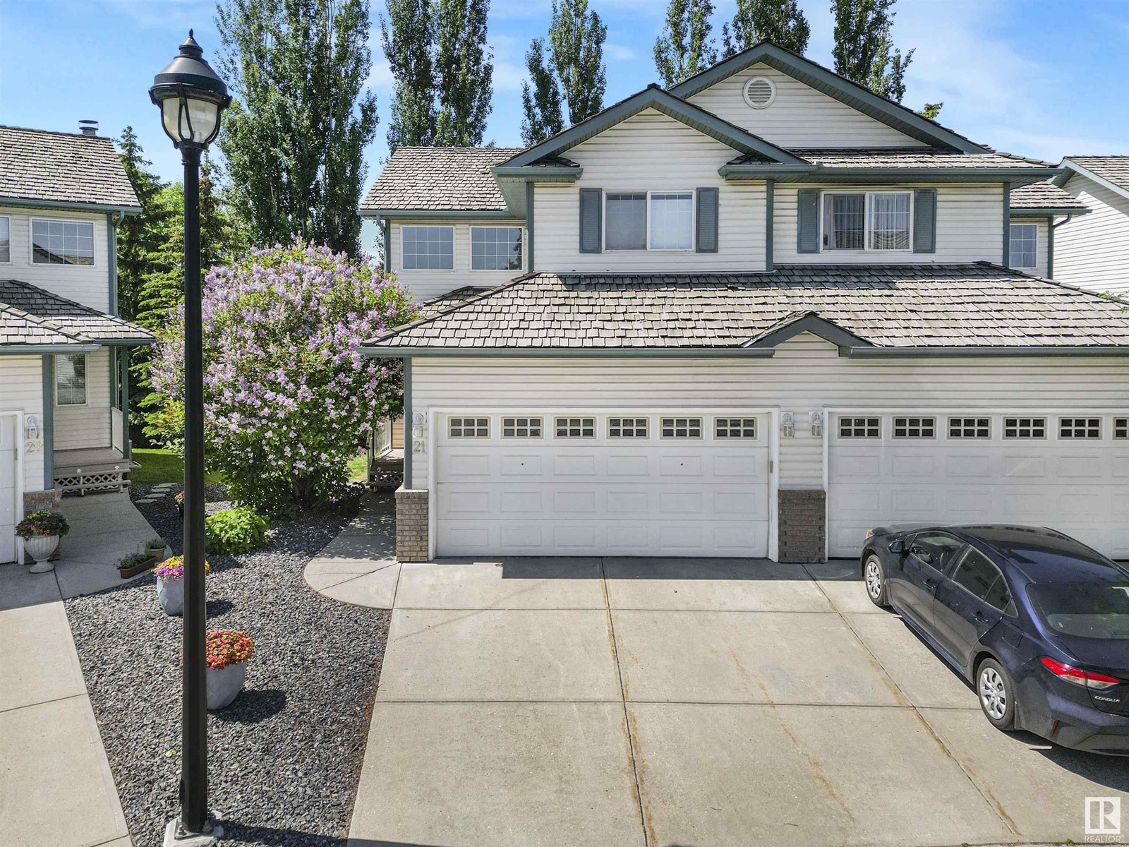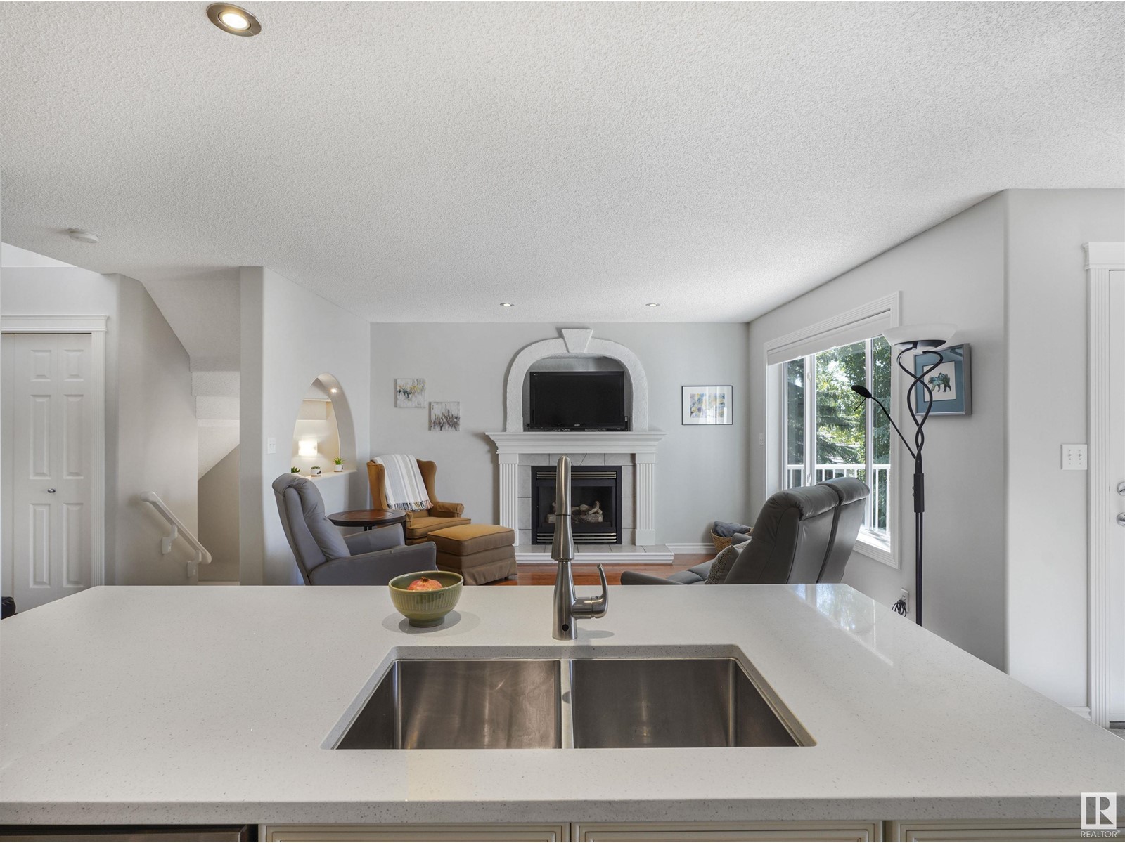 Beautiful duplex-style condo in BLACKBURN RAVINE! Explore the exclusive neighborhood of Blackburne Creek with its many trails great for running & nature walks. Soaring ceilings & open concept greet you at the front entry, with 1340 SF, 3 bdrms, 3 1/2 baths & DOUBLE ATTACHED GARAGE! The great room features hardwood floors, Hunter Douglas blinds, gas fireplace & a beautifully renovated island kitchen complete with new cabinets in vintage cream, QUARTZ countertops, stainless steel appliances, tiled backsplash & corner pantry. Connected dining space overlooks the rear yard/trees, where you can also enjoy your deck in privacy. Main floor 1/2 bath with laundry completes the this level. Upstairs is a oversized primary bedroom with walk-through closet & private 3 pce ensuite. 2 additional guest rooms and 4 pce bath are down the hall. The fully finished basement offers a large family/rec. area with 2nd gas fireplace and 3 pce bath. Close to playground & picnic area, amenities on 111 St. just South of the Henday. (id:22211)
