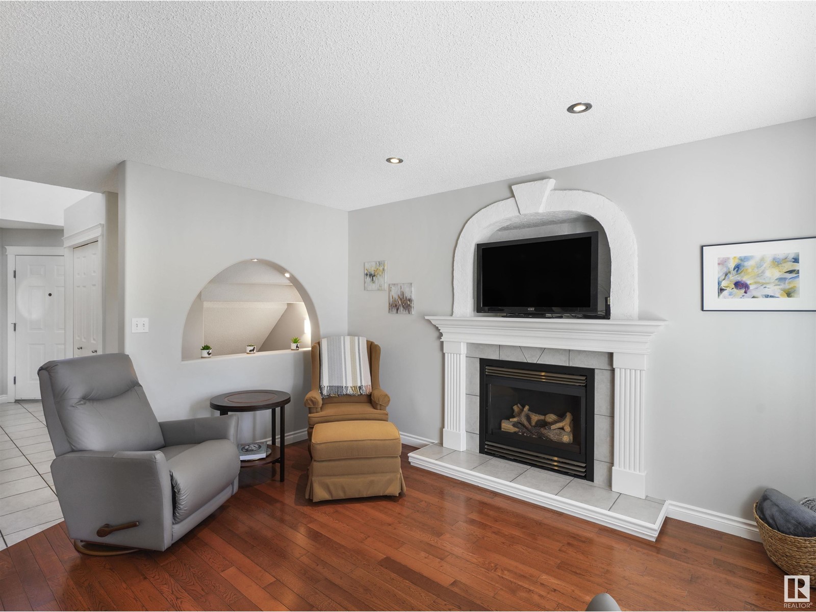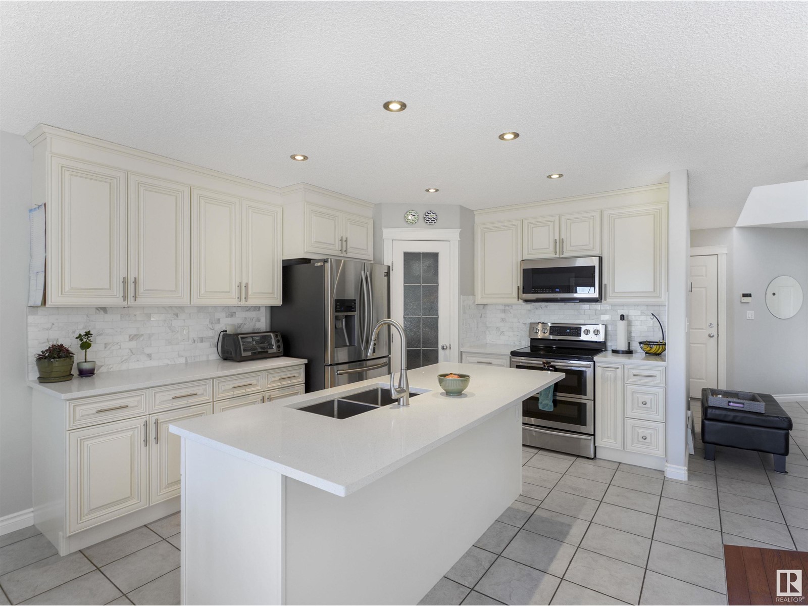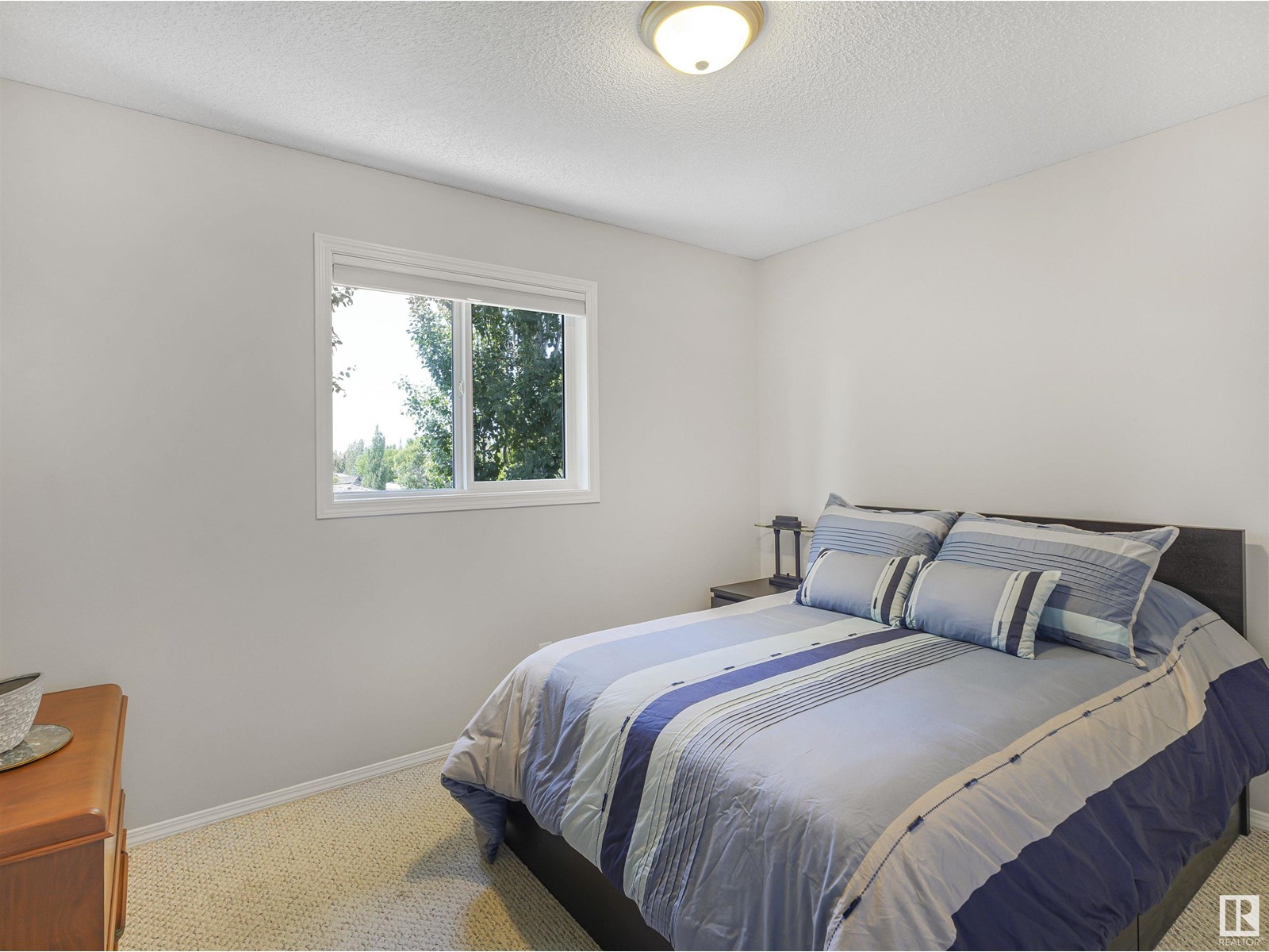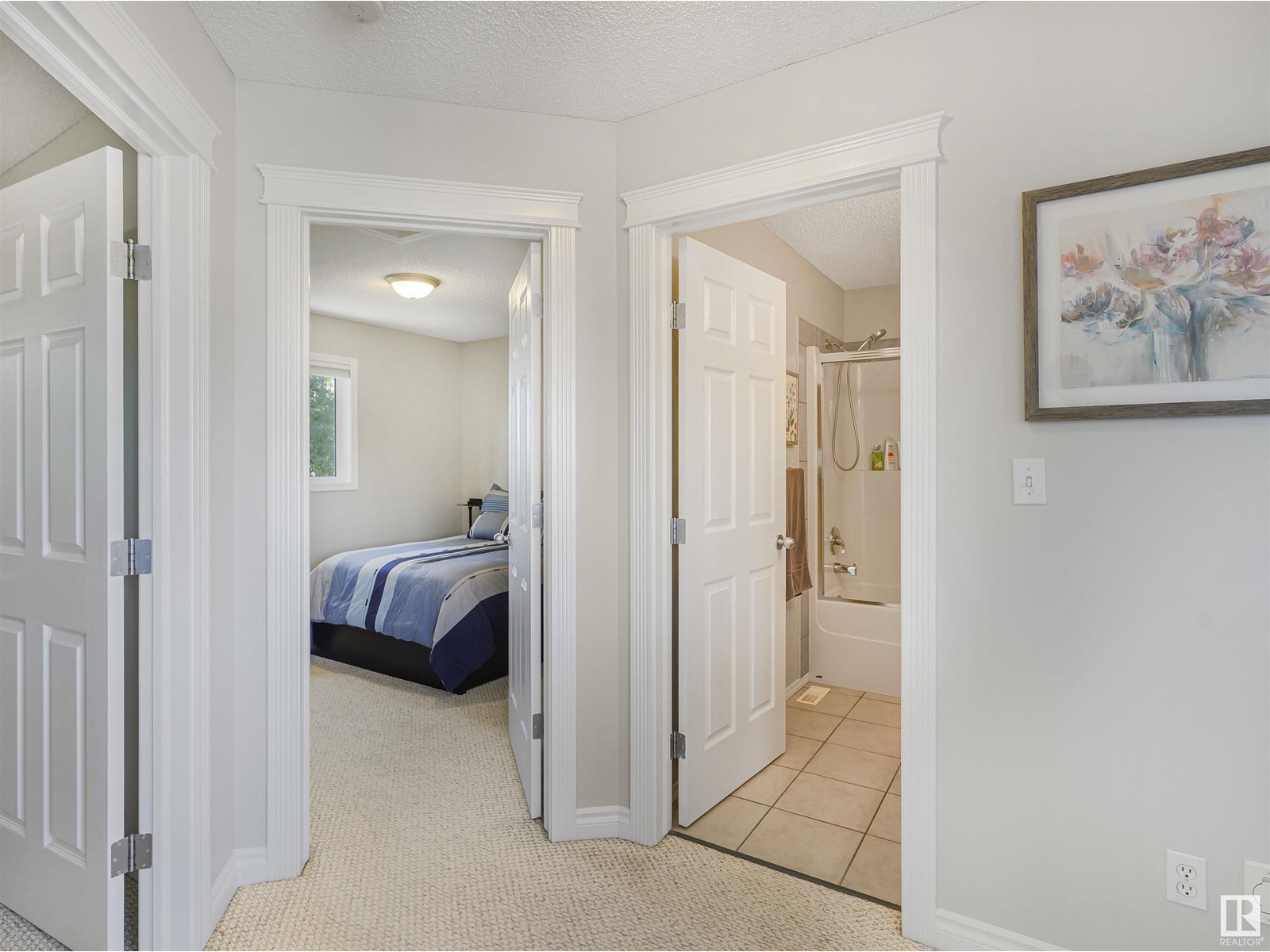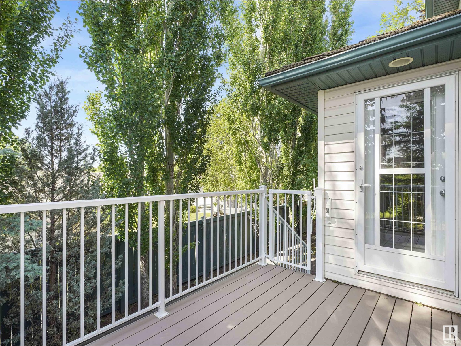 Beautiful duplex-style condo in BLACKBURN RAVINE! Explore the exclusive neighborhood of Blackburne Creek with its many trails great for running & nature walks. Soaring ceilings & open concept greet you at the front entry, with 1340 SF, 3 bdrms, 3 1/2 baths & DOUBLE ATTACHED GARAGE! The great room features hardwood floors, Hunter Douglas blinds, gas fireplace & a beautifully renovated island kitchen complete with new cabinets in vintage cream, QUARTZ countertops, stainless steel appliances, tiled backsplash & corner pantry. Connected dining space overlooks the rear yard/trees, where you can also enjoy your deck in privacy. Main floor 1/2 bath with laundry completes the this level. Upstairs is a oversized primary bedroom with walk-through closet & private 3 pce ensuite. 2 additional guest rooms and 4 pce bath are down the hall. The fully finished basement offers a large family/rec. area with 2nd gas fireplace and 3 pce bath. Close to playground & picnic area, amenities on 111 St. just South of the Henday. (id:22211)