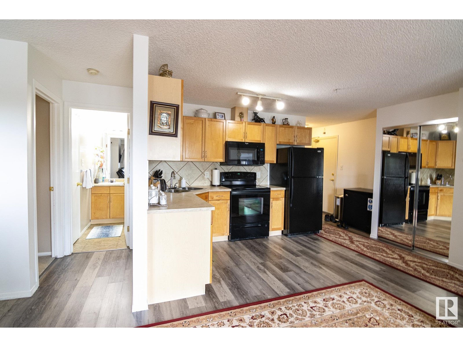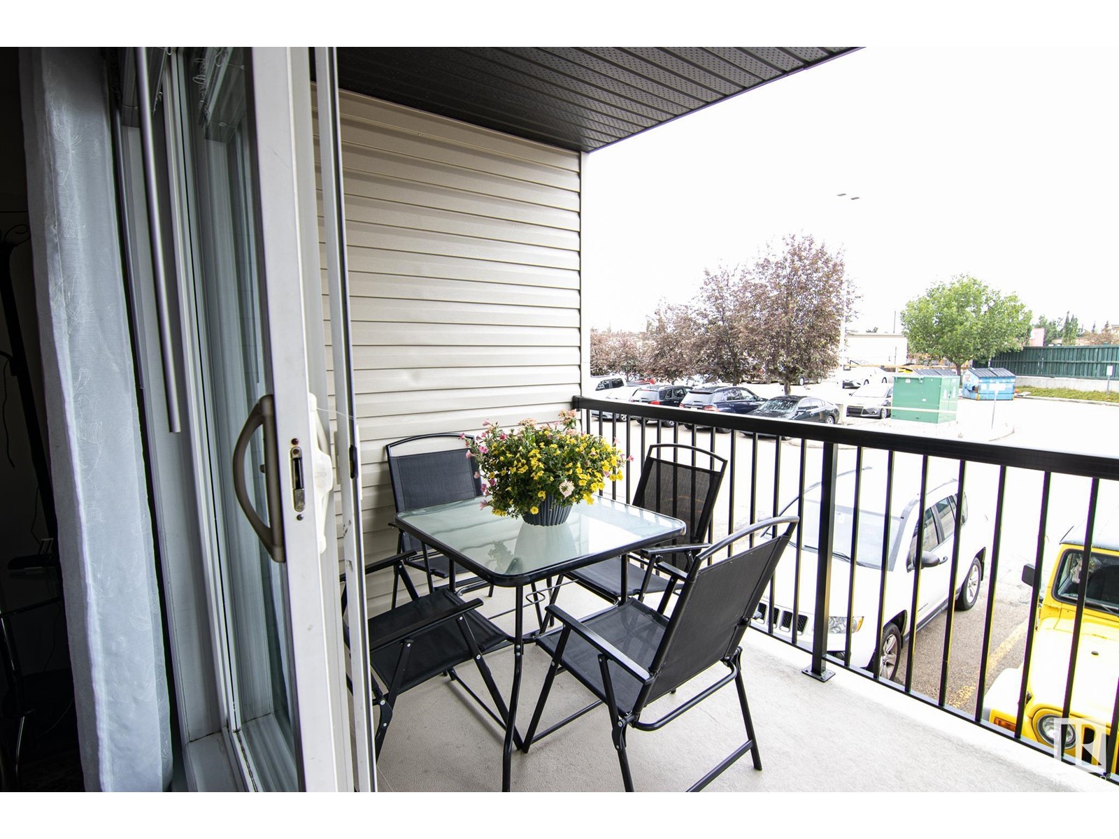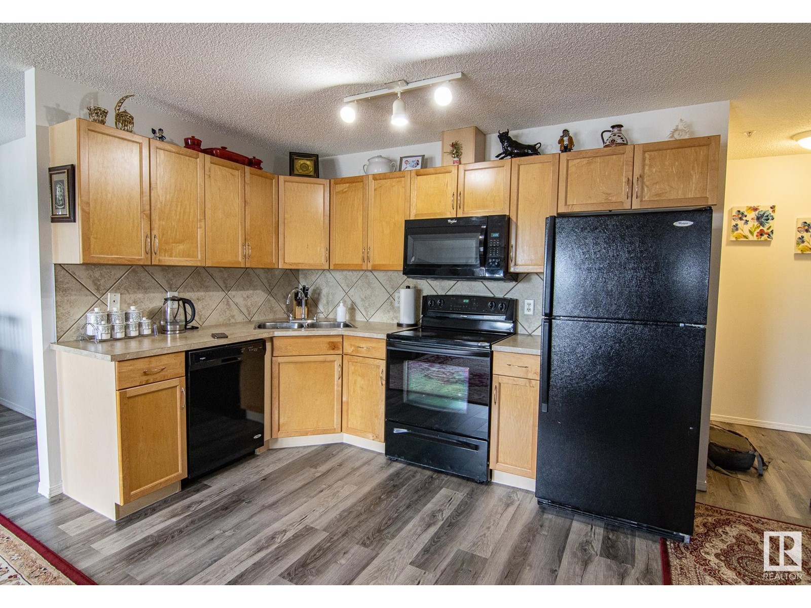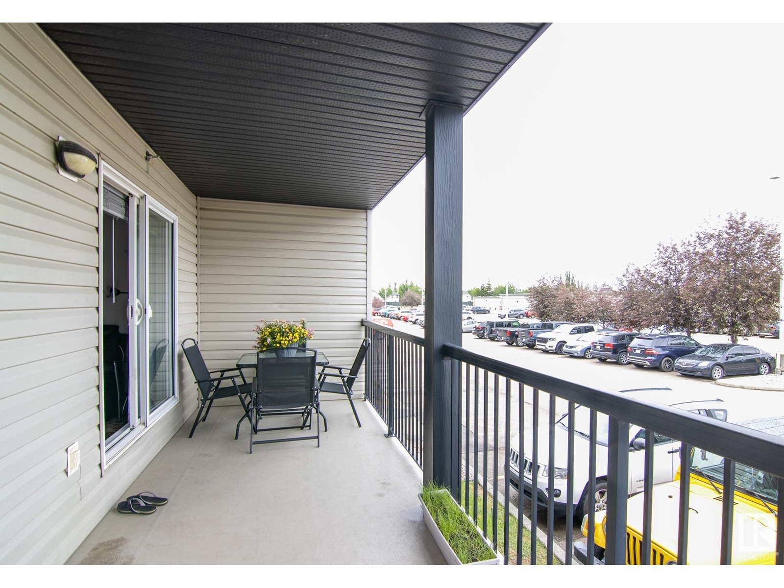 Two bedroom, two bathroom corner unit in the most desirable Grange Pointe. Newer paint and vinyl plank floors. Spacious open concept floor plan includes an open kitchen with maple cabinets and black appliances. Large living room and a dining area with large windows and lots of natural light, with sliding patio doors to the over sized wrap around corner large balcony. Spacious master bedroom has a walk through closet and en suite bathroom. A roomy second bedroom, and a second four piece bath with linen closet. This unit also offers in suite laundry and storage area, as well as one surface energized parking stall. Excellent access to shopping, public transportation, schools and located within minutes from the Whitemud and Anthony Henday. (id:22211)