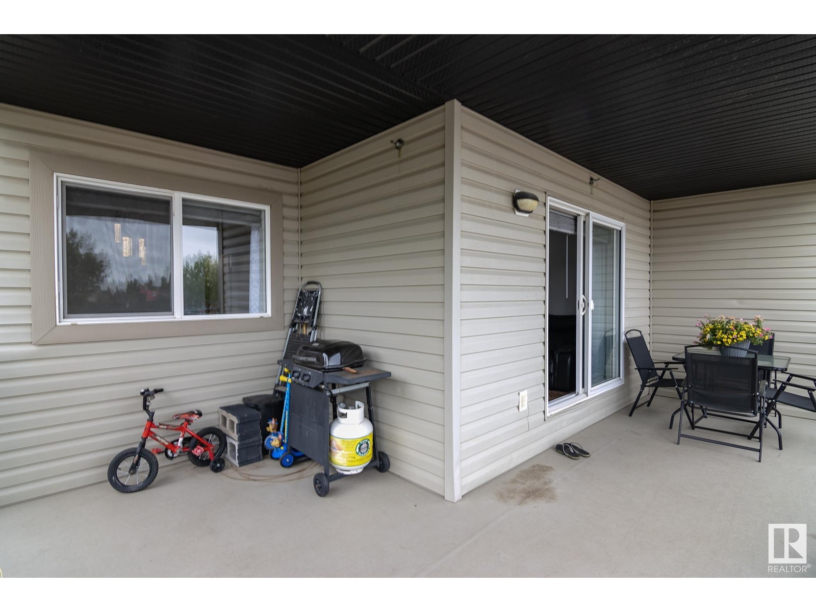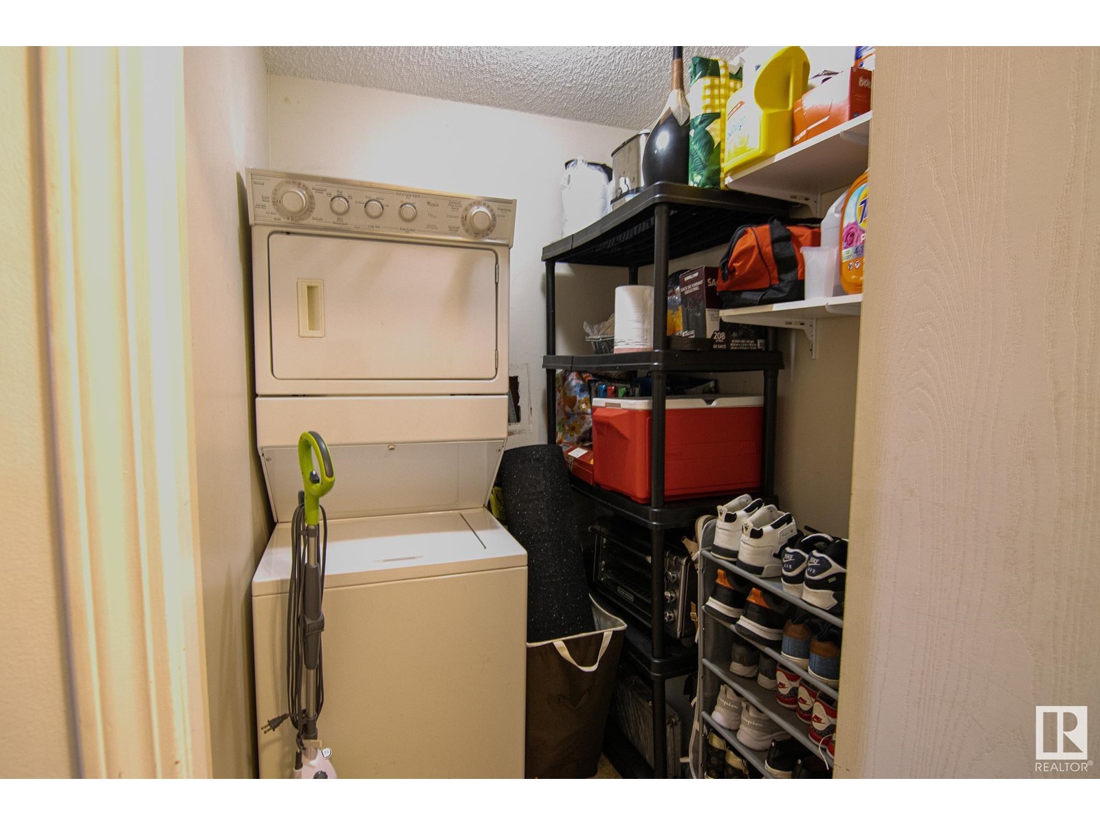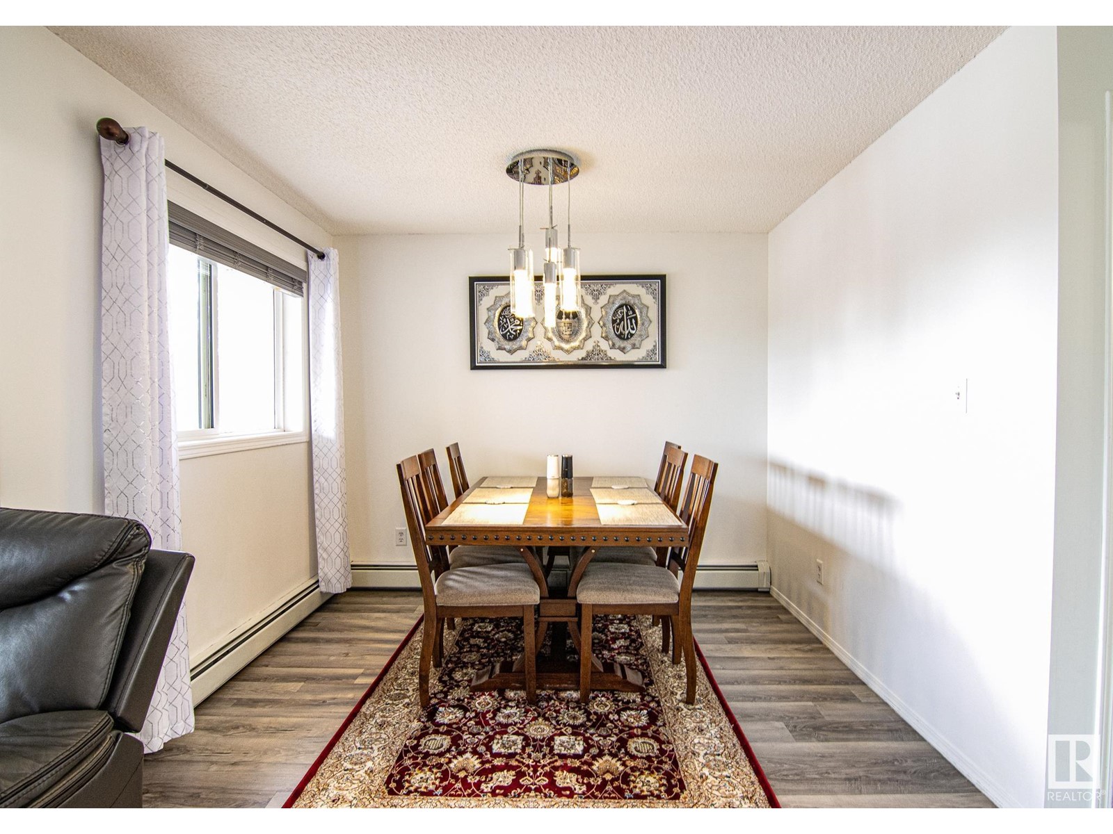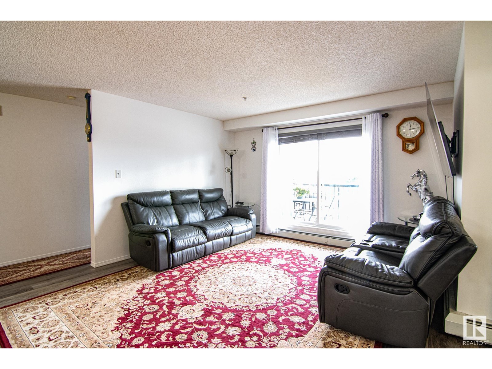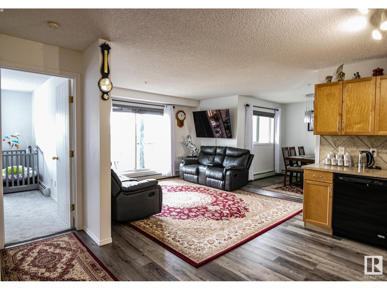 Two bedroom, two bathroom corner unit in the most desirable Grange Pointe. Newer paint and vinyl plank floors. Spacious open concept floor plan includes an open kitchen with maple cabinets and black appliances. Large living room and a dining area with large windows and lots of natural light, with sliding patio doors to the over sized wrap around corner large balcony. Spacious master bedroom has a walk through closet and en suite bathroom. A roomy second bedroom, and a second four piece bath with linen closet. This unit also offers in suite laundry and storage area, as well as one surface energized parking stall. Excellent access to shopping, public transportation, schools and located within minutes from the Whitemud and Anthony Henday. (id:22211)