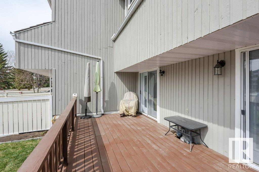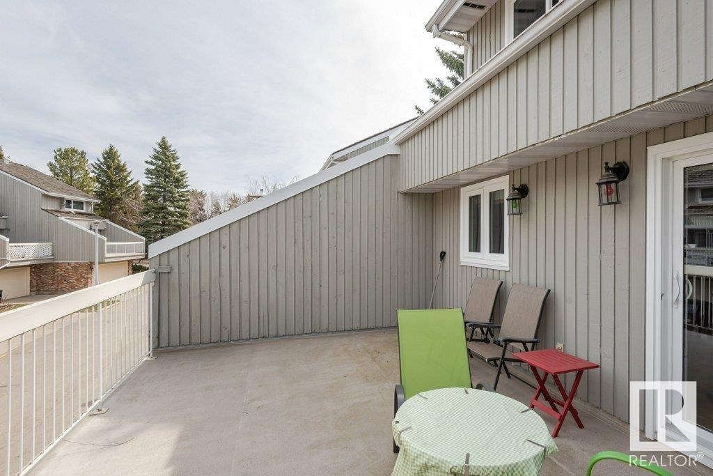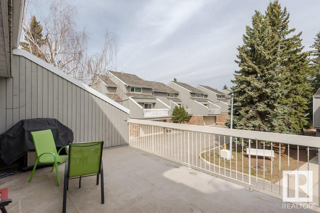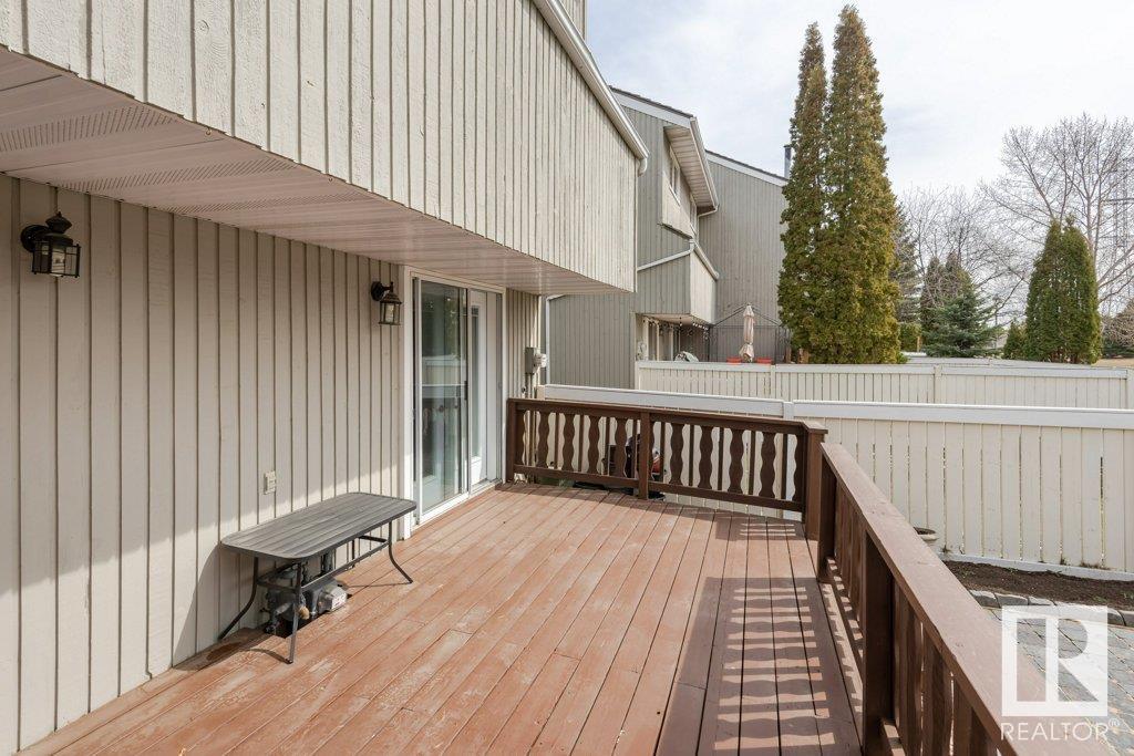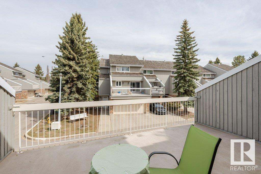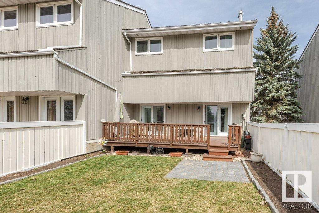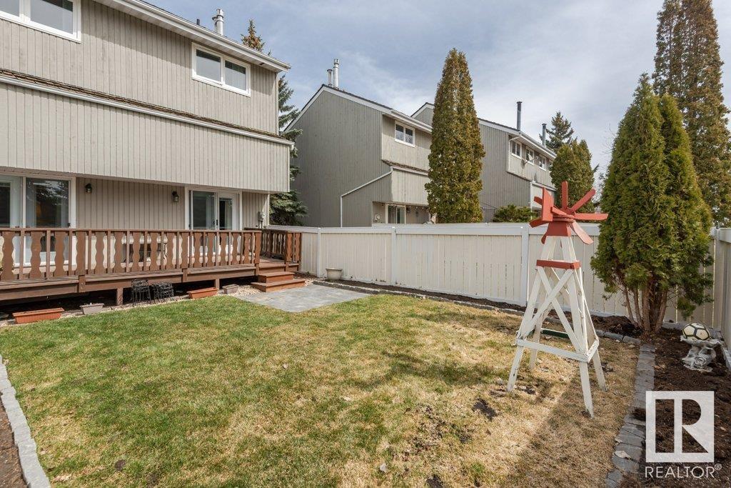 Backing onto greenspace, large yard and updated! This end unit three bedroom home is perfectly located, steps to shopping, restaurants, LRT, and schools. Excellent layout for a professional couple or a familiy that wants to be near schools and/or easy access to U of A. The upgraded kitchen features Cherry cabinets, spacious island, quartz counters, stainless steel appliances and cork floors, and this space leads to a large balcony for barbeques or to relax on. The dining room overlooks the living room with soaring ceilings, brick fireplace plus 2 sets of doors leading out to the deck and large fenced yard. Enjoy the bright and sunny south yard, what a great setup for entertaining! Upstairs the master bedroom w/ ensuite has room for a king sized bed, and there are 2 additional bedrooms and main bathroom with double sink. The basement has ample storage and there is a den. Well managed complex with newer vinyl windows, & doors. Added bonus is double garage! Furnace & hwt checked regularly (2022) (id:22211)