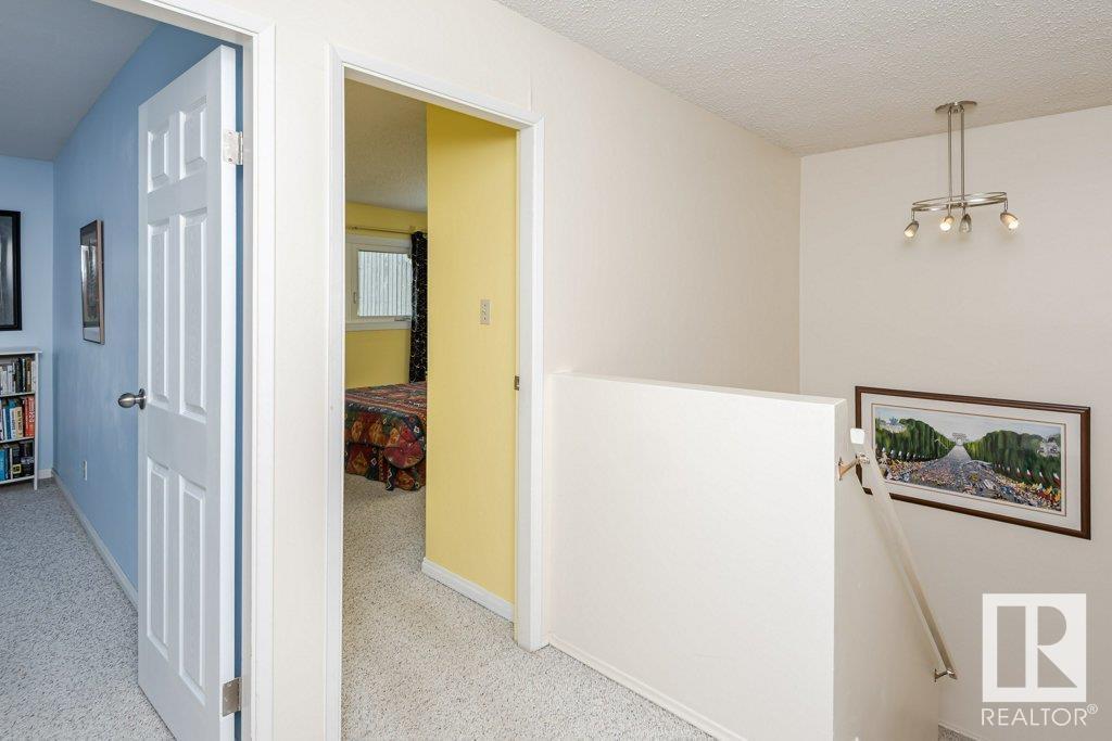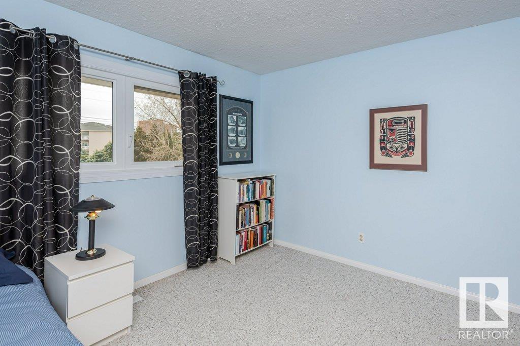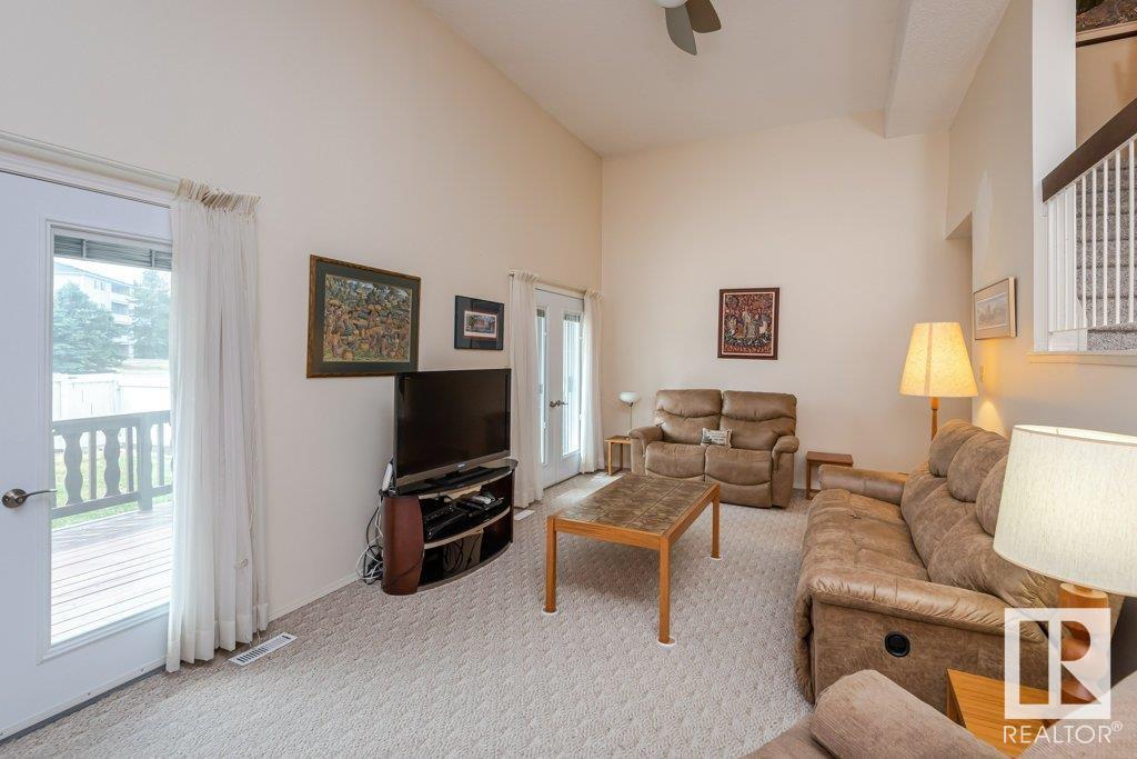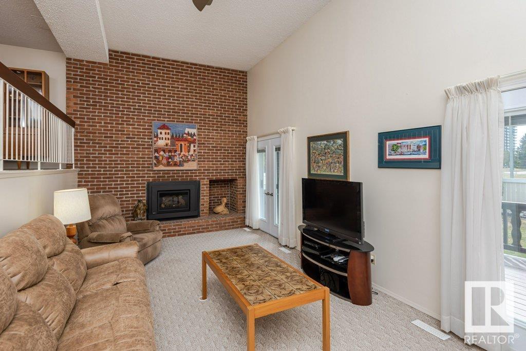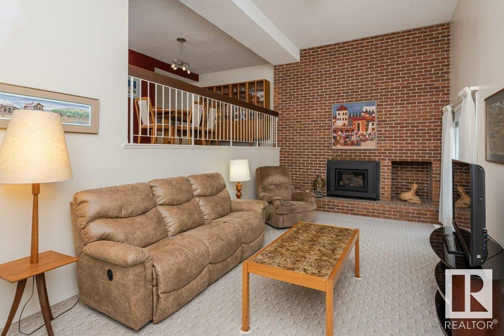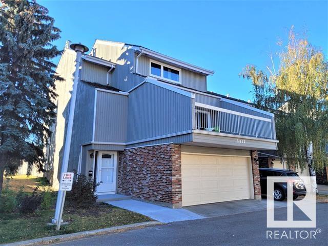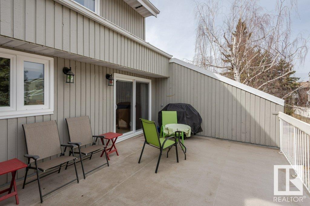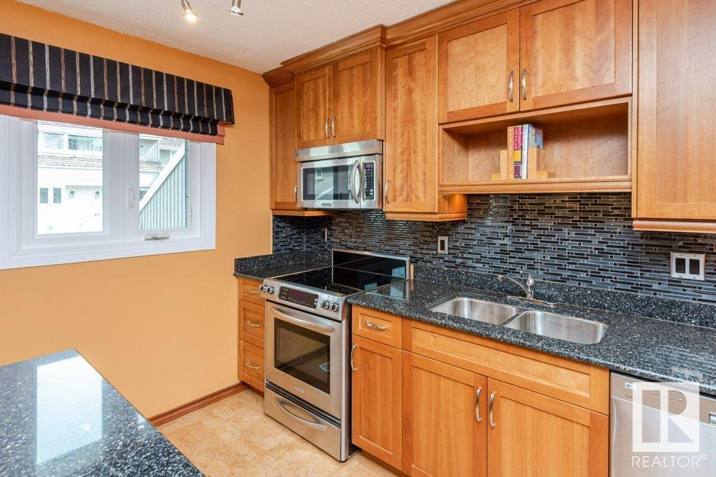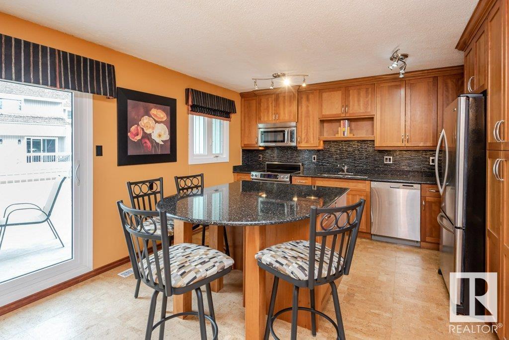 Backing onto greenspace, large yard and updated! This end unit three bedroom home is perfectly located, steps to shopping, restaurants, LRT, and schools. Excellent layout for a professional couple or a familiy that wants to be near schools and/or easy access to U of A. The upgraded kitchen features Cherry cabinets, spacious island, quartz counters, stainless steel appliances and cork floors, and this space leads to a large balcony for barbeques or to relax on. The dining room overlooks the living room with soaring ceilings, brick fireplace plus 2 sets of doors leading out to the deck and large fenced yard. Enjoy the bright and sunny south yard, what a great setup for entertaining! Upstairs the master bedroom w/ ensuite has room for a king sized bed, and there are 2 additional bedrooms and main bathroom with double sink. The basement has ample storage and there is a den. Well managed complex with newer vinyl windows, & doors. Added bonus is double garage! Furnace & hwt checked regularly (2022) (id:22211)