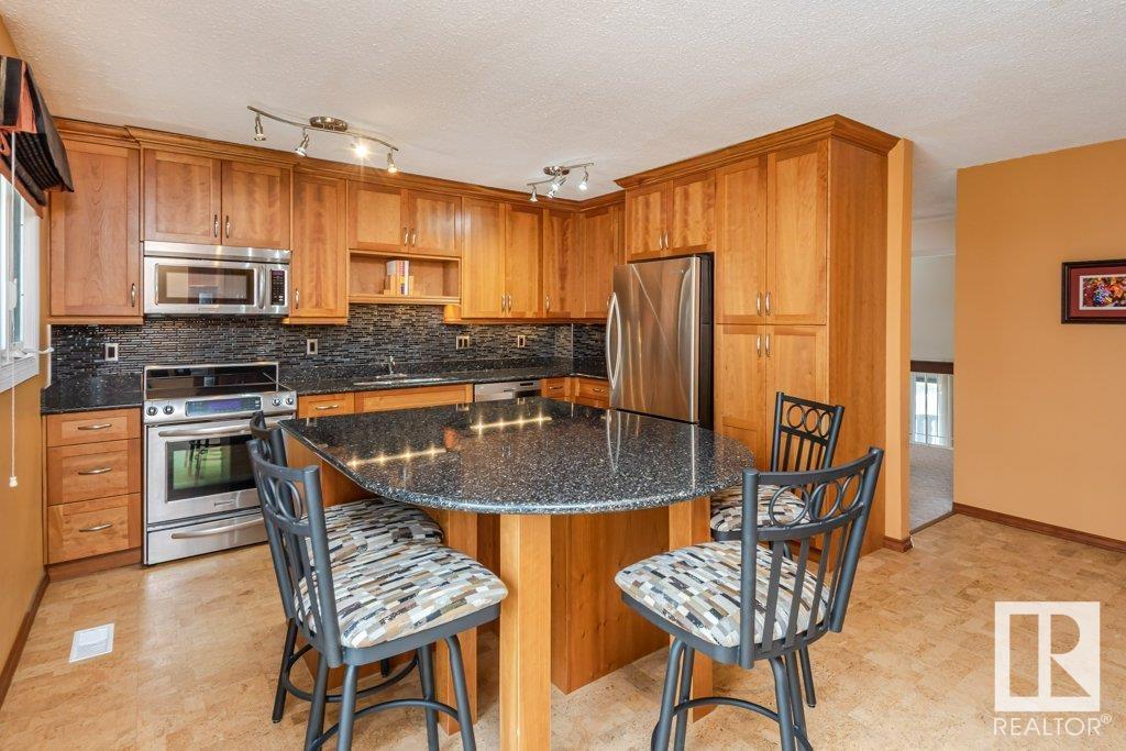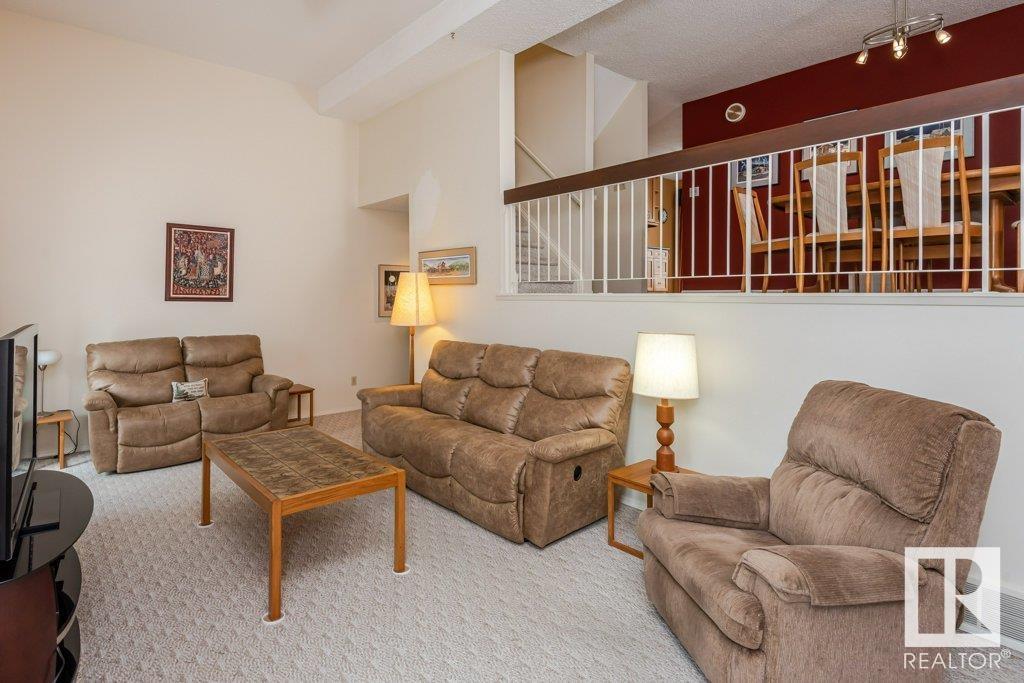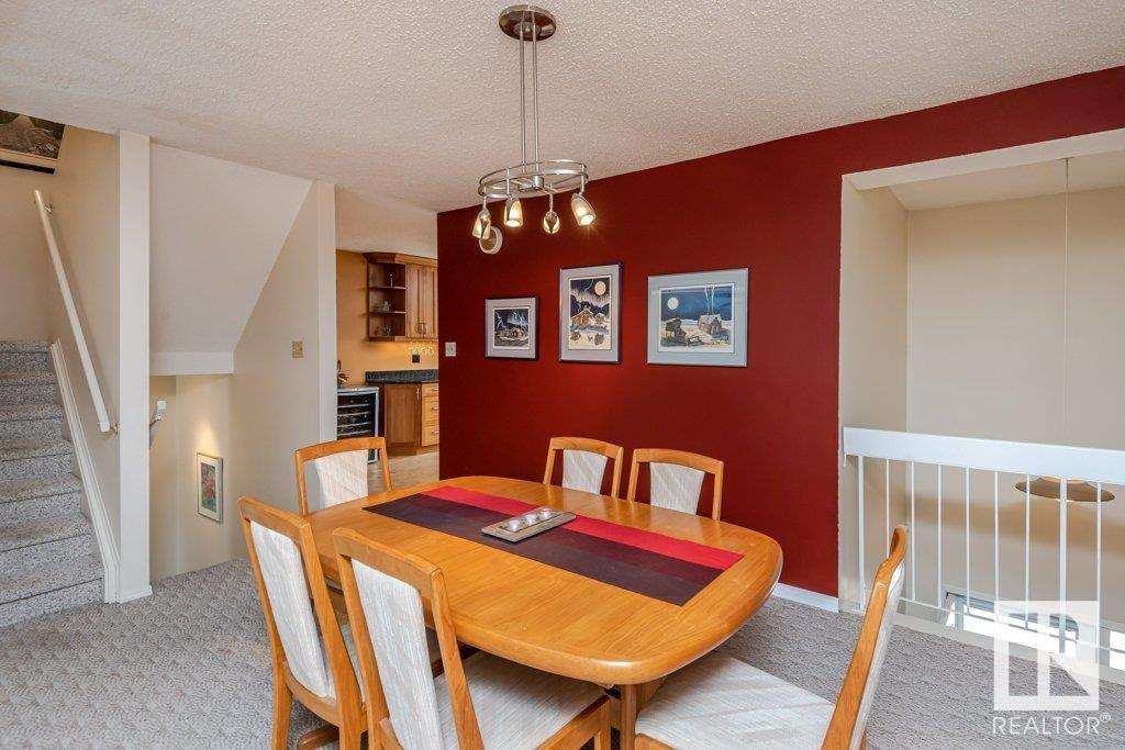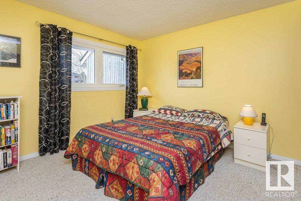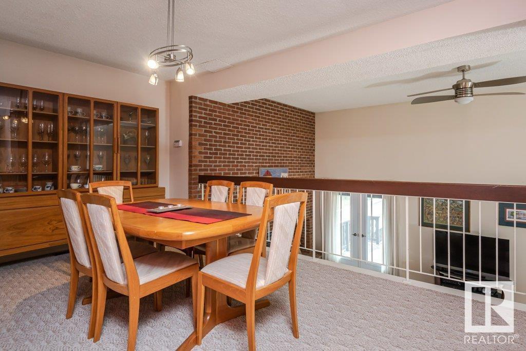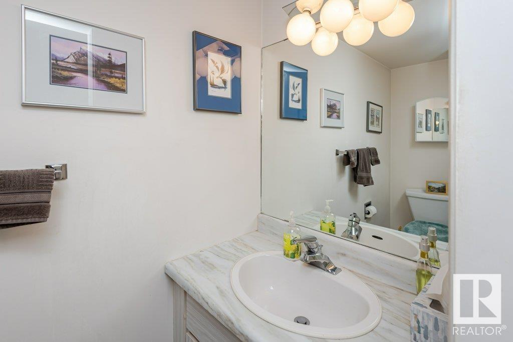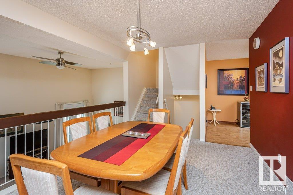 Backing onto greenspace, large yard and updated! This end unit three bedroom home is perfectly located, steps to shopping, restaurants, LRT, and schools. Excellent layout for a professional couple or a familiy that wants to be near schools and/or easy access to U of A. The upgraded kitchen features Cherry cabinets, spacious island, quartz counters, stainless steel appliances and cork floors, and this space leads to a large balcony for barbeques or to relax on. The dining room overlooks the living room with soaring ceilings, brick fireplace plus 2 sets of doors leading out to the deck and large fenced yard. Enjoy the bright and sunny south yard, what a great setup for entertaining! Upstairs the master bedroom w/ ensuite has room for a king sized bed, and there are 2 additional bedrooms and main bathroom with double sink. The basement has ample storage and there is a den. Well managed complex with newer vinyl windows, & doors. Added bonus is double garage! Furnace & hwt checked regularly (2022) (id:22211)