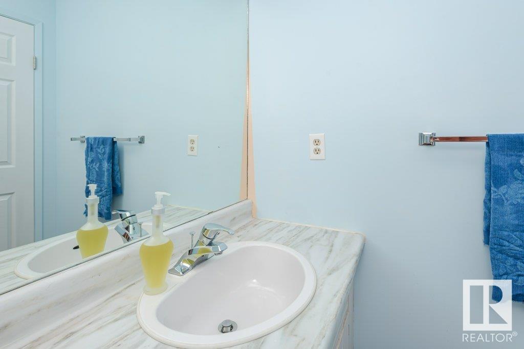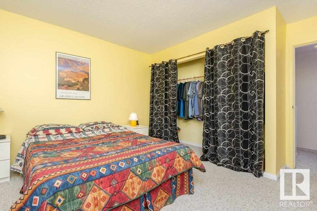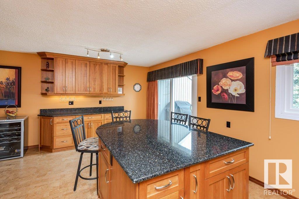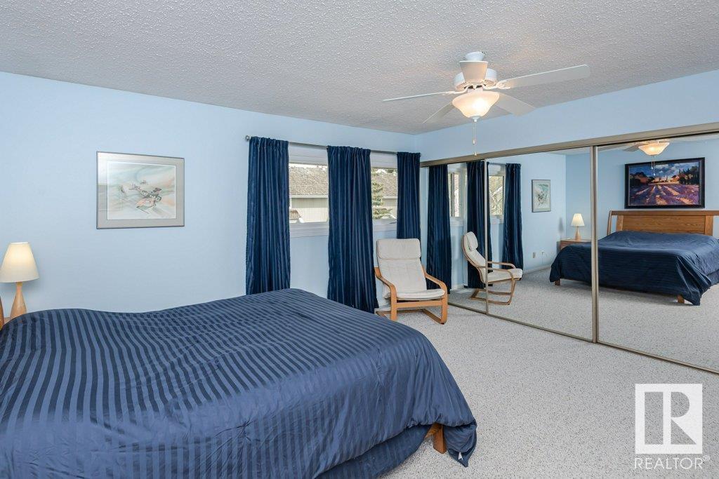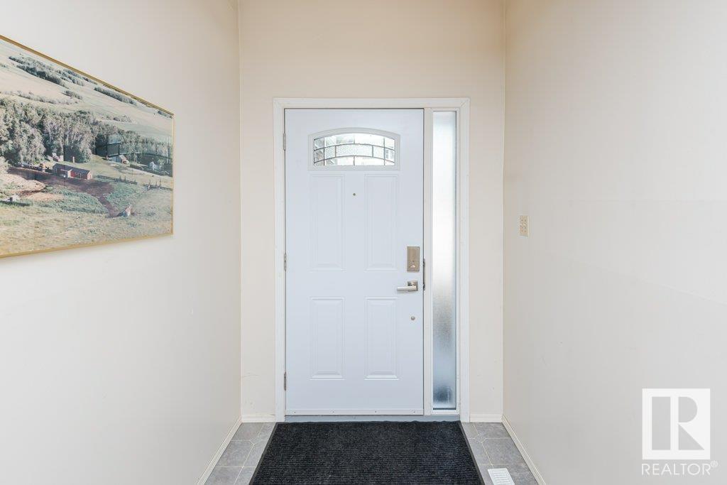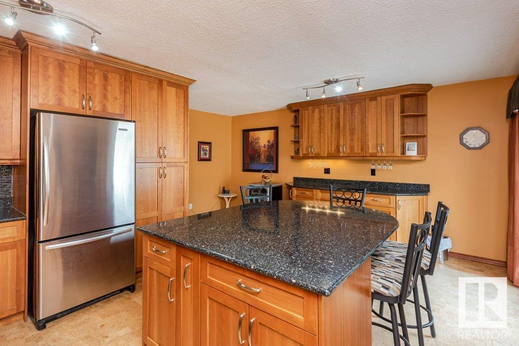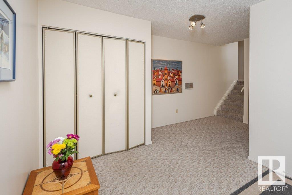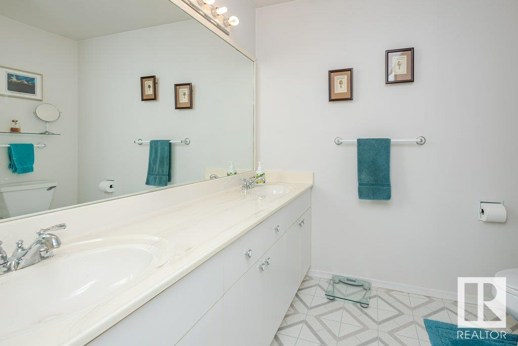 Backing onto greenspace, large yard and updated! This end unit three bedroom home is perfectly located, steps to shopping, restaurants, LRT, and schools. Excellent layout for a professional couple or a familiy that wants to be near schools and/or easy access to U of A. The upgraded kitchen features Cherry cabinets, spacious island, quartz counters, stainless steel appliances and cork floors, and this space leads to a large balcony for barbeques or to relax on. The dining room overlooks the living room with soaring ceilings, brick fireplace plus 2 sets of doors leading out to the deck and large fenced yard. Enjoy the bright and sunny south yard, what a great setup for entertaining! Upstairs the master bedroom w/ ensuite has room for a king sized bed, and there are 2 additional bedrooms and main bathroom with double sink. The basement has ample storage and there is a den. Well managed complex with newer vinyl windows, & doors. Added bonus is double garage! Furnace & hwt checked regularly (2022) (id:22211)