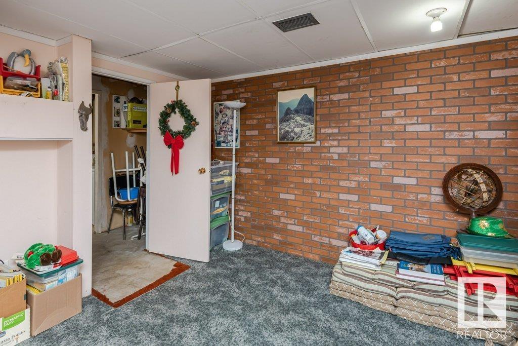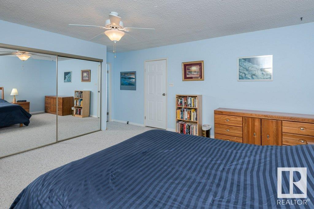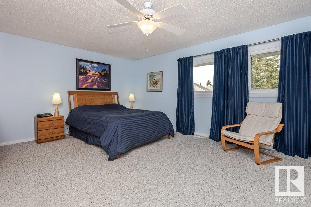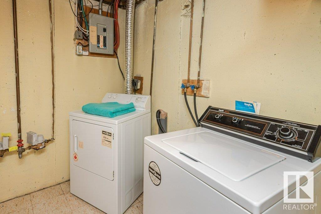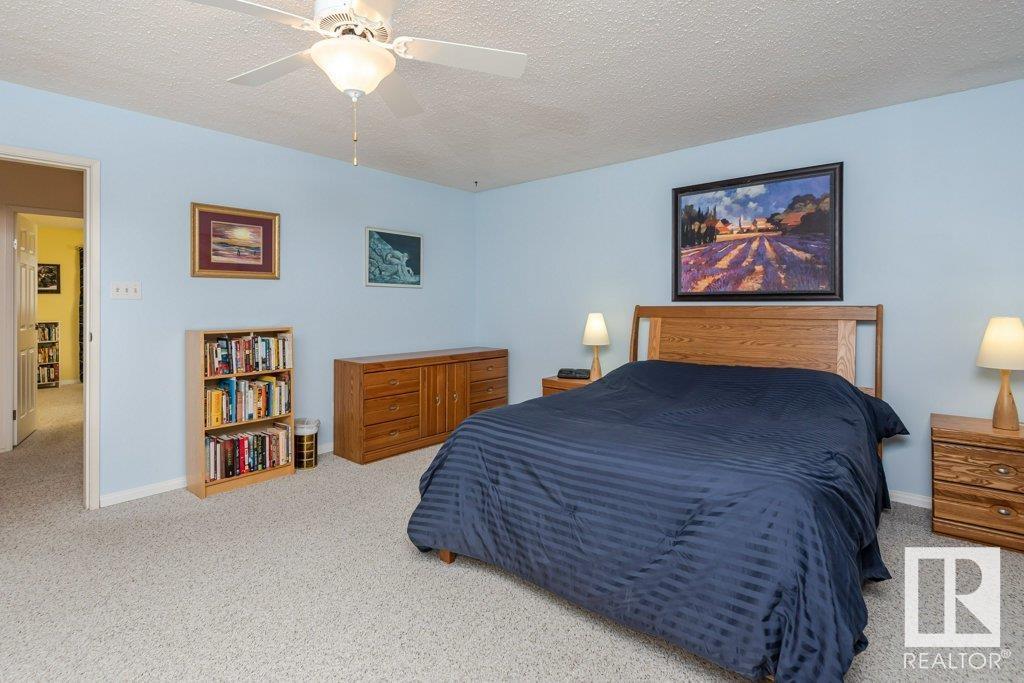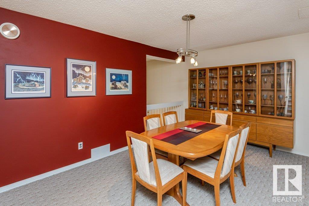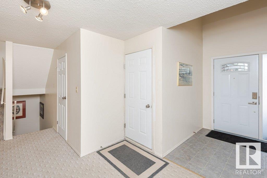 Backing onto greenspace, large yard and updated! This end unit three bedroom home is perfectly located, steps to shopping, restaurants, LRT, and schools. Excellent layout for a professional couple or a familiy that wants to be near schools and/or easy access to U of A. The upgraded kitchen features Cherry cabinets, spacious island, quartz counters, stainless steel appliances and cork floors, and this space leads to a large balcony for barbeques or to relax on. The dining room overlooks the living room with soaring ceilings, brick fireplace plus 2 sets of doors leading out to the deck and large fenced yard. Enjoy the bright and sunny south yard, what a great setup for entertaining! Upstairs the master bedroom w/ ensuite has room for a king sized bed, and there are 2 additional bedrooms and main bathroom with double sink. The basement has ample storage and there is a den. Well managed complex with newer vinyl windows, & doors. Added bonus is double garage! Furnace & hwt checked regularly (2022) (id:22211)