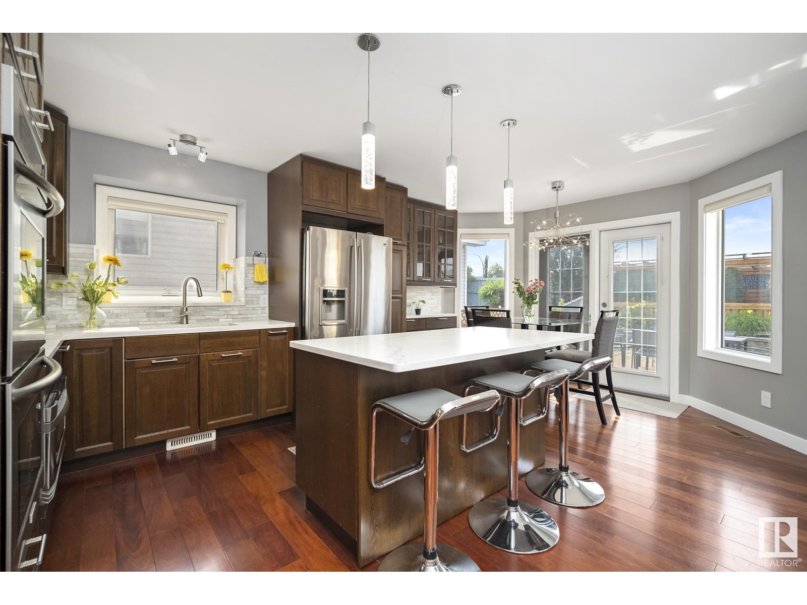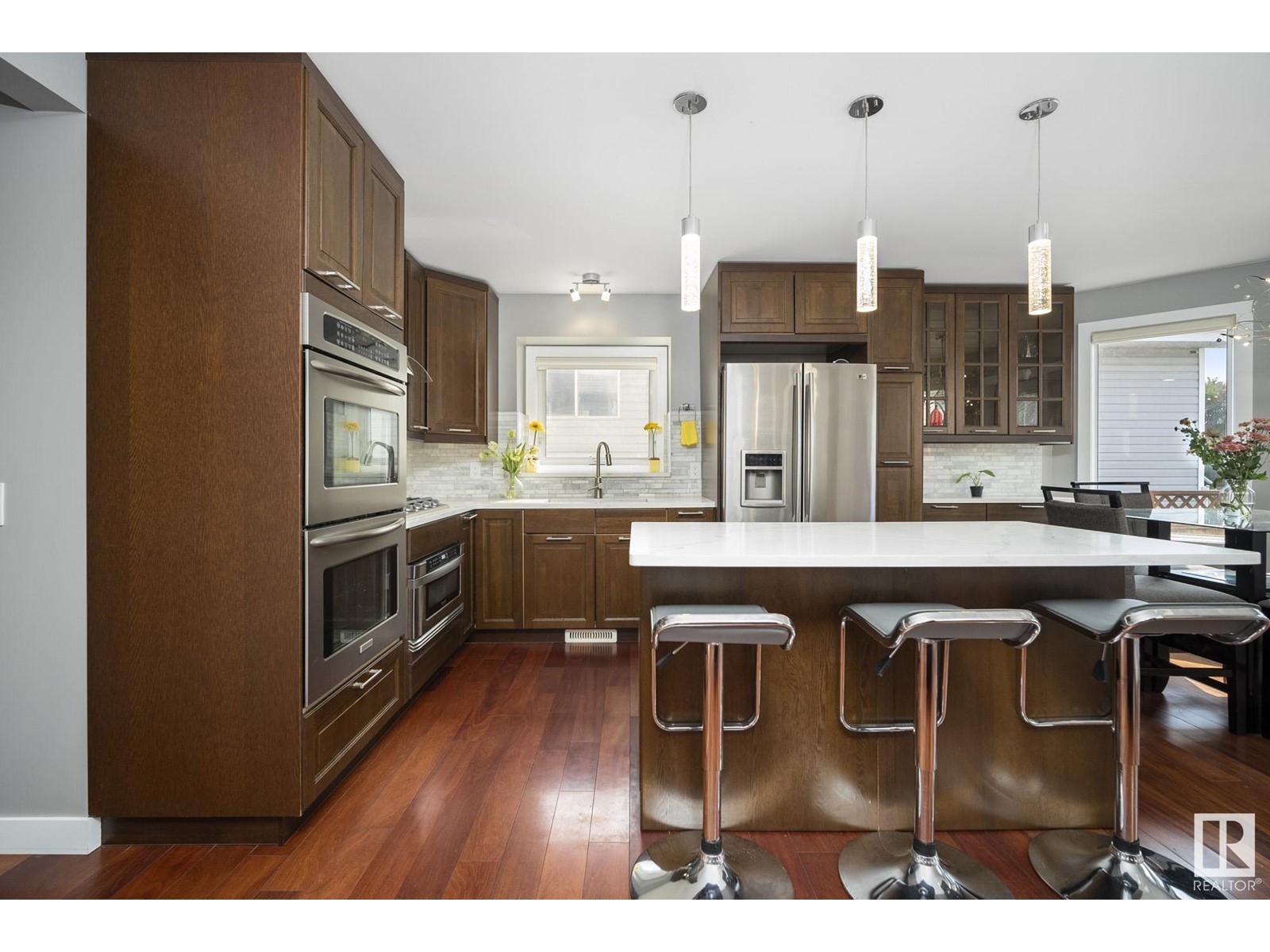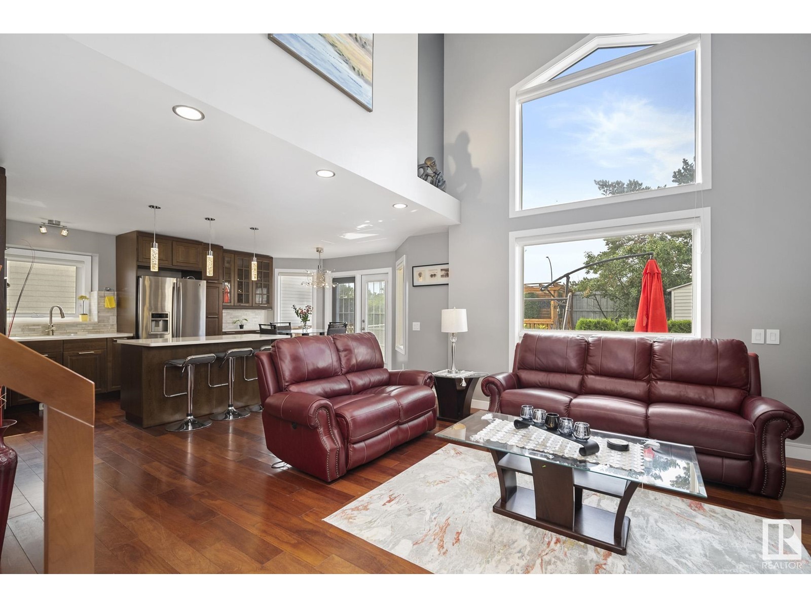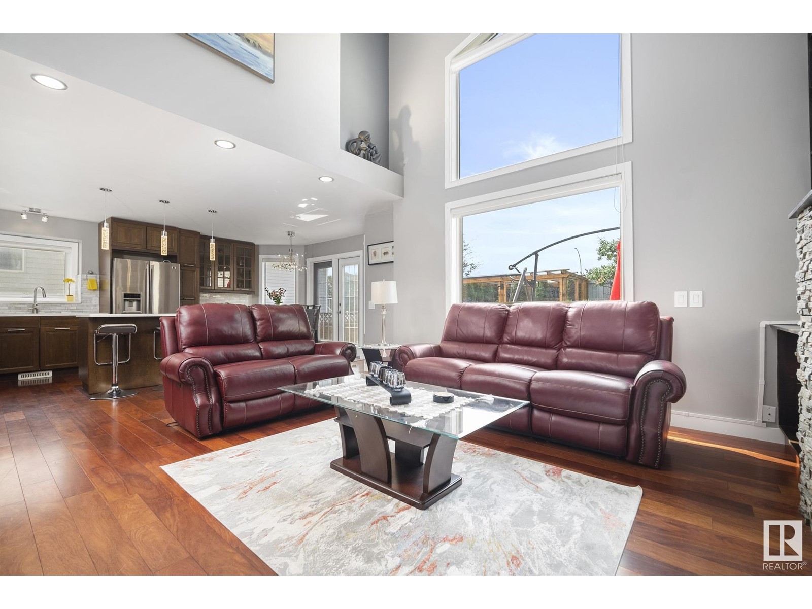 Stunning 2 storey home in Klarvatten. Incredible renos and in immaculate condition! Three bedrooms + one studio bedroom in basement, 2.5 bathrooms, 17' vaulted ceilings. The kitchen comes with gorgeous new maple cabinets, quartz countertops, marble backsplash tiles, and high-end stainless appliances including a double oven and gas range. Beautiful engineered hardwood floors, new doors, new ceilings, new glass railings, new baseboards, new window trims, new silhouette blinds, and paint. Completely new bathrooms with marble sinks, quartz countertops, paint, floors, faucets, toilets, tubs, and showers. Basement is a studio ideal for the growing teen with studio bedroom and gym! Notable upgrades, newer hot water tank, sump pump, and shingles. Double attached garage has polyaspartic coated floor. SOUTH facing backyard with pergola, interlocking bricks with firepit, fenced and landscaped. 2023 CENTRAL AC UNIT!! Amazing location nearby to: Parks, schools, walking paths, shopping, transit. (id:22211)